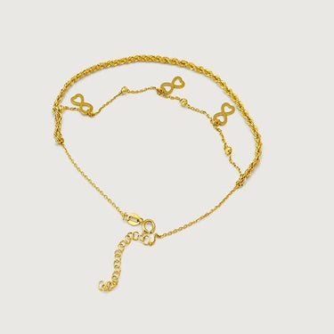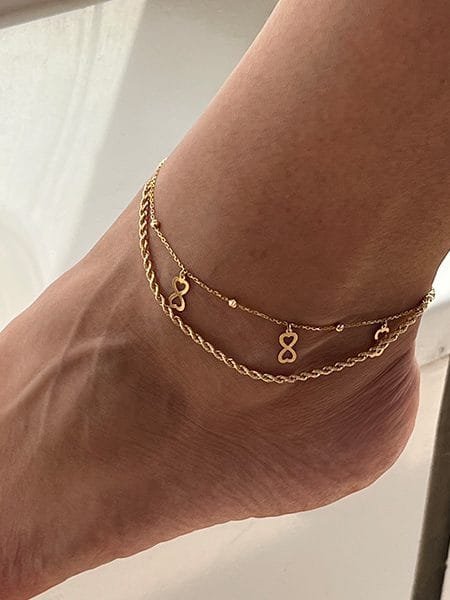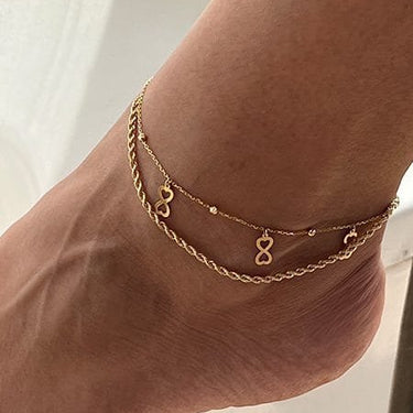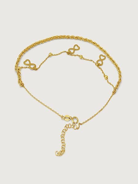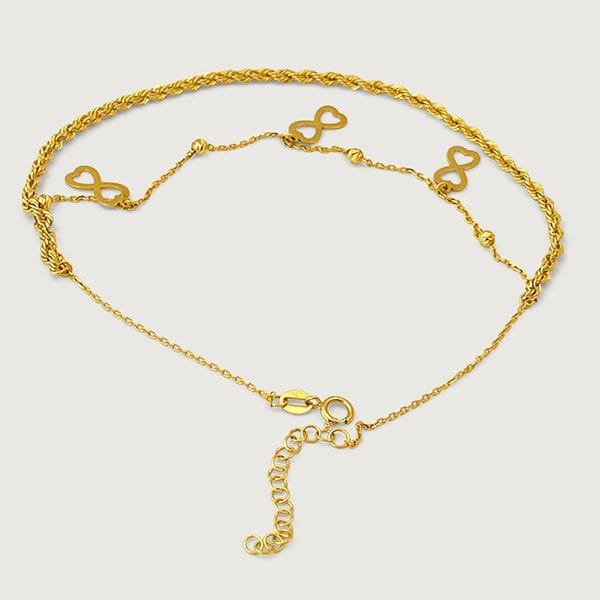 A timeless piece crafted in solid 18 karat yellow gold, this anklet is a seamless match with all of your favorite jewels and style. Featuring a Lobster clasp, three gold filled eight shapes delicately adorned on a gold chain and dangles elegantly around your ankle keeping you looking sophisticated no matter the occasion