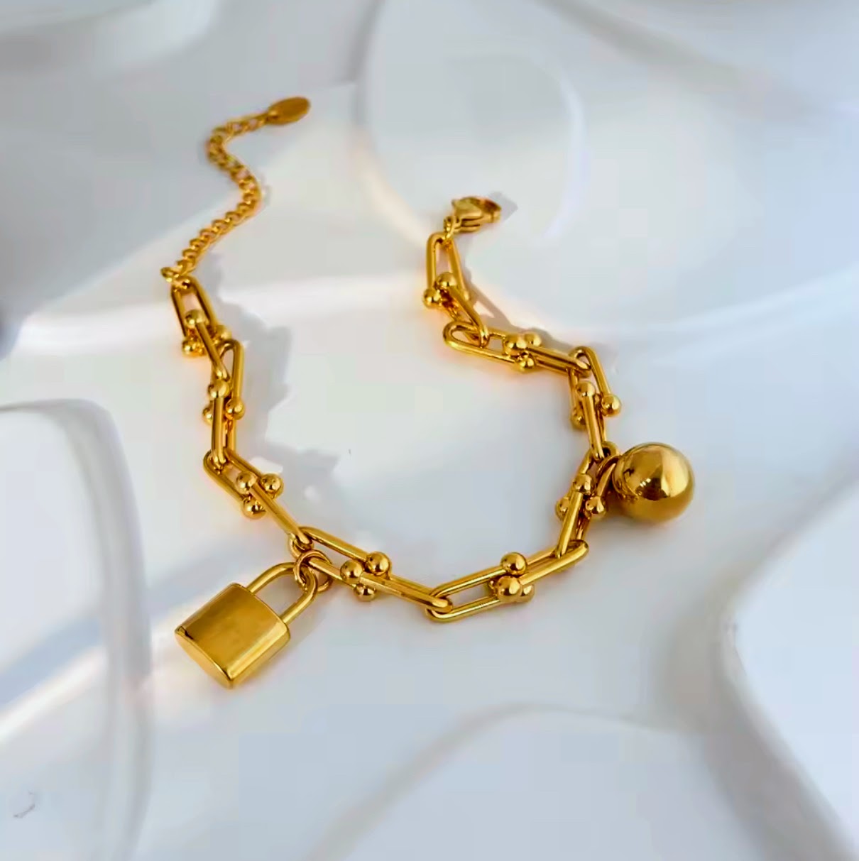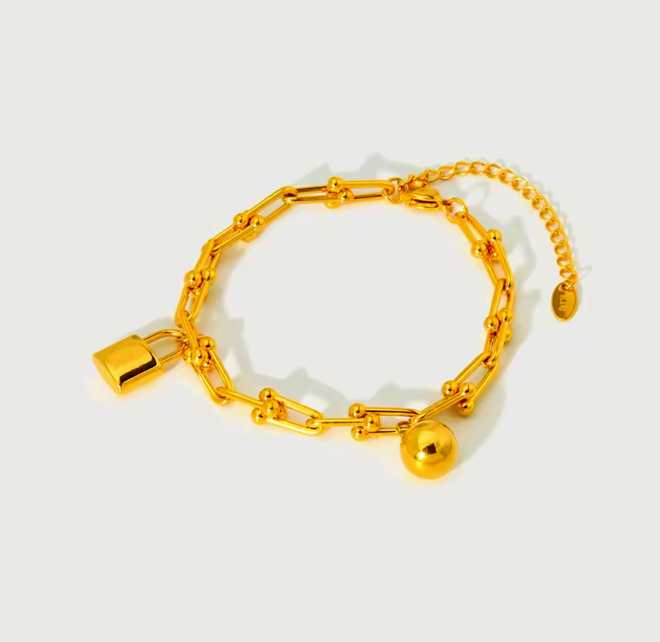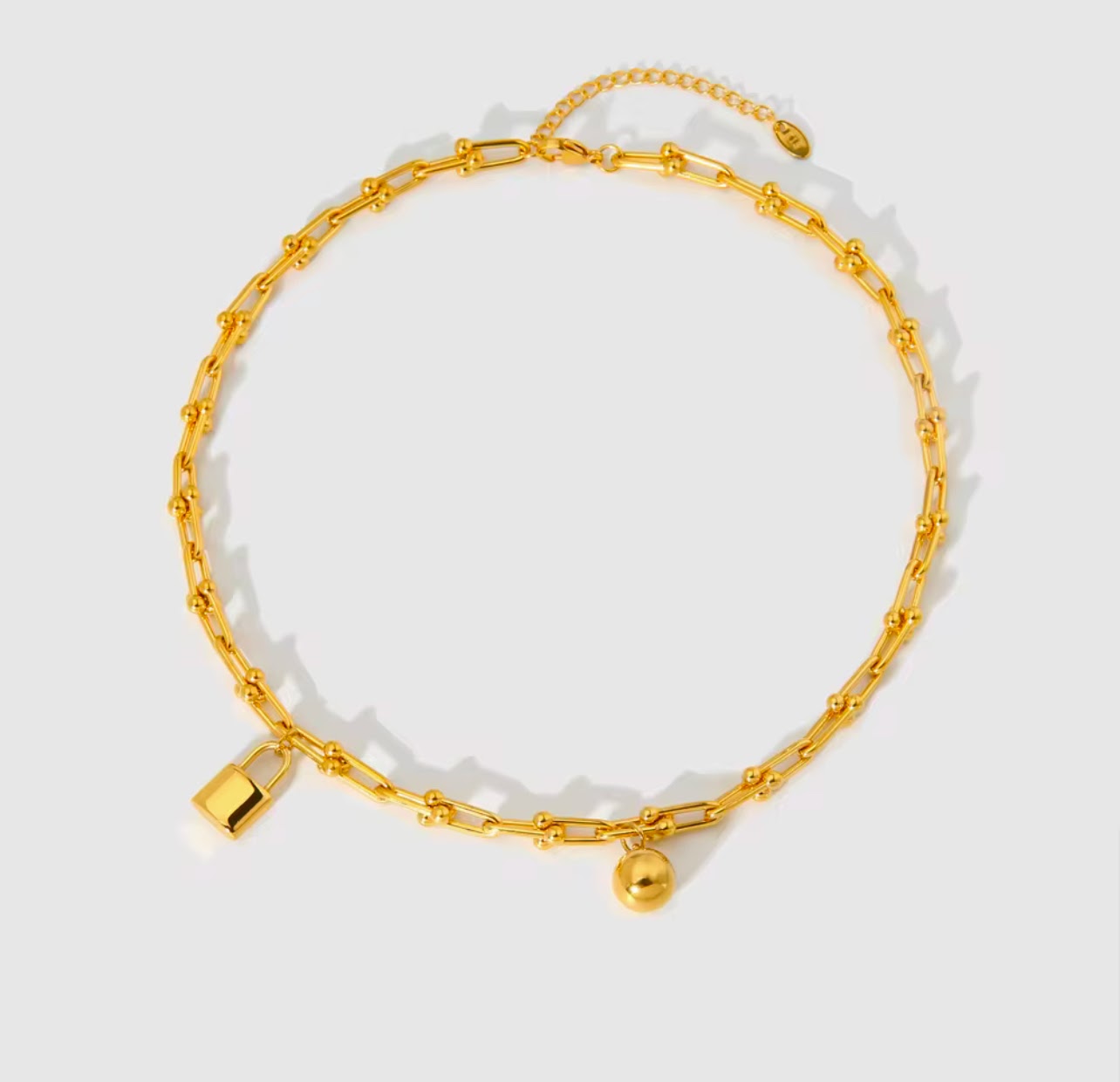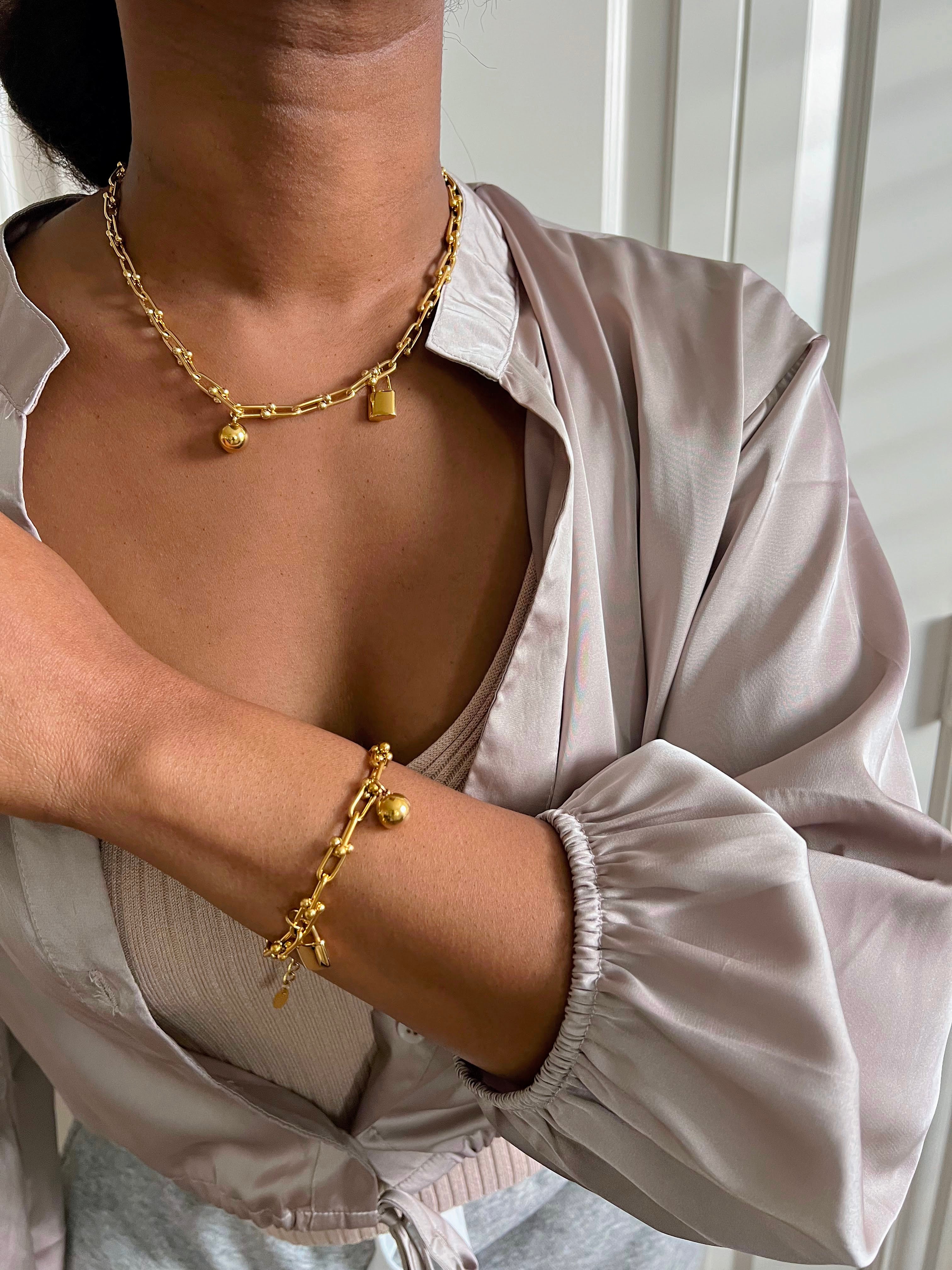 The Zara Necklace & Bracelet Set embodies timeless sophistication with a modern edge. Both pieces feature a unique U-shaped design, complemented by a striking horse kick buckle and lock head ball pendant, crafted from durable 18k gold-plated stainless steel. The necklace and bracelet, designed to capture the essence of equestrian style, offer a bold yet elegant statement, perfect for adding a touch of luxury to any ensemble. Whether worn together as a set or individually, these pieces exude charm and versatility, making them an essential addition to any jewelry collection.