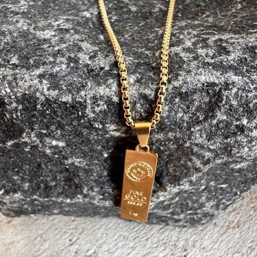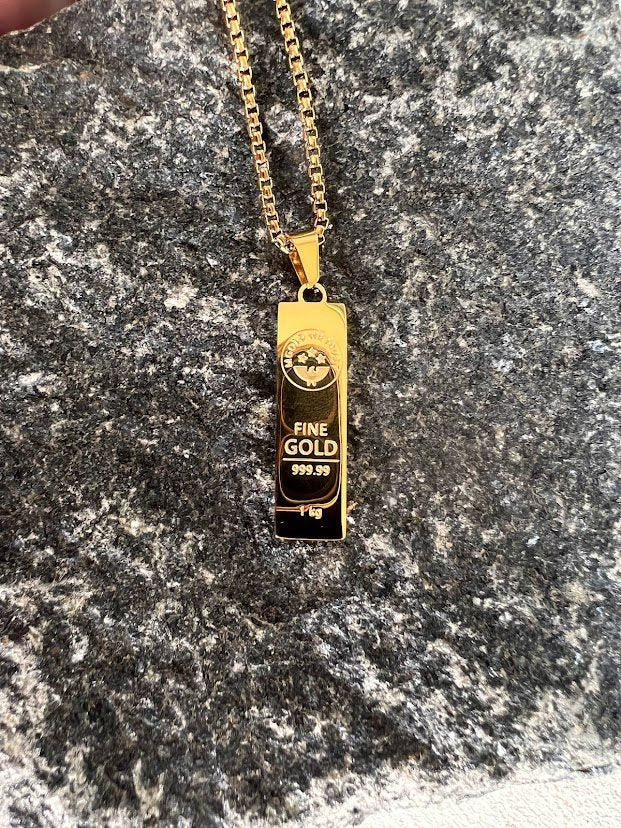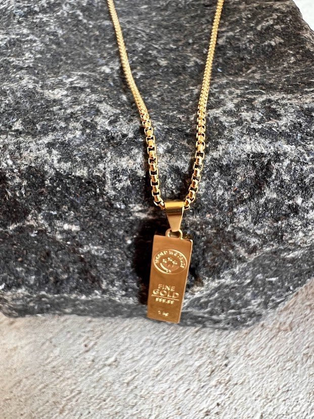 Featuring a stylish bar necklace design crafted with 18k gold plated on stainless steel. Simple and classic bar necklace. It gleams vertically around the neckline as it catches the light. Great to layer up or wear solo. This design makes a bold statement either way. So style it your way.