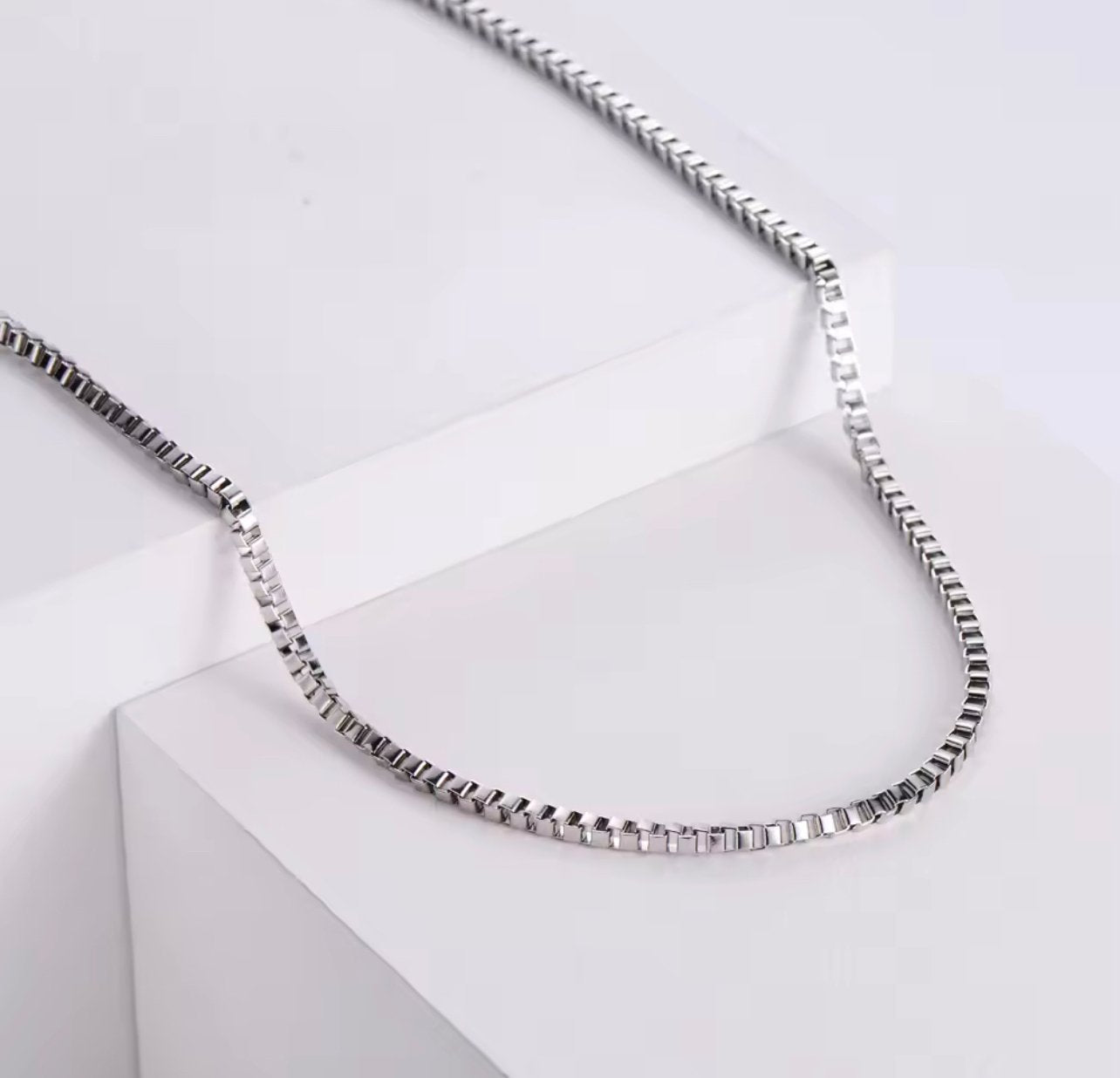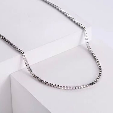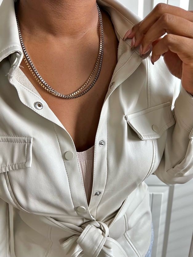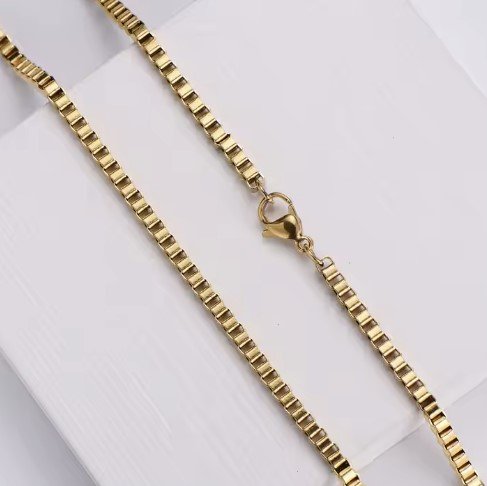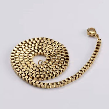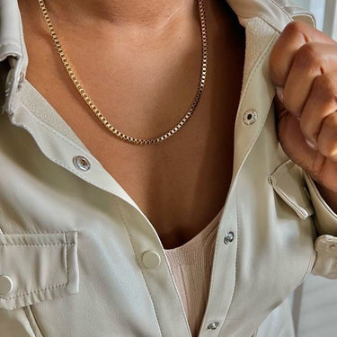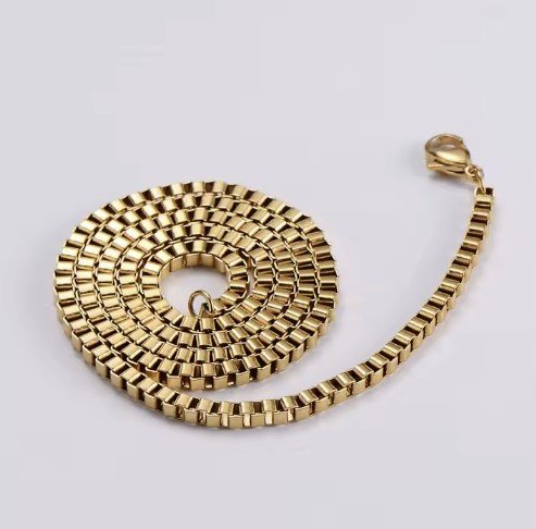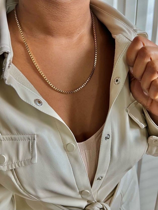 This Box Chain Necklace is a timeless staple that complements any style effortlessly. Crafted from durable stainless steel and plated in luxurious 18k gold, this box chain design offers a sleek, structured look that’s perfect for layering or wearing solo. Its clean lines and polished finish bring a touch of elegance to both casual and formal outfits, making it a versatile piece for everyday wear. This necklace is a must-have addition to any jewelry collection, offering both style and durability in one. Available in Silver and Gold.