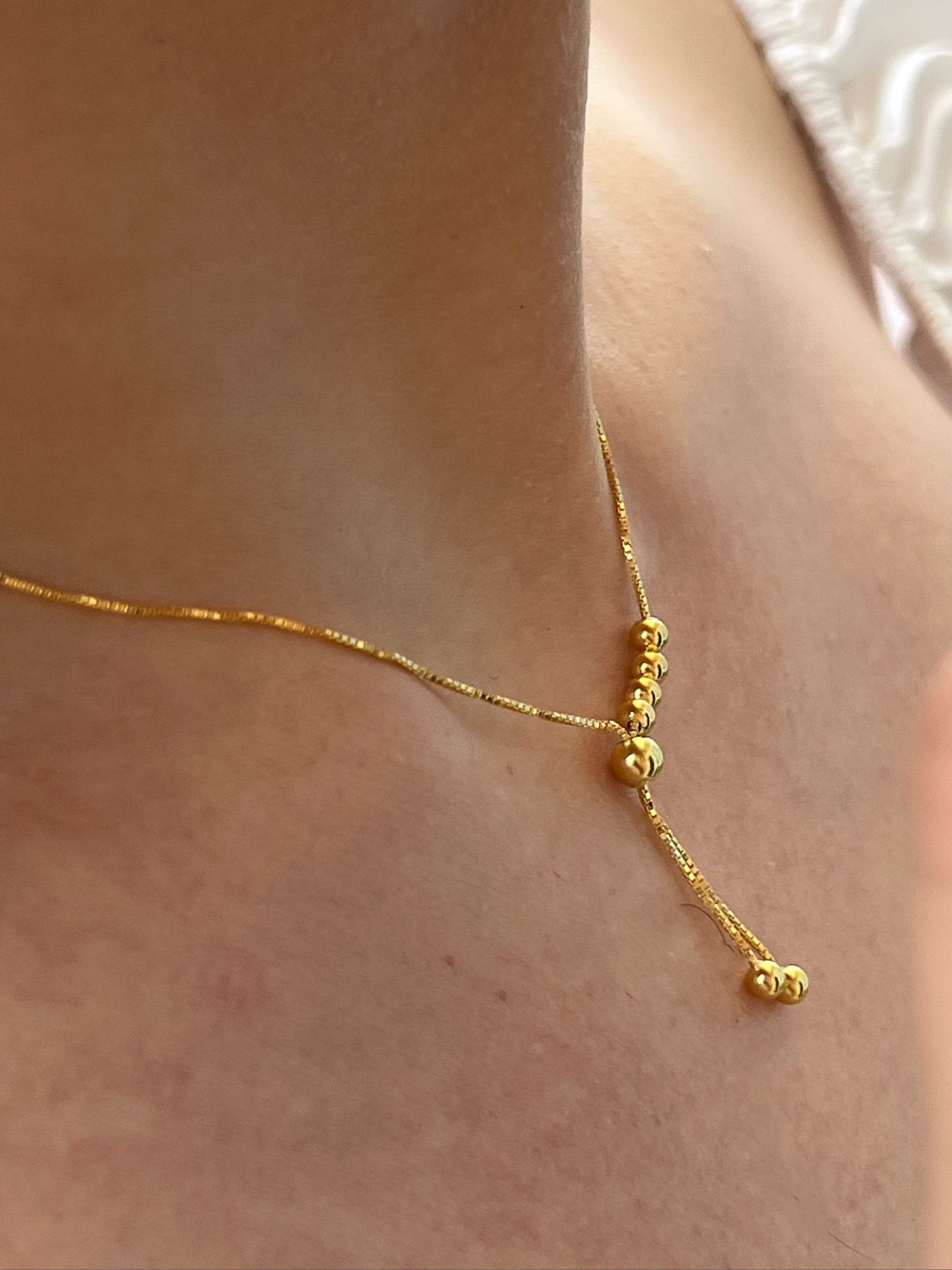 Add a little extra texture to your layering game with our Marga Beaded Choker Necklace. This necklace has some luminous beads scattered along the chest drop line of this delicate chain. Can be worn as a choker or adjust length using the slider bead. Wear alone, or add to your neck stack. This necklace is a definition of elegance at its finest.