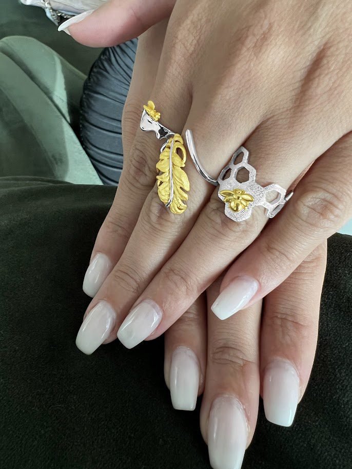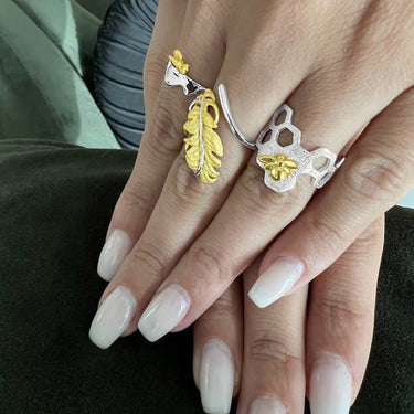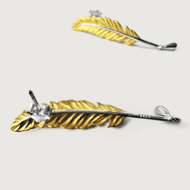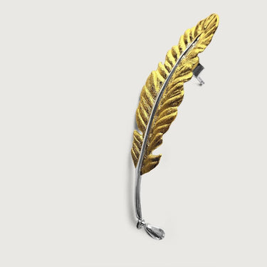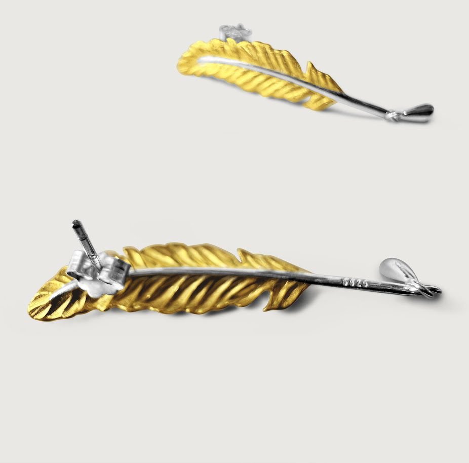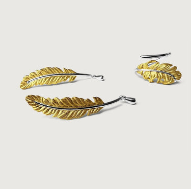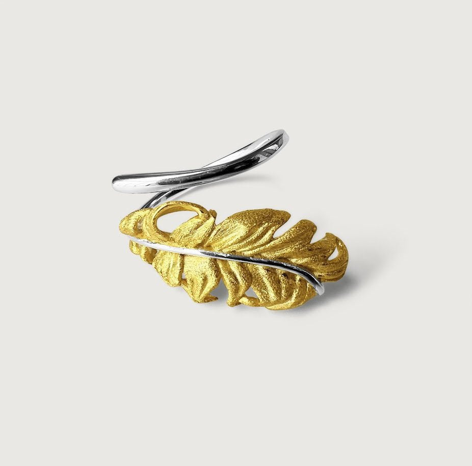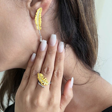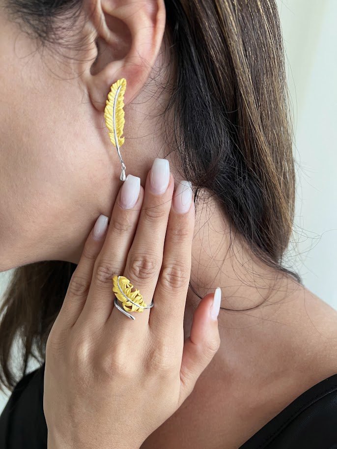 Inspired by the natural world, this unique earring and ring set are designed to capture the feather of a goose in two tones- yellow and silver, therefore it’s plated with 18k gold on sterling silver. They feature a contrast of high polish and brush finishes which will make you stand out for sure. The ring can be adjusted to find a suitable fit. Its unique design speaks volumes about your personality and style. So, expect and enjoy all the compliments when wearing.
