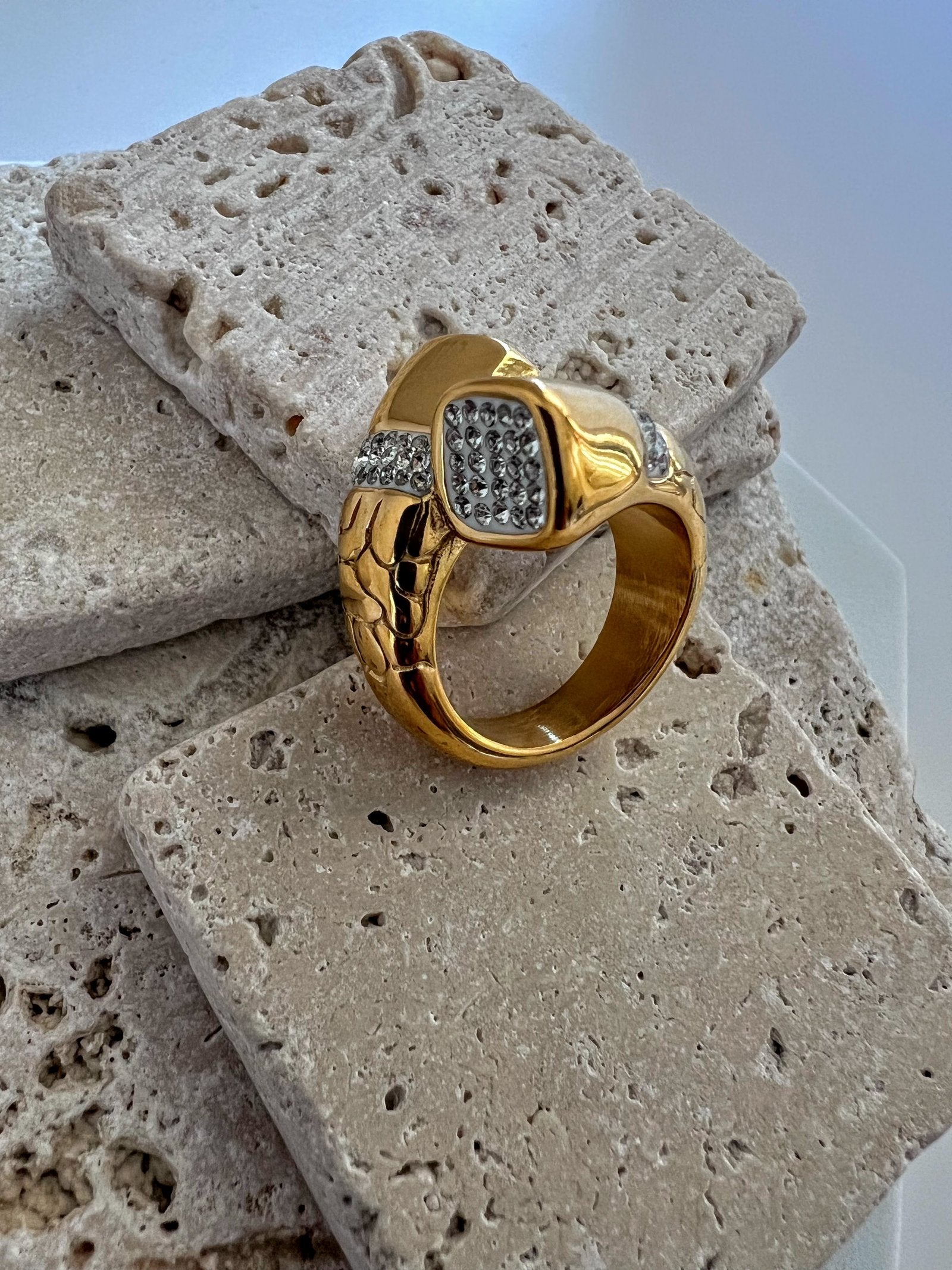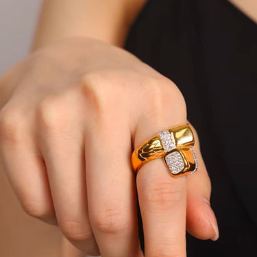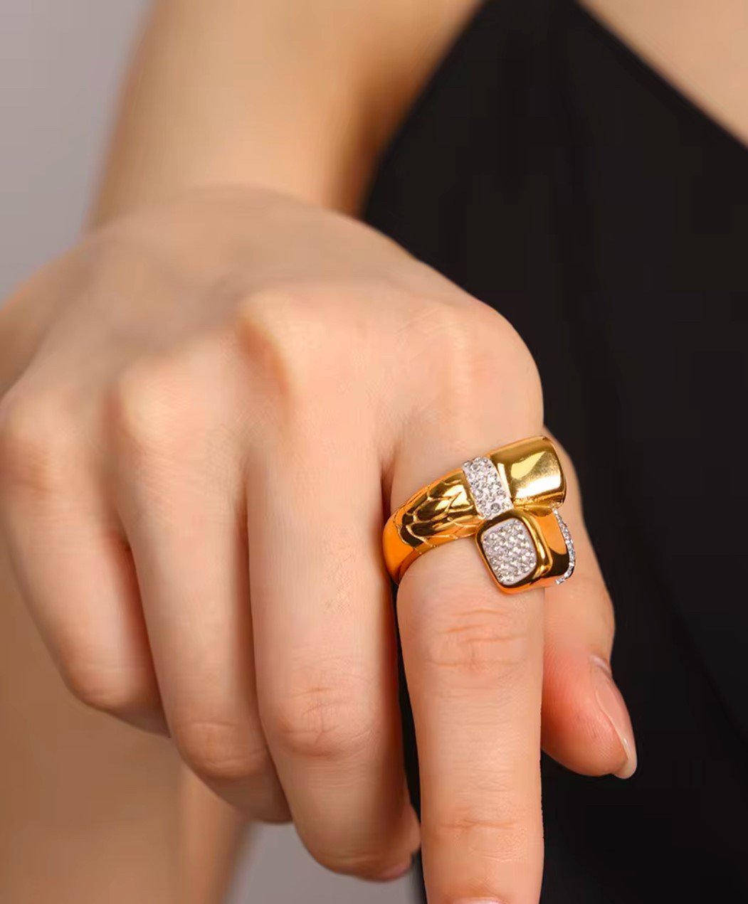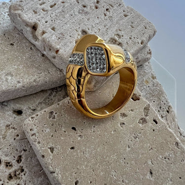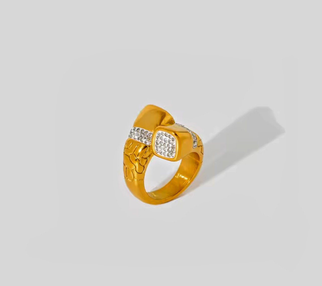 Features a Prisma Textured Square Ring that blends bold geometric design with rugged sophistication. Crafted from durable titanium steel and plated with luxurious gold, this ring features an irregular textured surface that adds depth and character to its sleek square shape. The prismatic design creates a dynamic look, making it a standout piece in any jewelry collection. With its modern aesthetic and high-quality stainless steel construction, this ring offers both style and strength for those who appreciate unique, statement-making accessories.