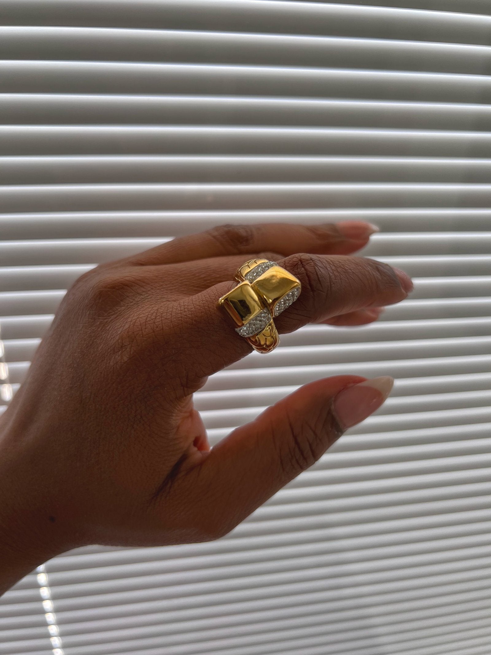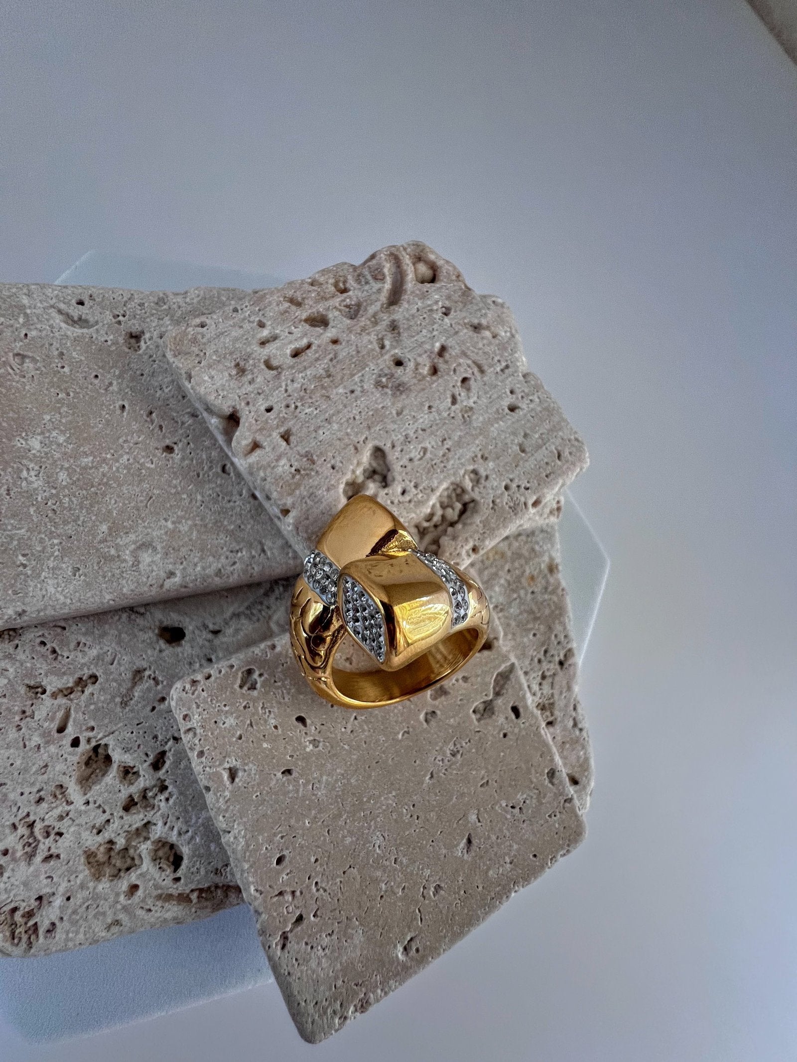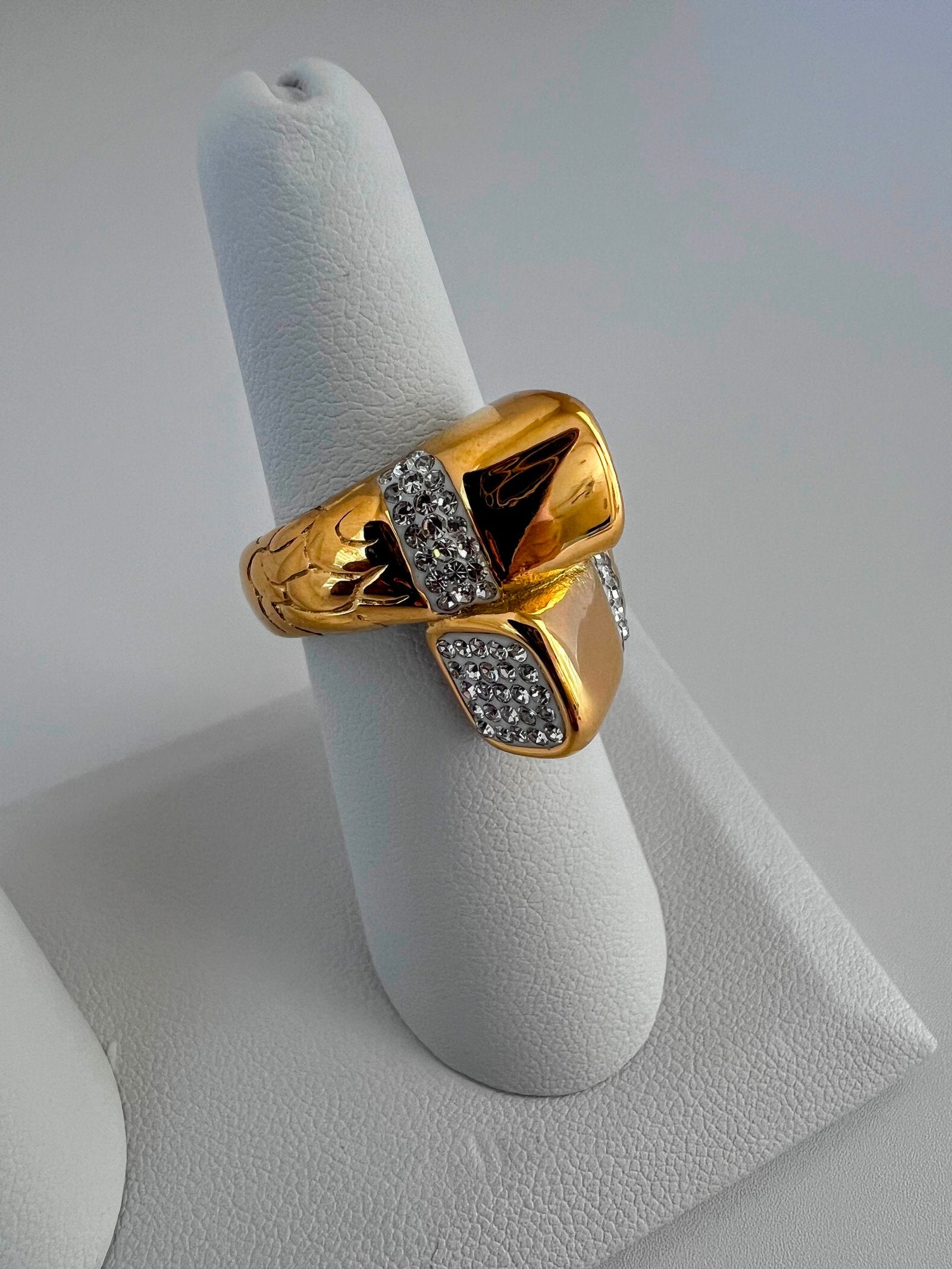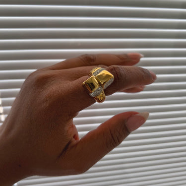 Features a Prisma Textured Square Ring that blends bold geometric design with rugged sophistication. Crafted from durable titanium steel and plated with luxurious gold, this ring features an irregular textured surface that adds depth and character to its sleek square shape. The prismatic design creates a dynamic look, making it a standout piece in any jewelry collection. With its modern aesthetic and high-quality stainless steel construction, this ring offers both style and strength for those who appreciate unique, statement-making accessories.
