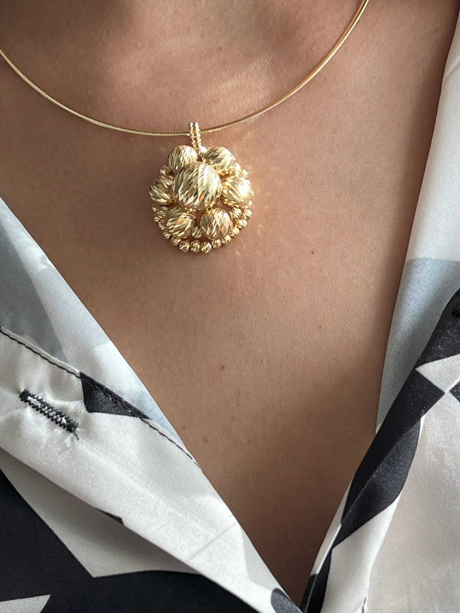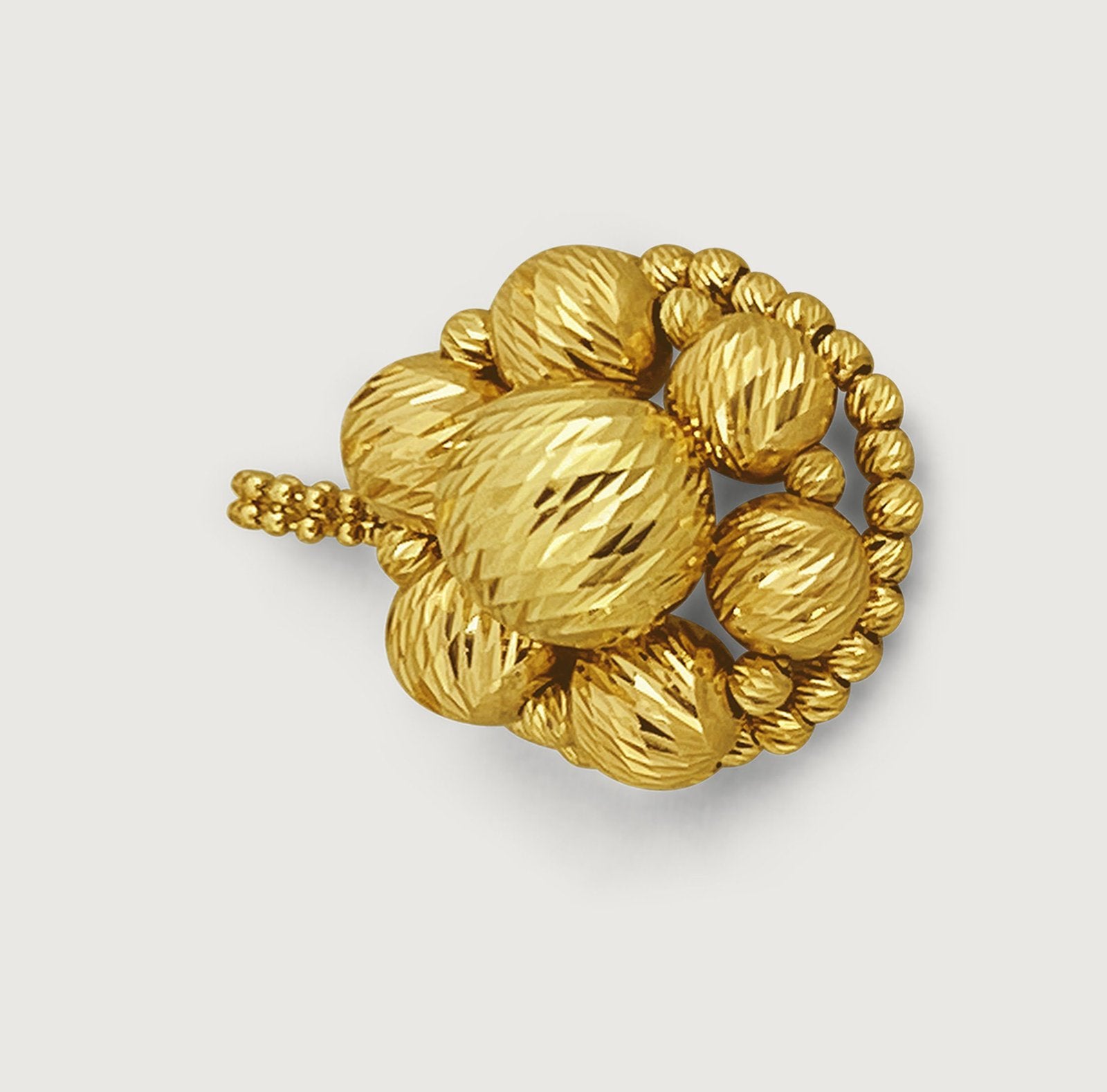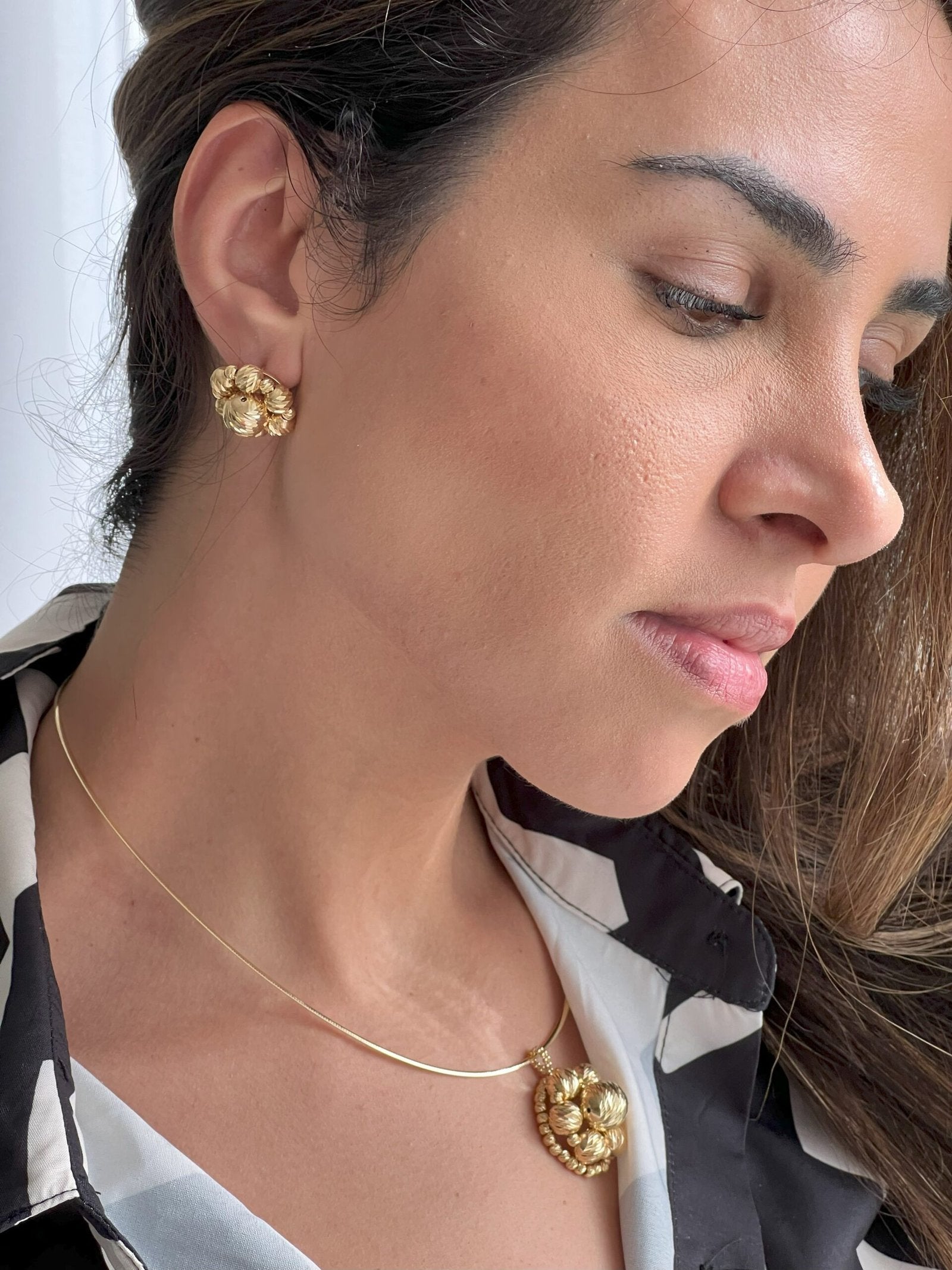 Enhance your elegance with this stunning 18 karat solid gold earrings and pendant set. Each piece is meticulously crafted, featuring a unique textured design that radiates sophistication. The earrings showcase a cluster of lustrous gold spheres, while the matching pendant echoes this exquisite pattern, making this set a perfect choice for occasions or adding a touch of luxury to your everyday style. Please note: set does not include a chain.