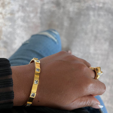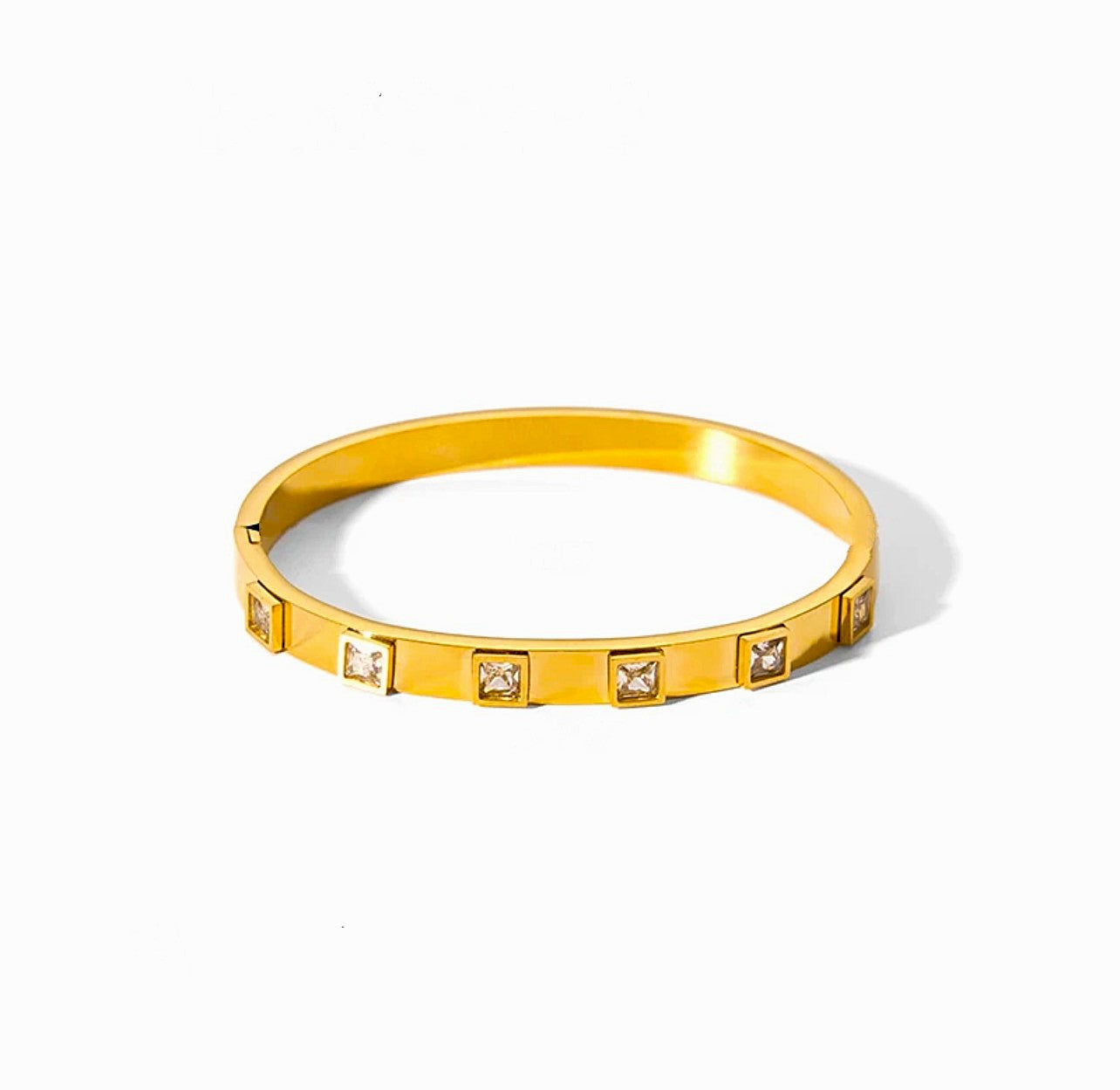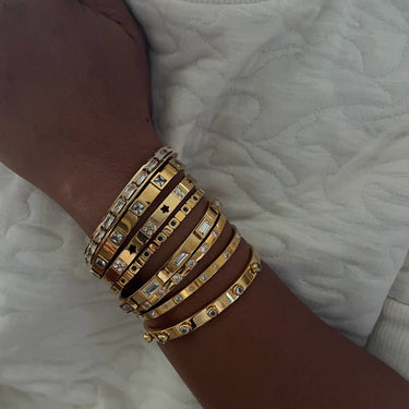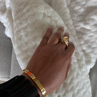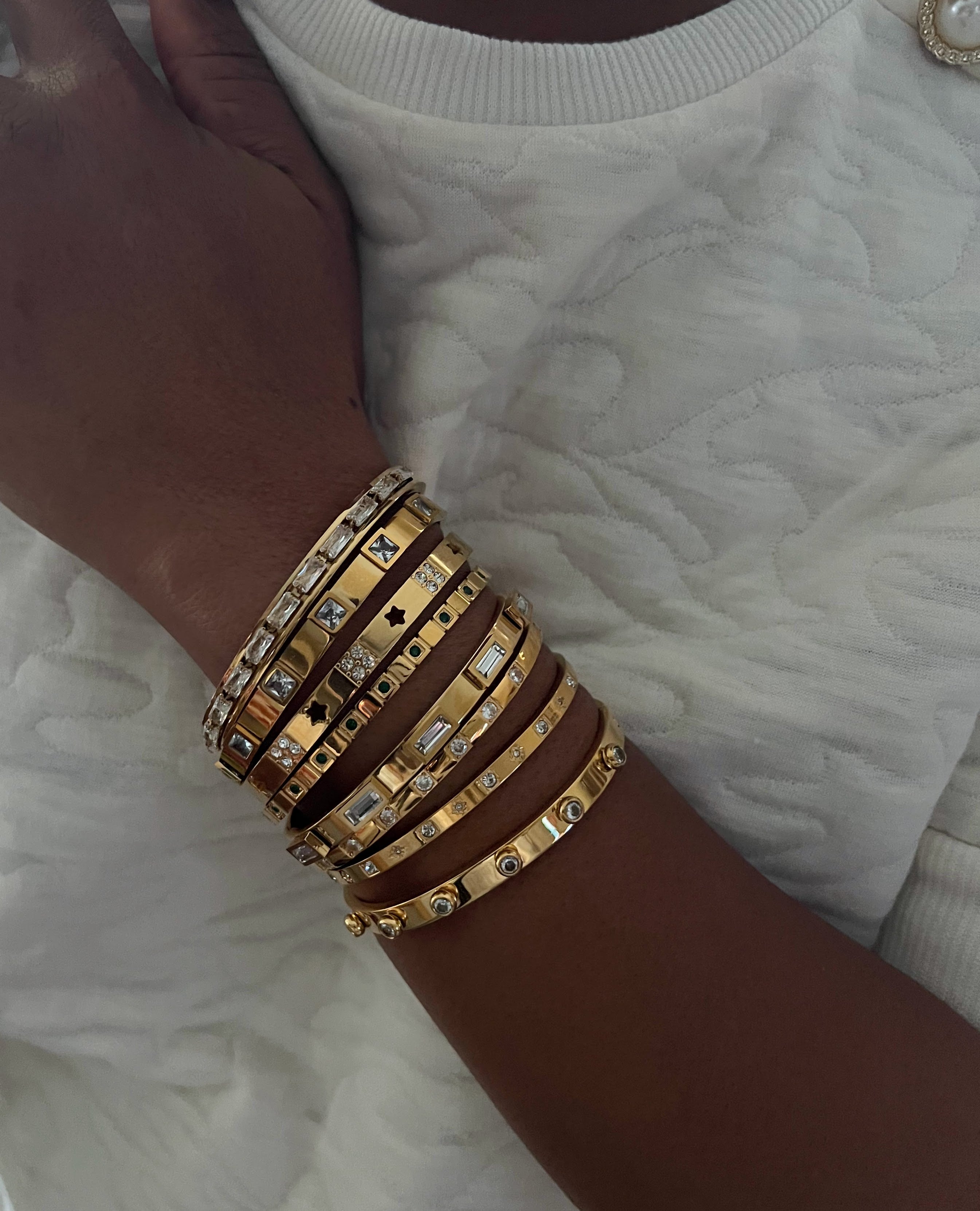 This enchanting bangle features hollow stars with clusters of four zirconia stones placed between each star. A whimsical and celestial design, it’s available in gold-plated finish, making it perfect for adding a touch of magic to your look.
