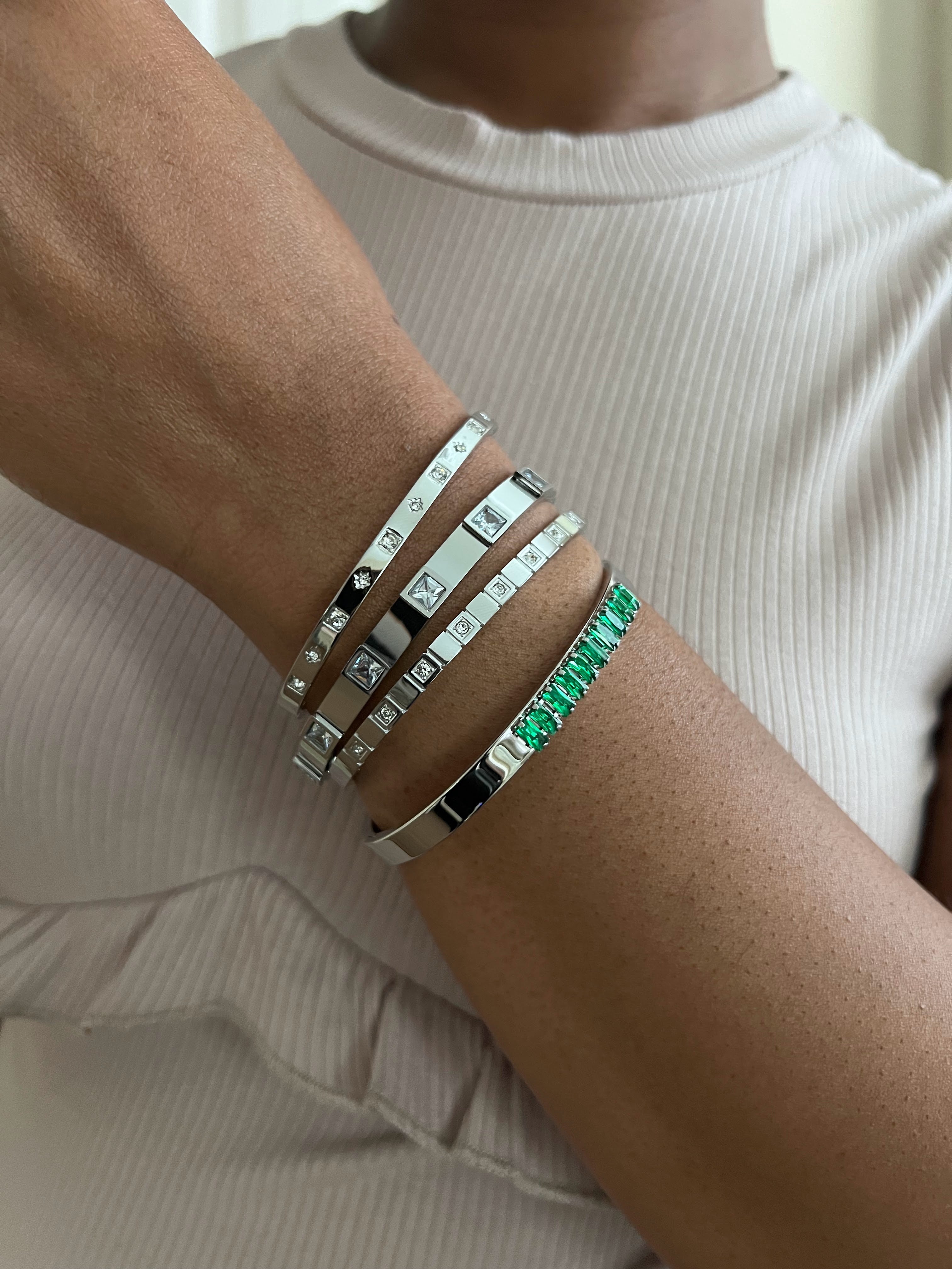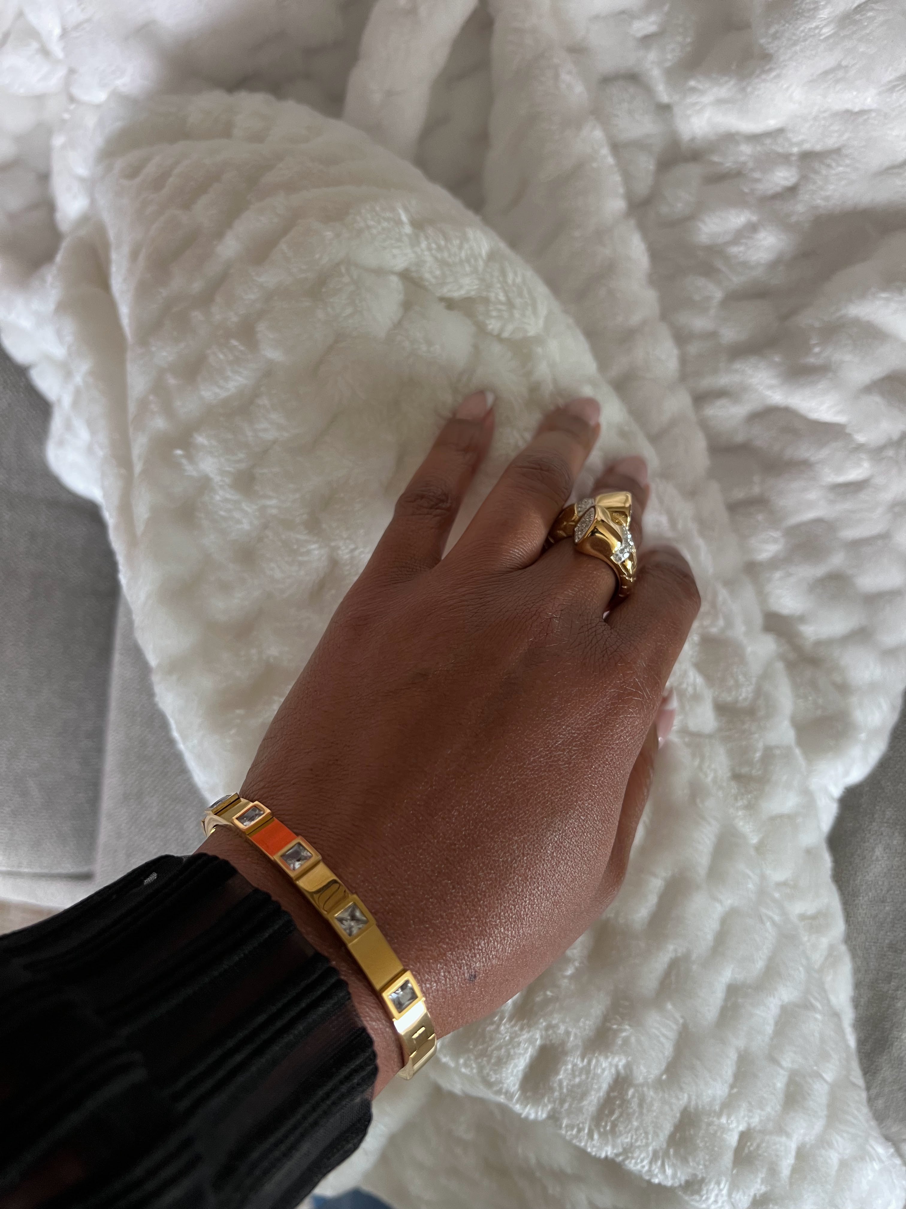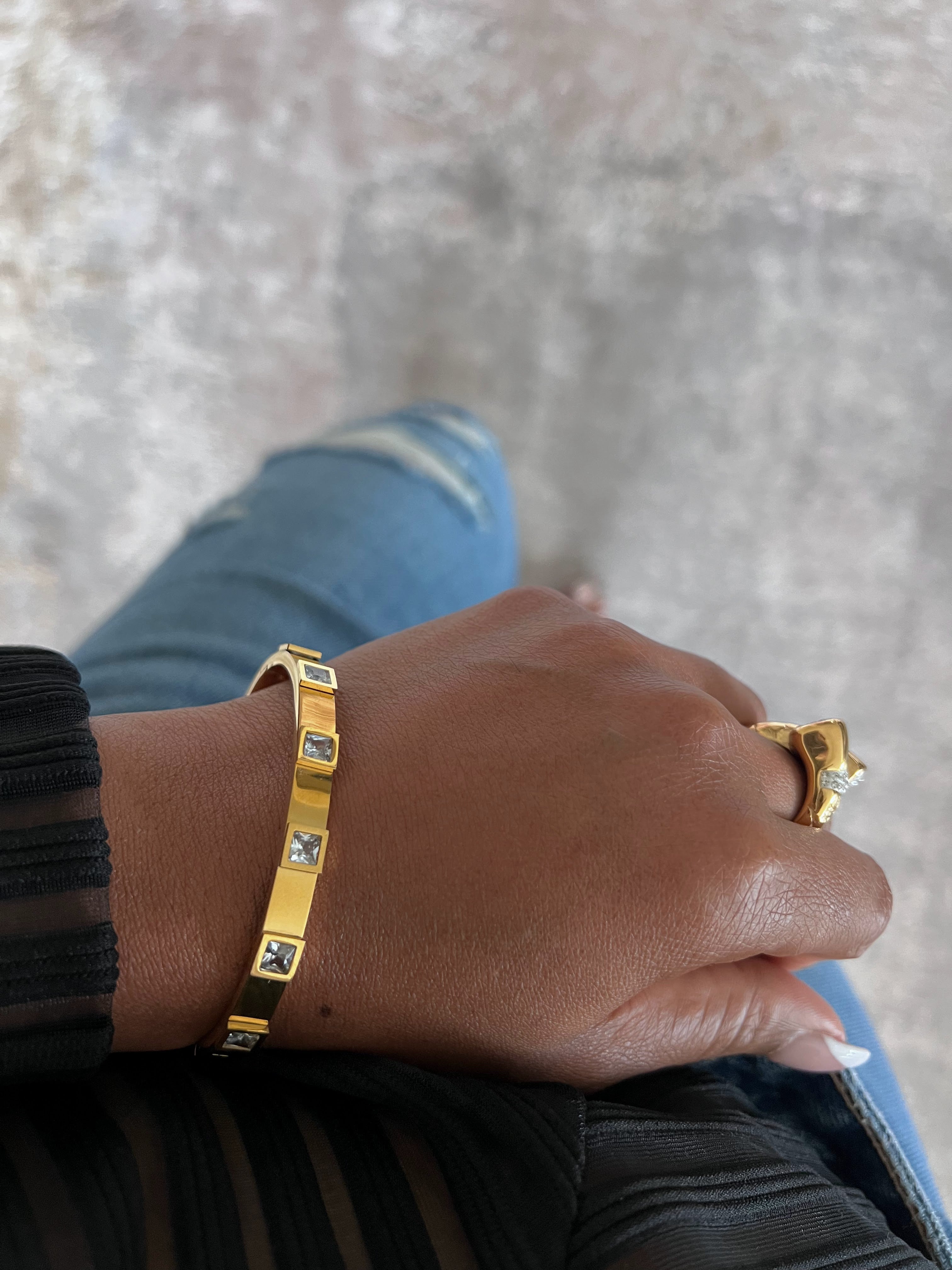 This enchanting bangle features hollow stars with clusters of four zirconia stones placed between each star. A whimsical and celestial design, it’s available in gold-plated finish, making it perfect for adding a touch of magic to your look.