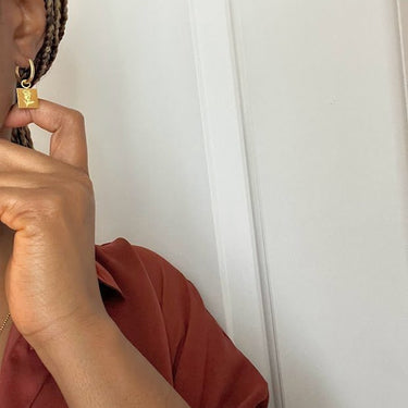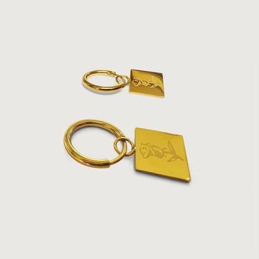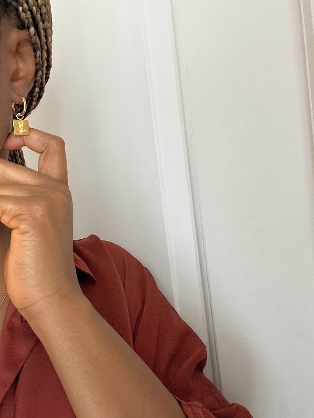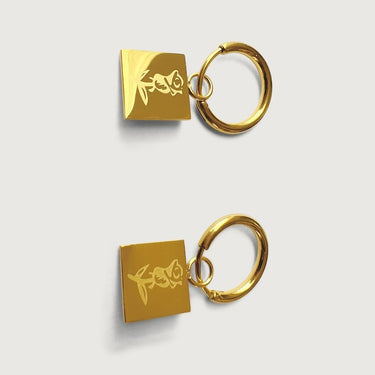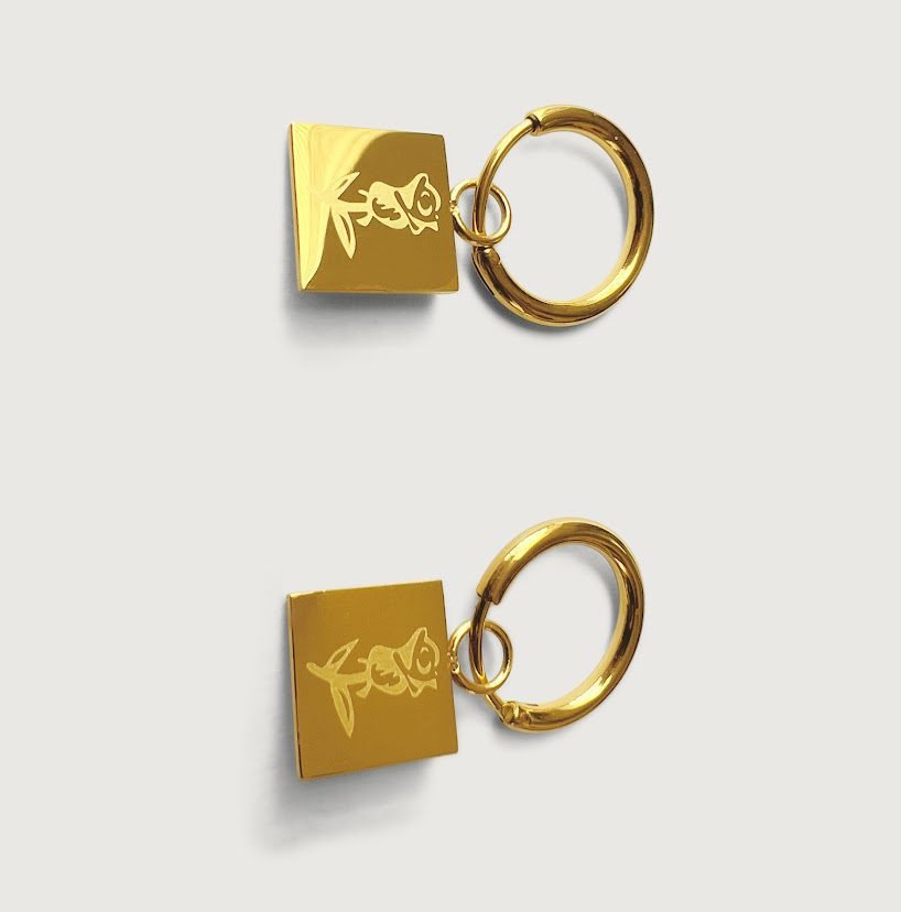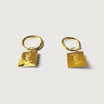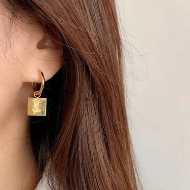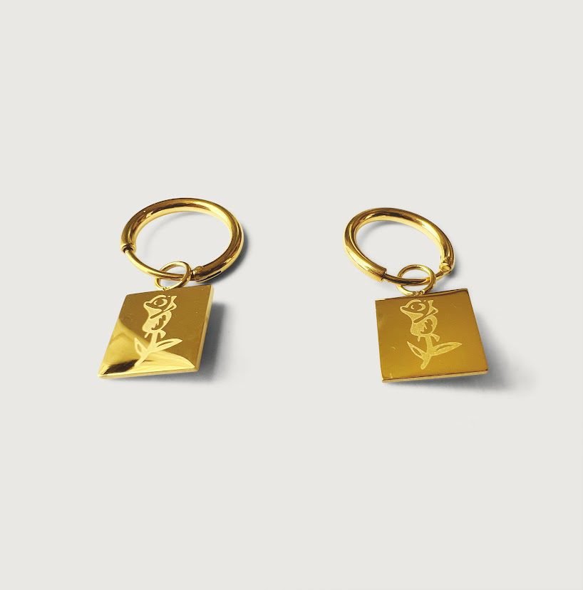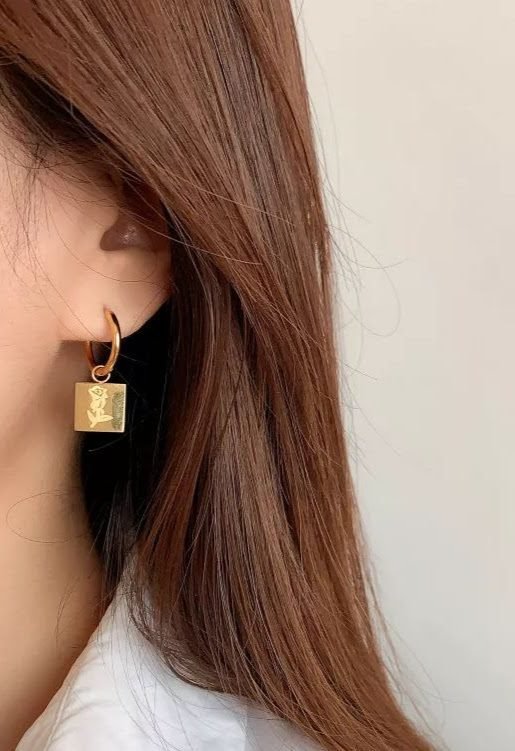 Unique, sweet and versatile, these dainty hoops are a fun look she’ll love. Crafted in stainless steel and plated with 14K vermeil to give it high shine to radiate your style and catch the light throughout your day, each hoop earring features a flat faced square charm engraved with the iconic rose flower which dangles playfully below.