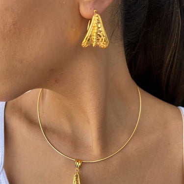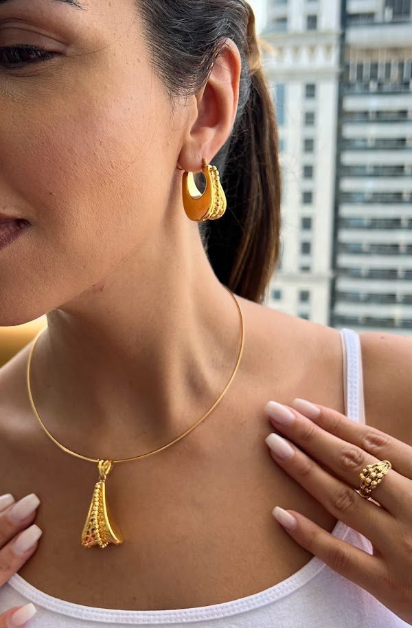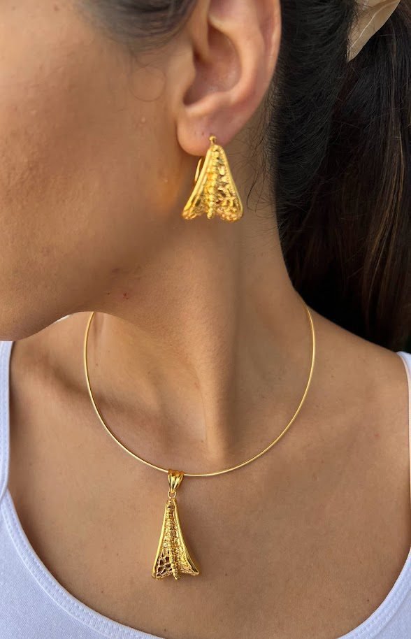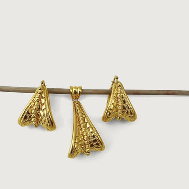 One of our bold gold collections, crafted in solid 18k gold, these wow-worthy earrings and pendant set features a puffed design of polished lustrous gold for that sophisticated luxury style.