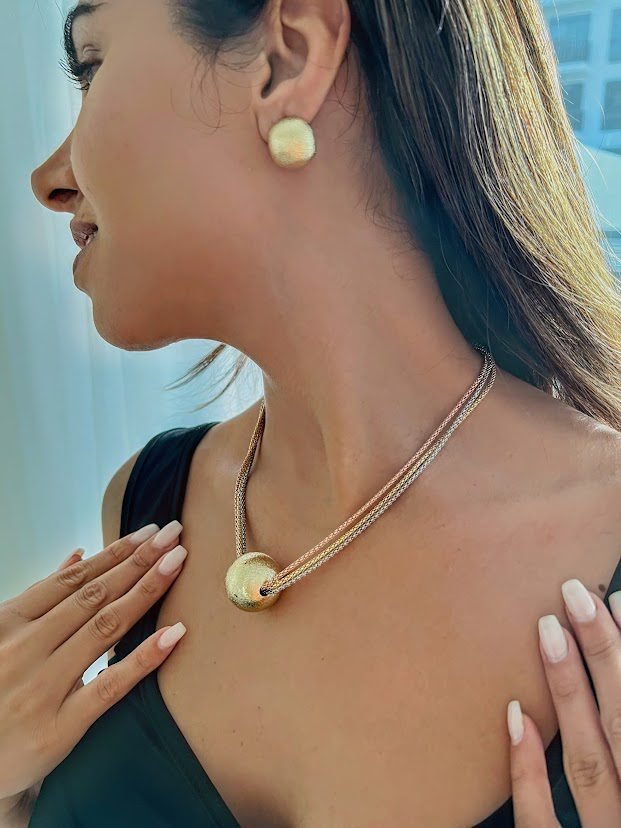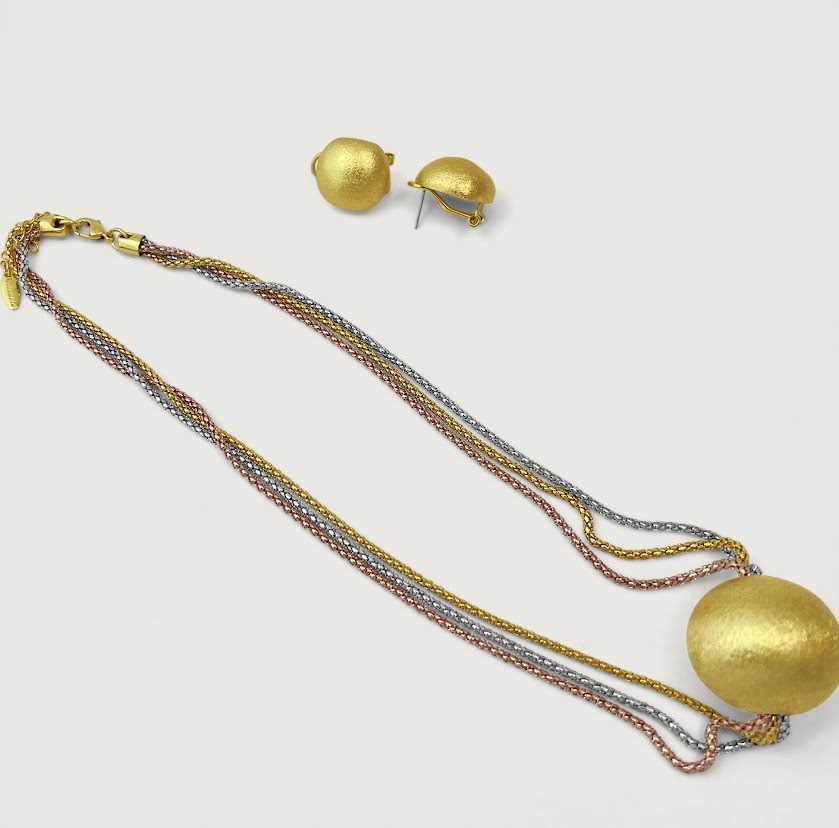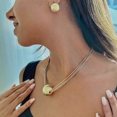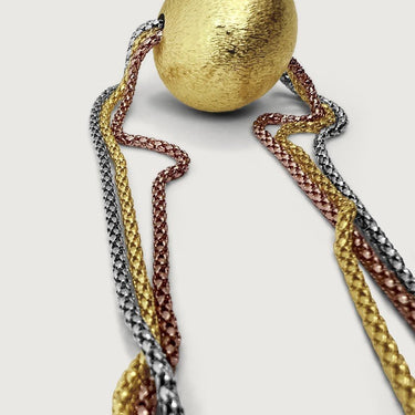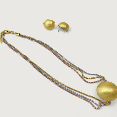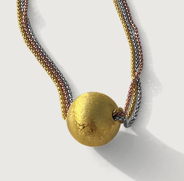Featuring a round pendant anchored on a three tone necklace that shimmers against the skin. This delicate necklace is sprinkled with rich sparkles resulting in a modern design with high shine and elegant luster. This is sure to bring out the bling in you.