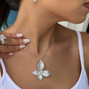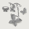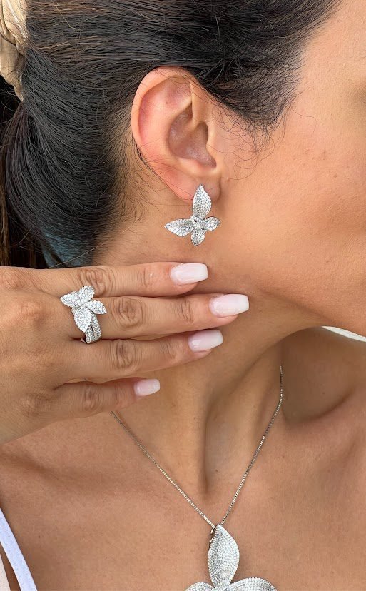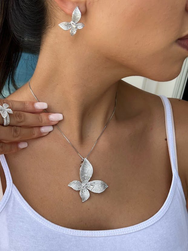 Scintillating Zircons illuminates this sleek jewelry set (ring, earrings, pendant with chain). As multifaceted as it is iconic, this Butterfly set is a tangible reminder of the connections we feel but can’t always see. This unique set is sure to catch the light and bright out the bling side of you.