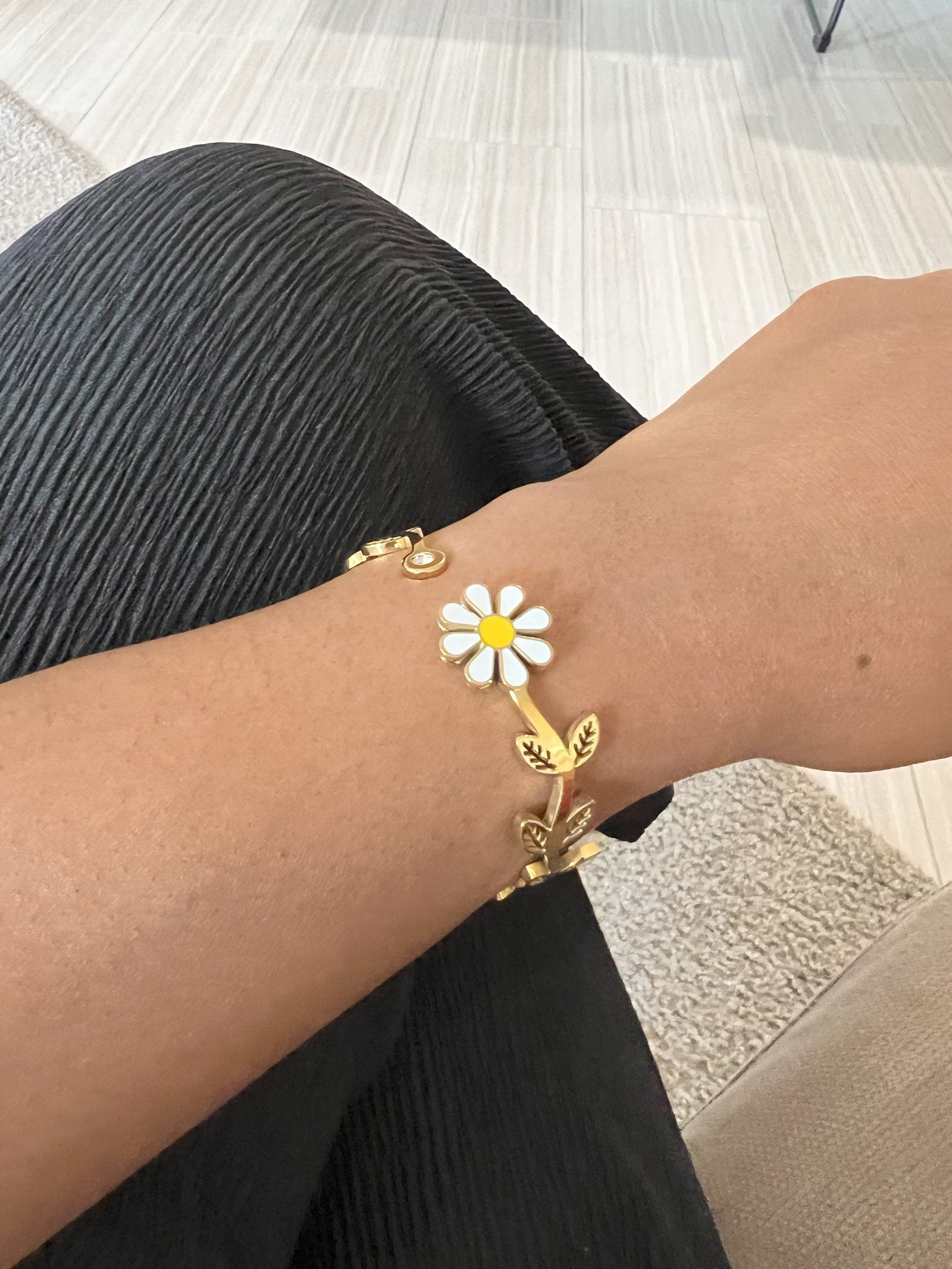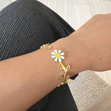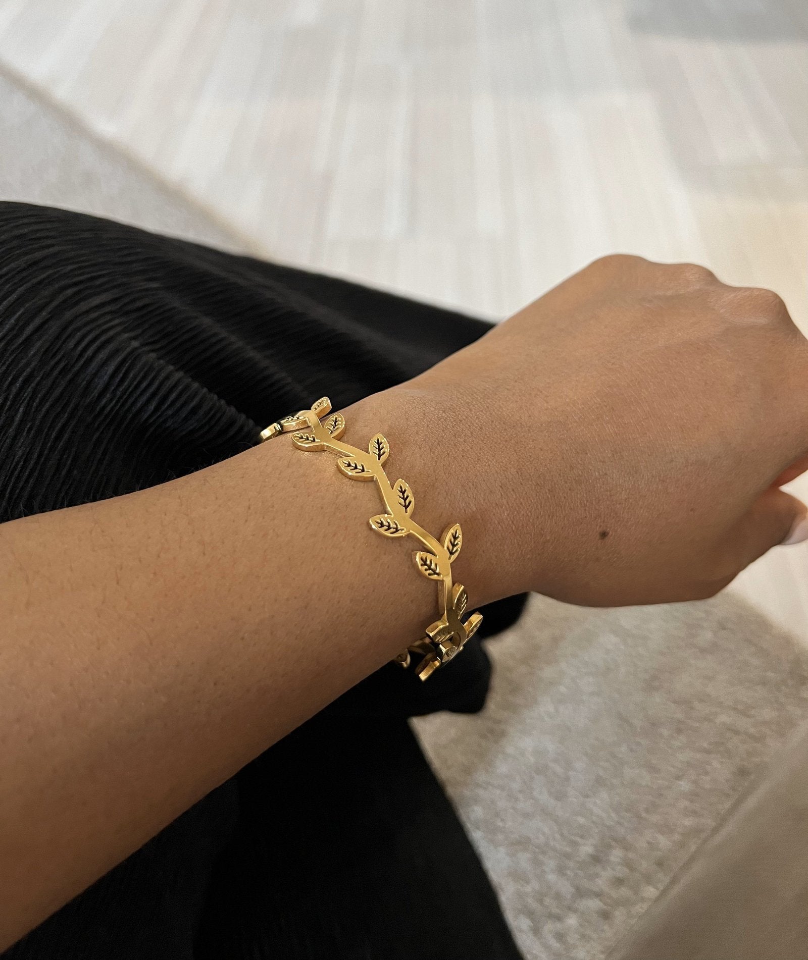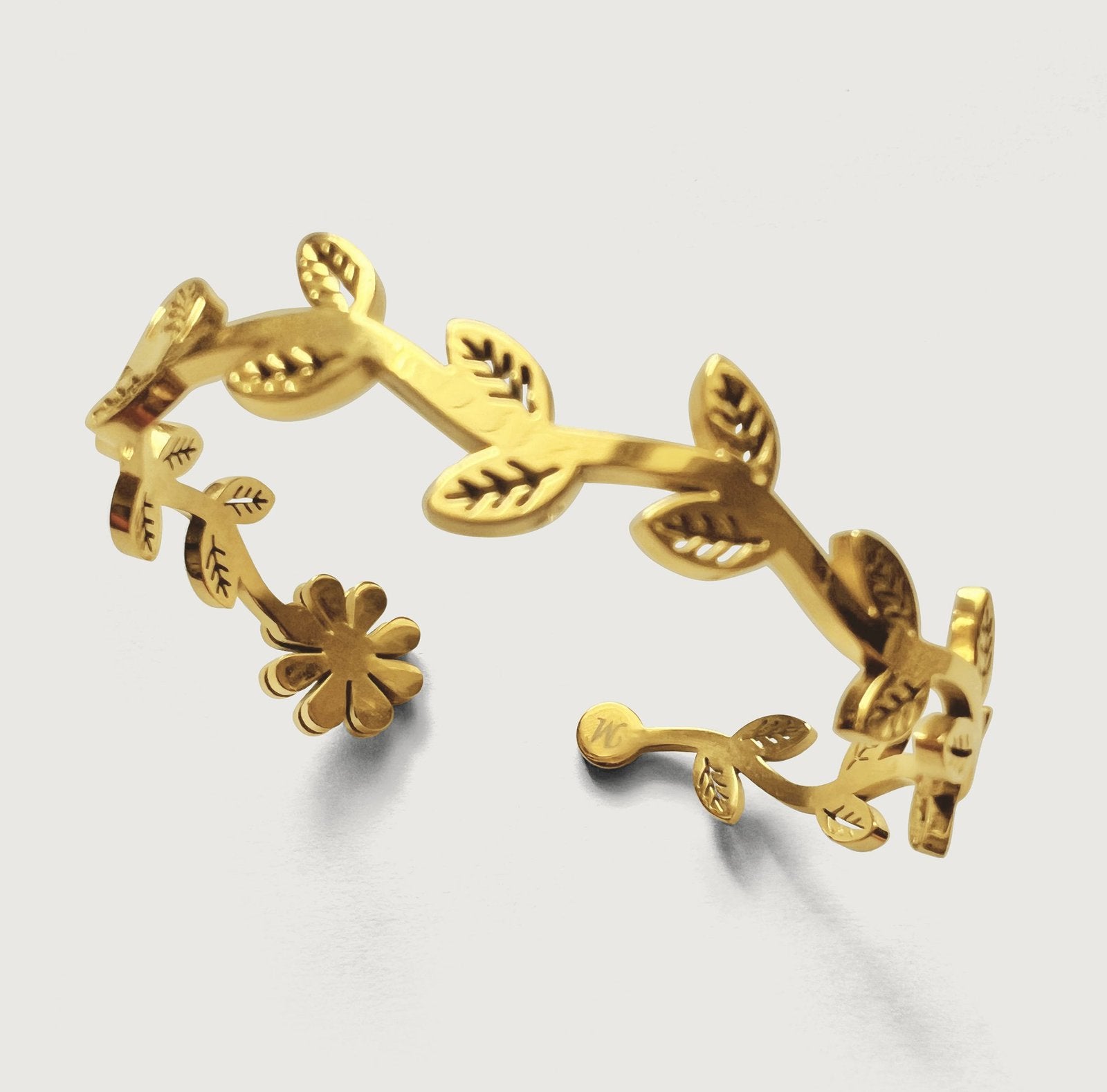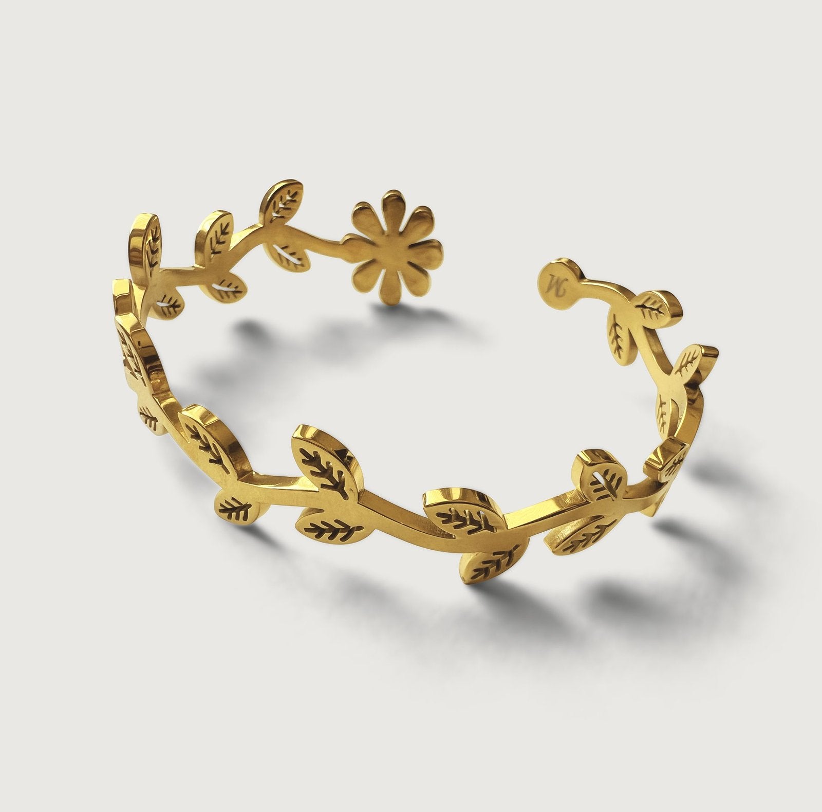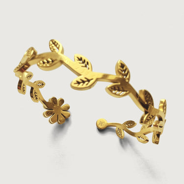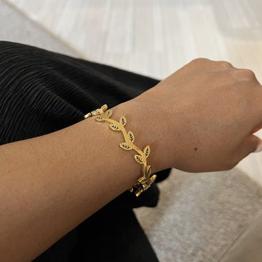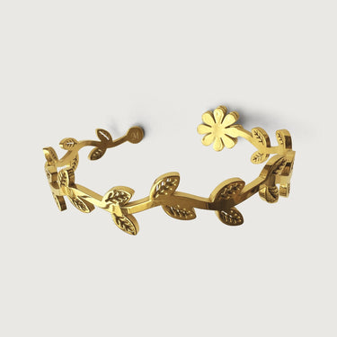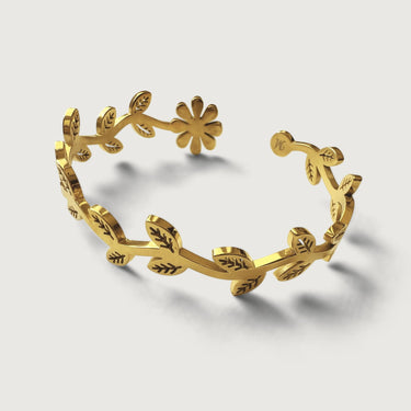 Design captures the fluid movement of flowers, vines and leaves on a branch. This gorgeous hinged bangle is crafted with 18k gold plated on stainless steel with high polish finishes that catches the light and brings out the shine in you. Wear this bangle alone or stack like a dream.