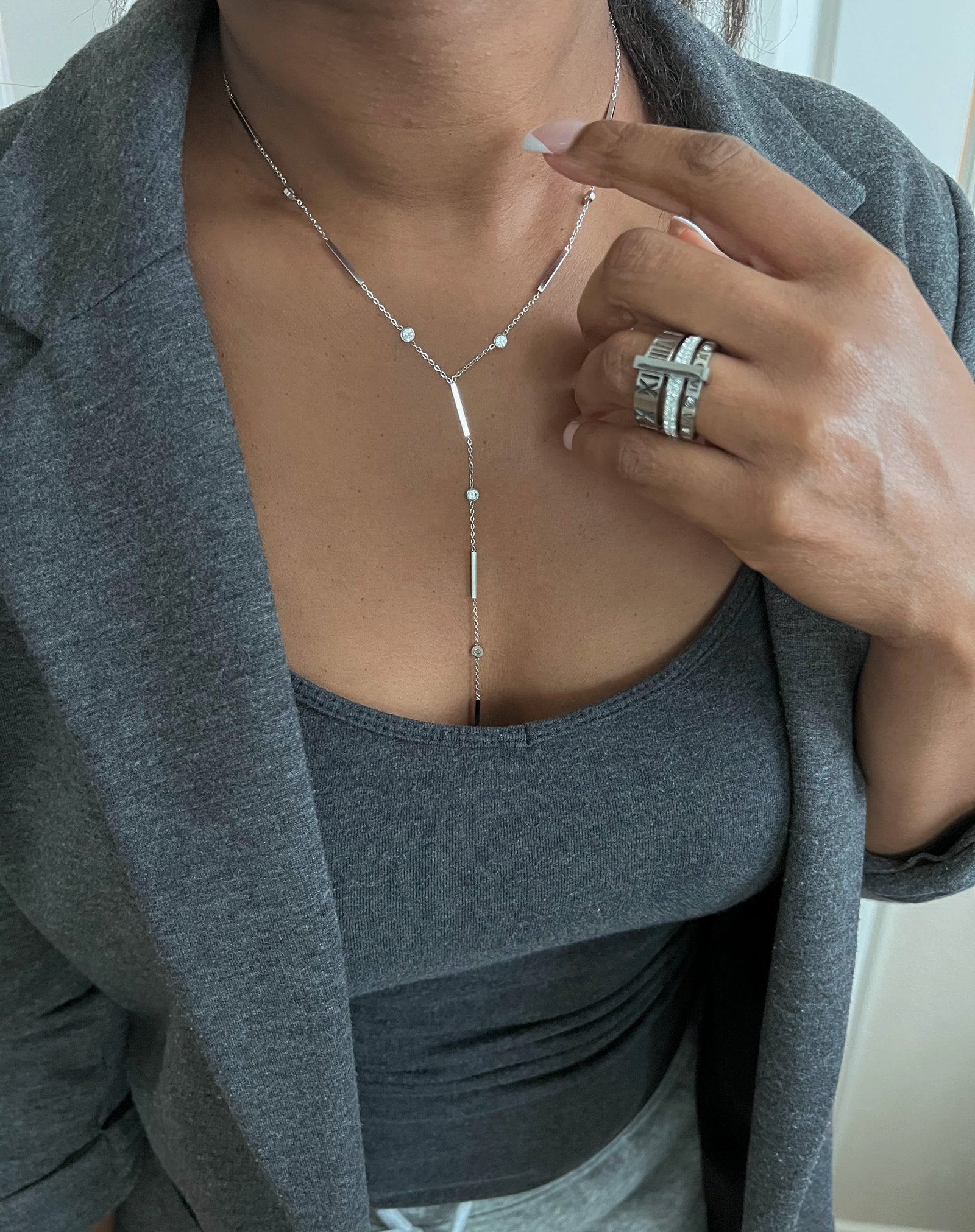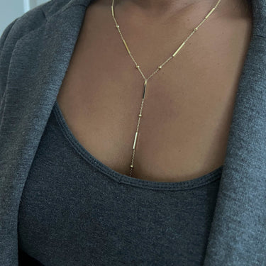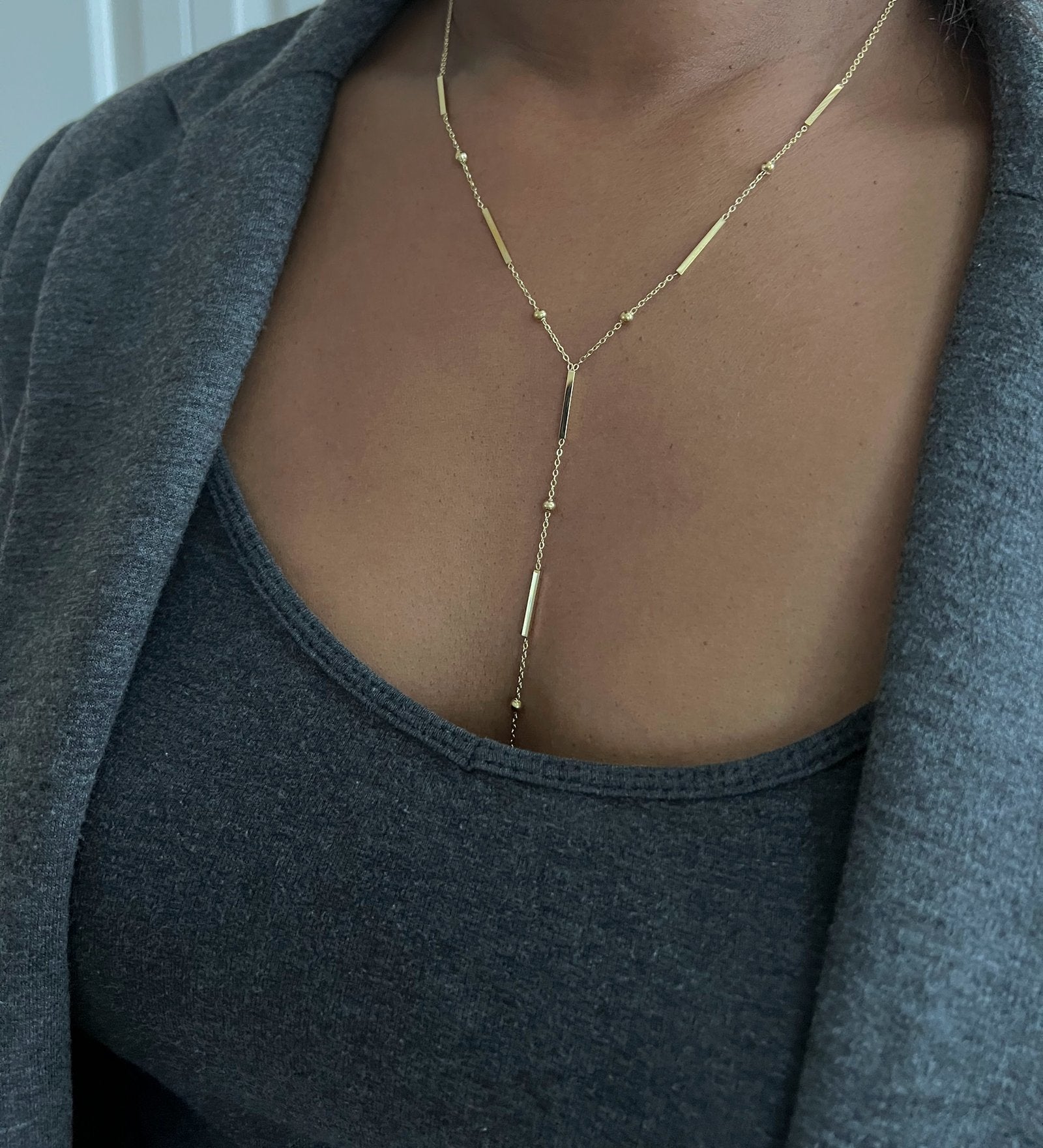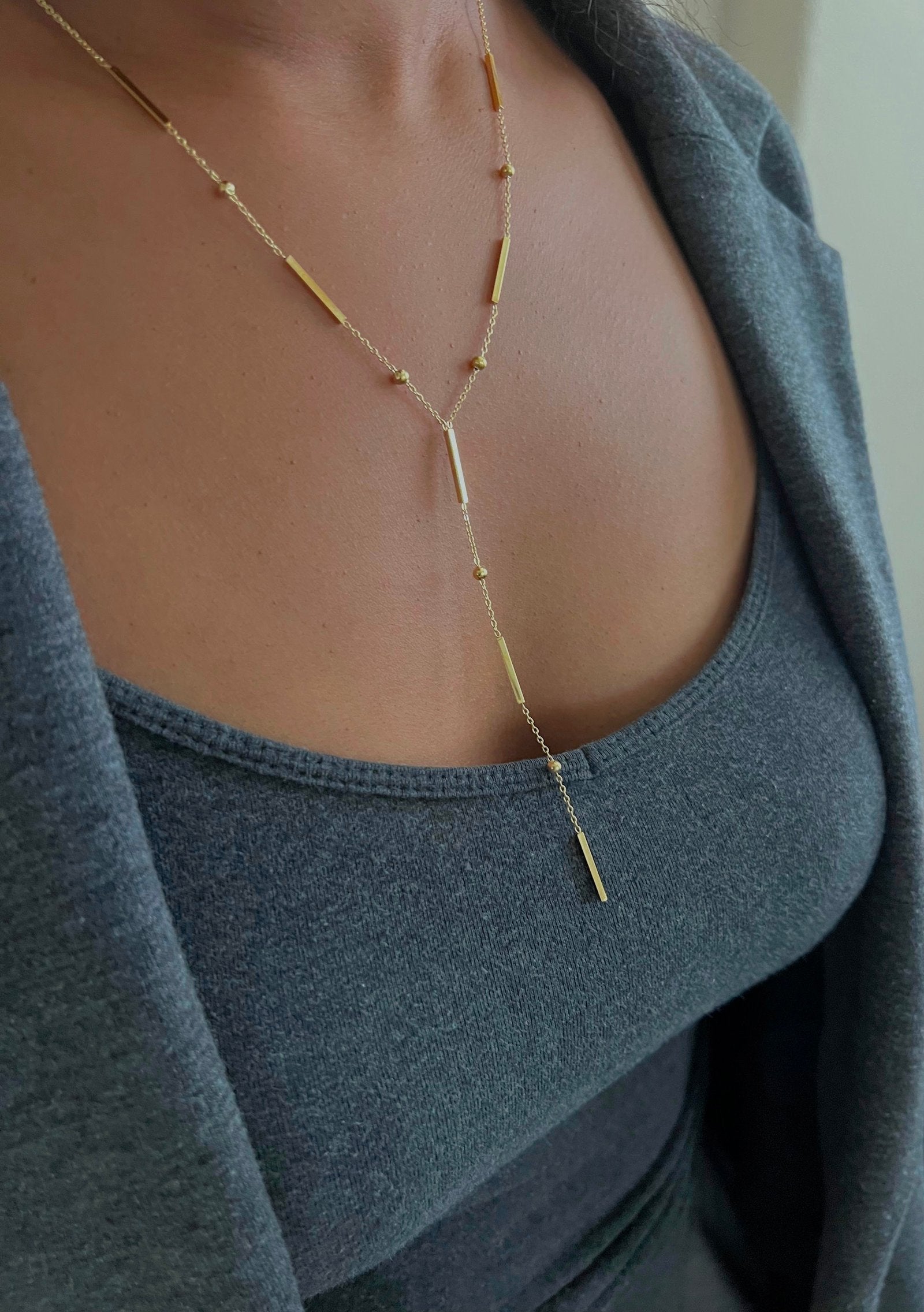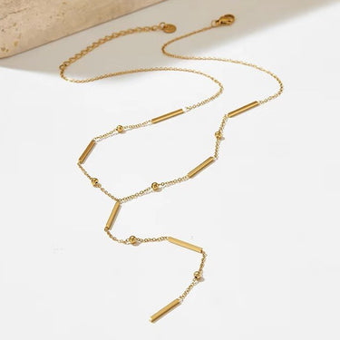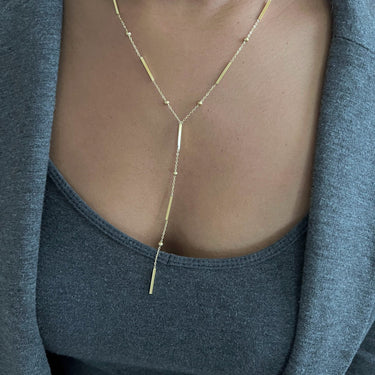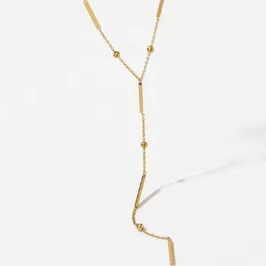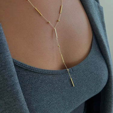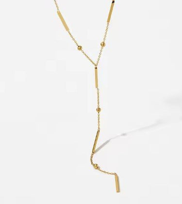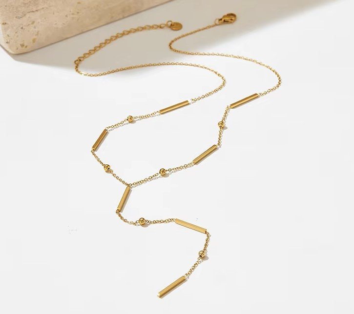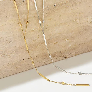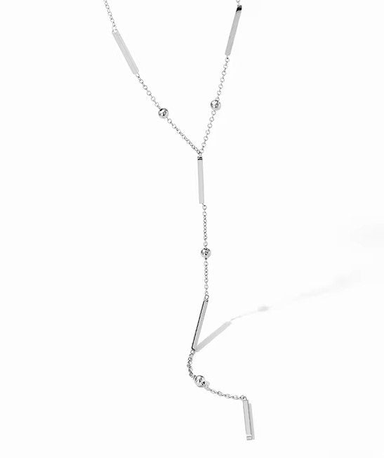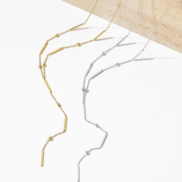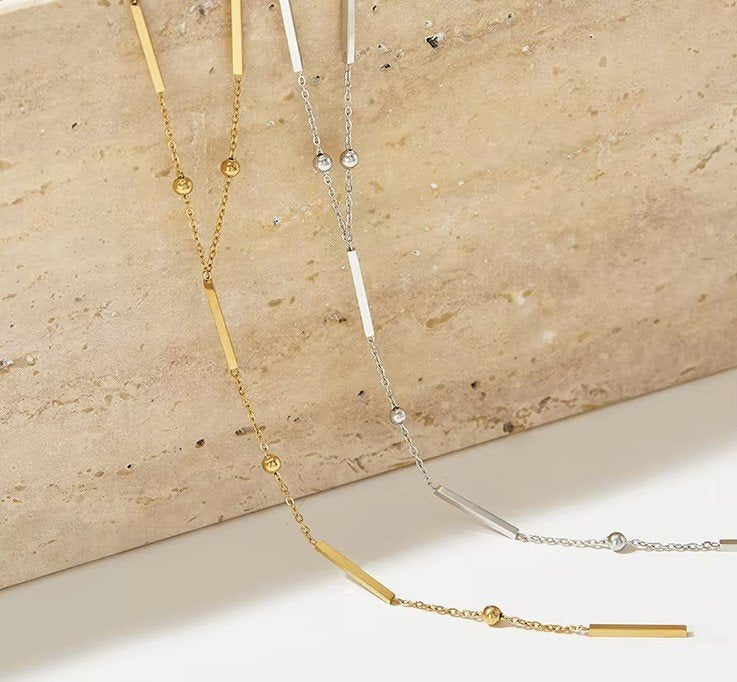 Embrace effortless elegance with the Lyra Harmony Long Chain Necklace – a beautifully crafted piece that combines simplicity with sophistication. This dainty necklace features a delicate balance of polished bars and small, gleaming beads, creating a refined look that’s perfect for layering or wearing solo. Made from high-quality platinum, and stainless steel plated with 18k gold, the Lyra Harmony is available in both gold and silver finishes. Its waterproof and tarnish-resistant qualities ensure it stays radiant through everyday wear. Hypoallergenic and skin-friendly, this long, lightweight chain is the epitome of understated luxury, adding a graceful touch to any outfit.
