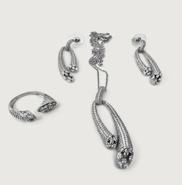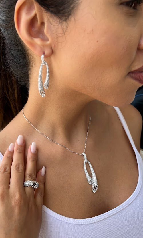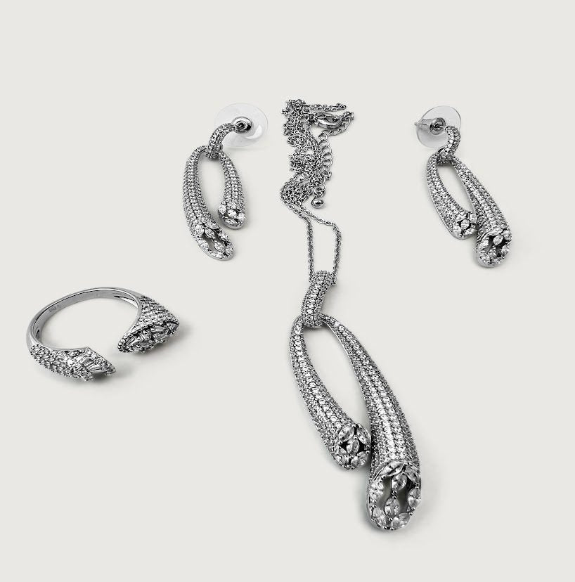 Scintillating Zircons illuminates this sleek jewelry set (ring, earrings, pendant with chain). As multifaceted as it is iconic, this Jewels of Marga collection is a tangible reminder of the connections we feel but can’t always see. This unique set is sure to catch the light and bright out the bling side of you.