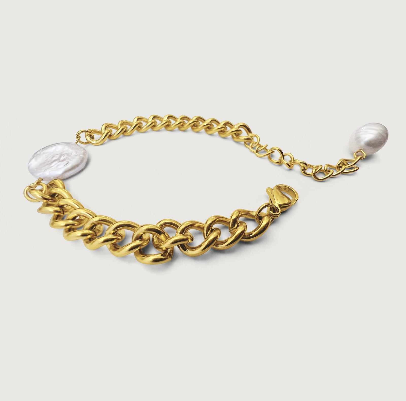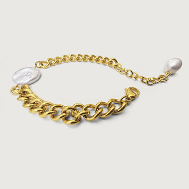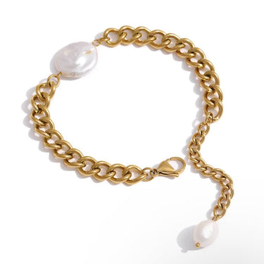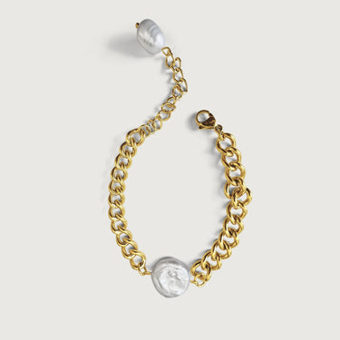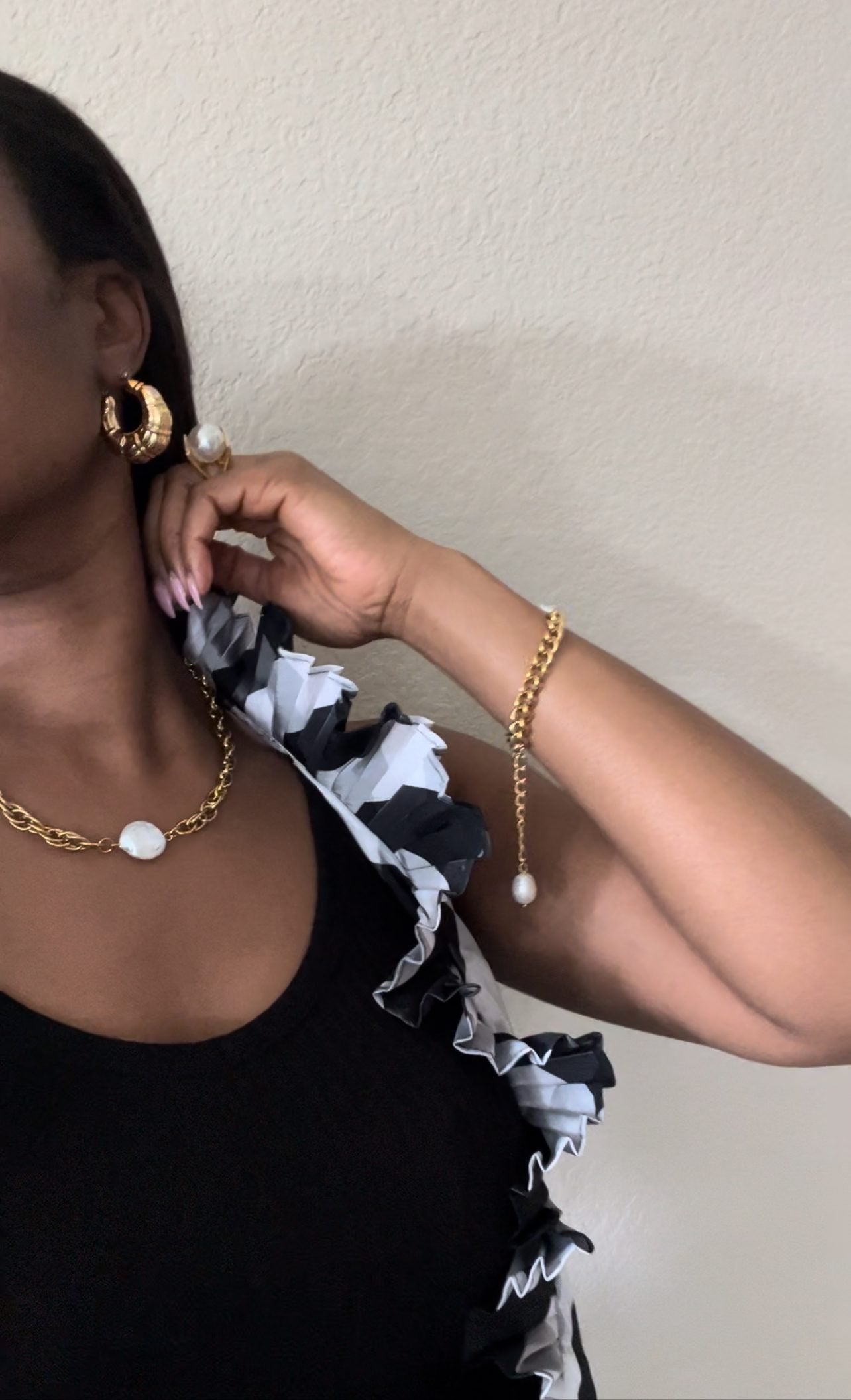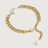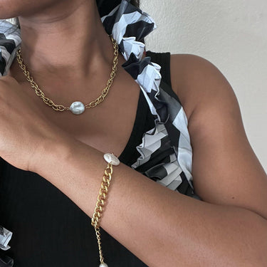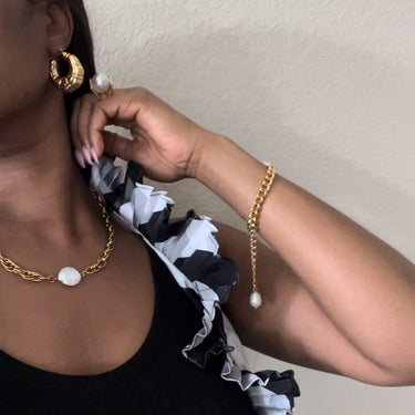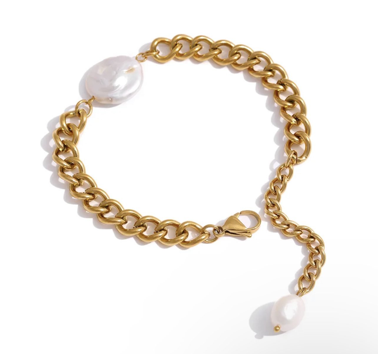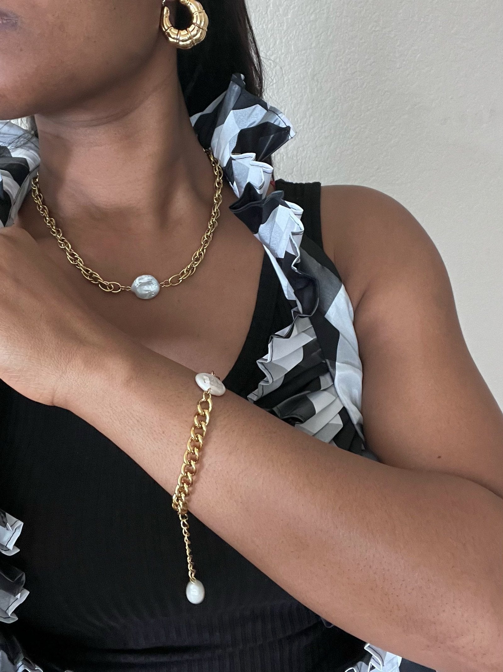 Design features a pearl at the center anchoring two Cuban links chains with an elegant dangling pearl charm. This bracelet will add a touch of elegance to any look. It’s great to wear alone, pair with other pearl jewelries, or mix and match with other wrist stacks for a stunning layered look. Enjoy the compliments.