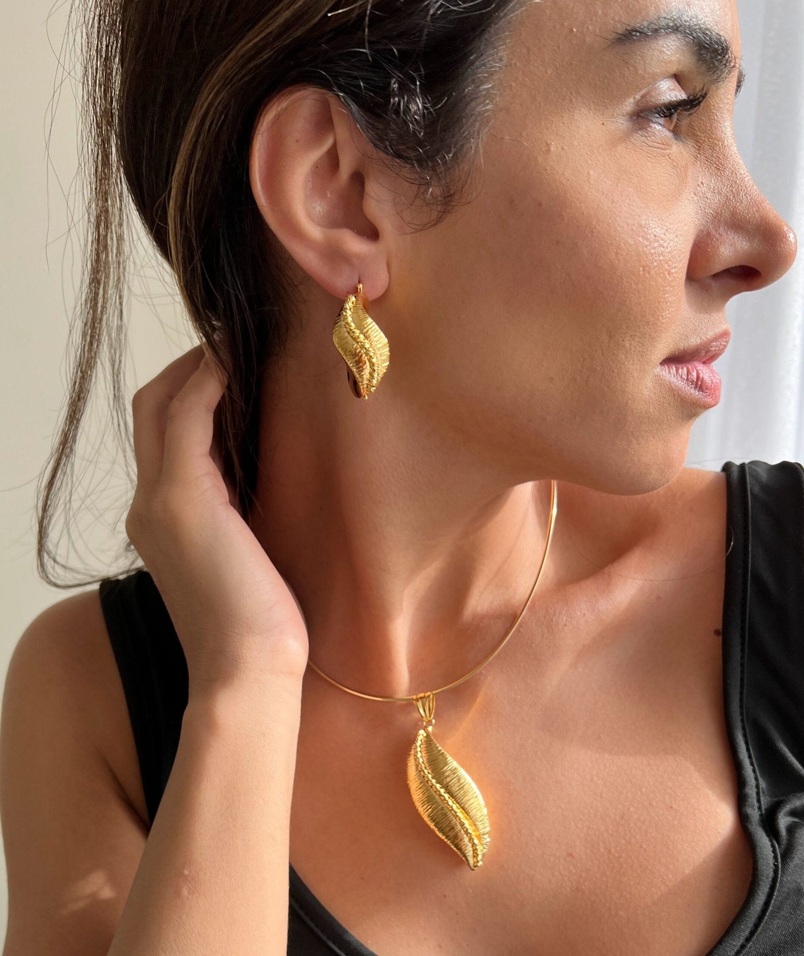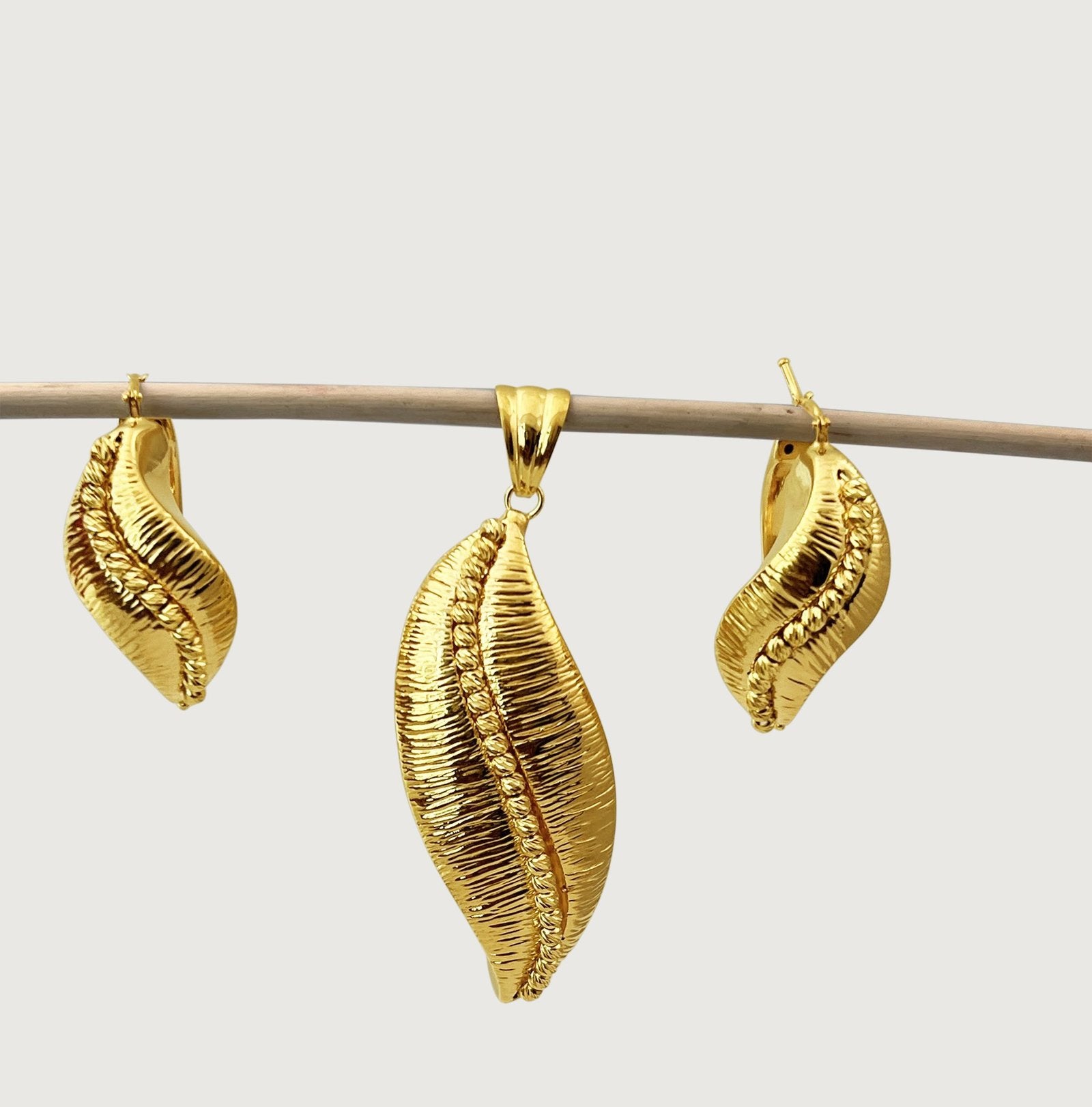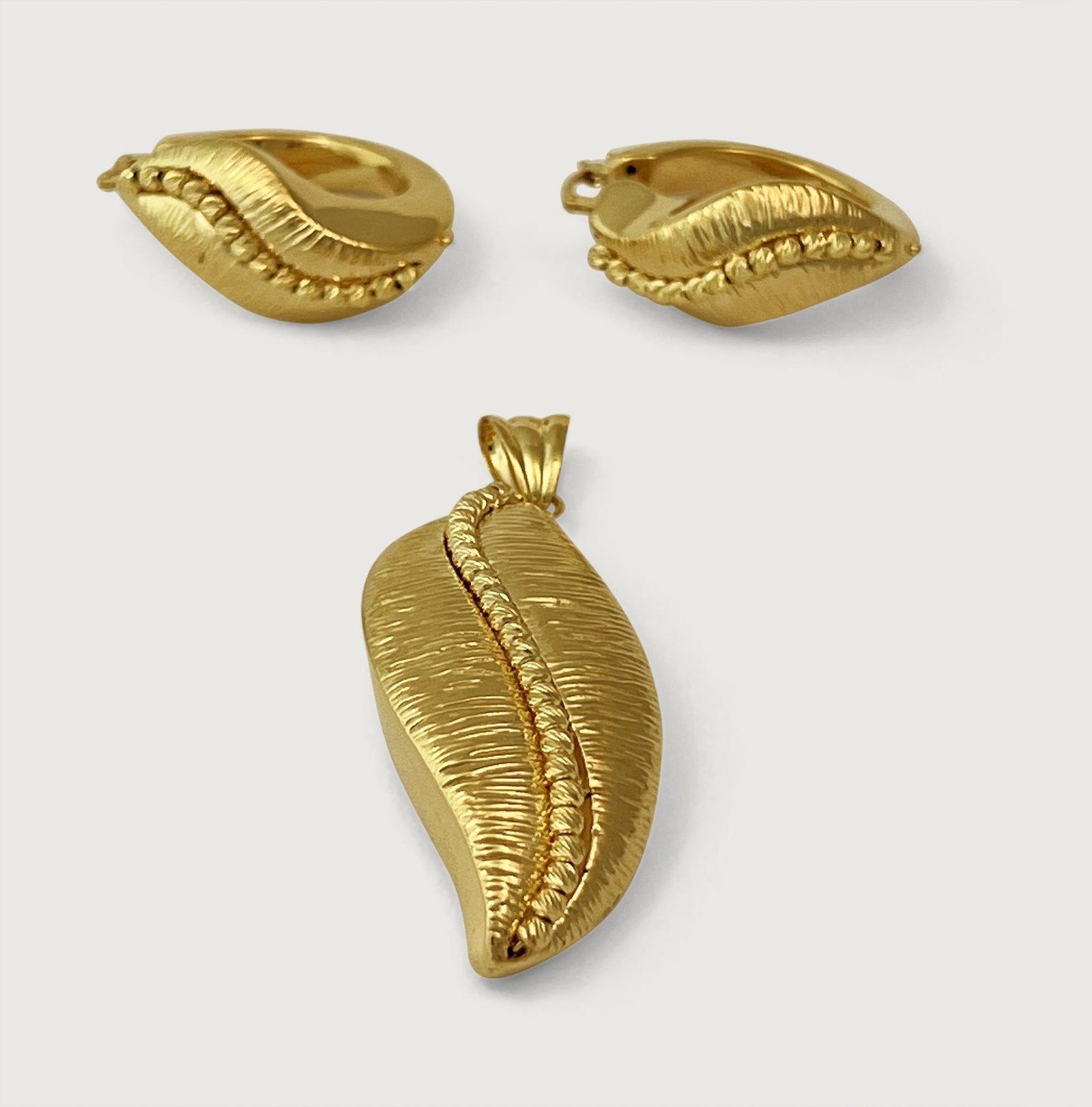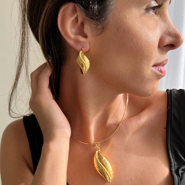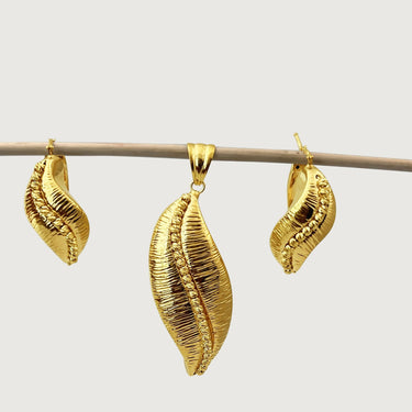 This unique, Eve Leafy set is one of our bold gold collections, crafted in solid 18k gold, these wow-worthy earrings and pendant set features a puffed design of polished lustrous gold. Timeless, elegant, and bold for that sophisticated look that speaks volumes about your personality and style. Set does NOT come with a chain.