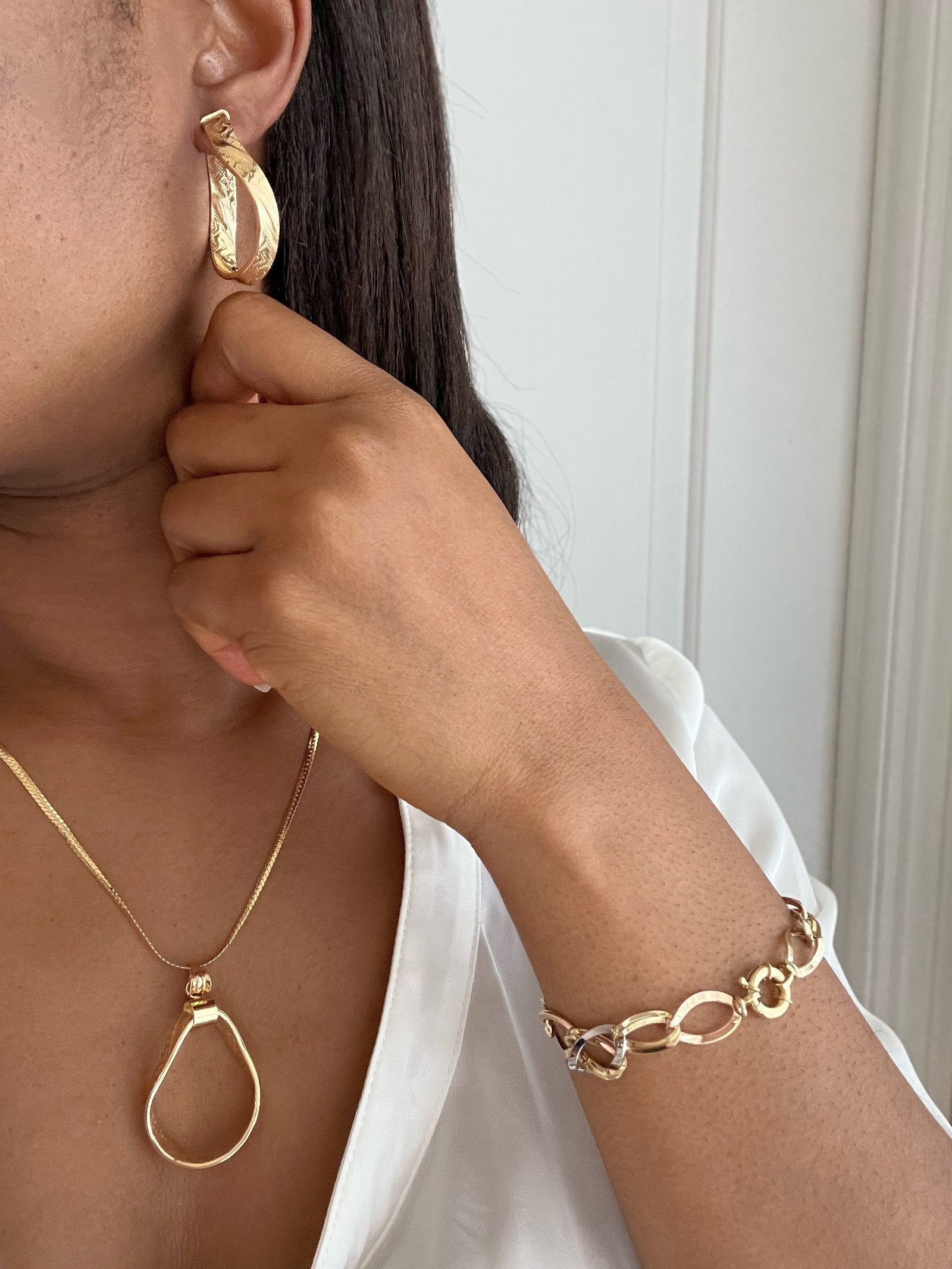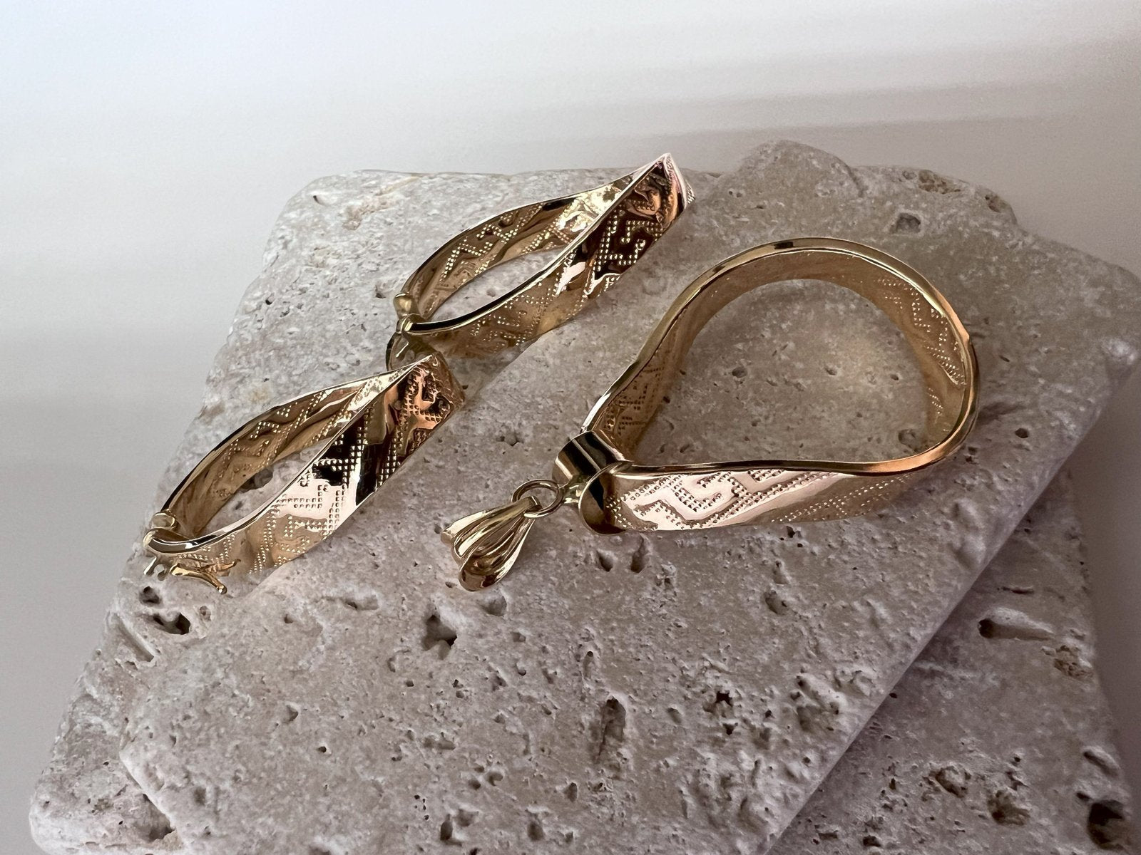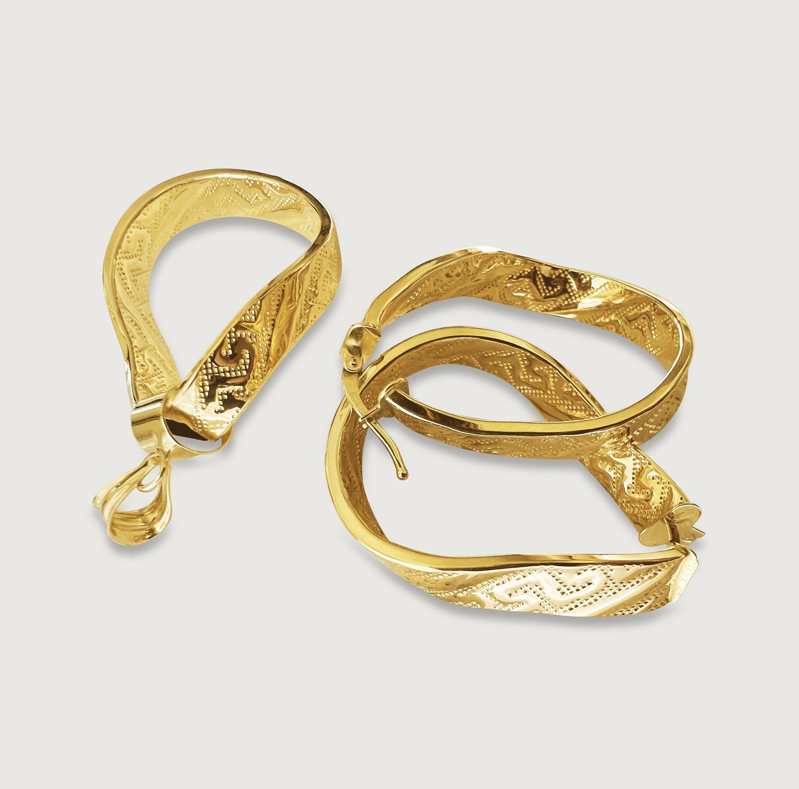 Indulge in elegance with our 18 karat gold textured oval hoop earring and pendant set. The unique design and luxurious gold make this set a must-have for every modern trendsetter. Versatile and timeless, it’s perfect for any occasion. Whether it’s for yourself or as a thoughtful gift, this set is an investment in style and sophistication. Elevate your look and shine with this exquisite jewelry