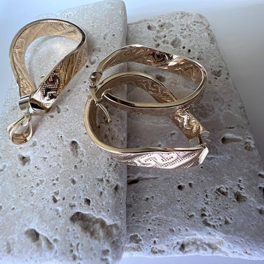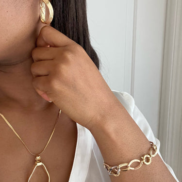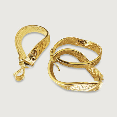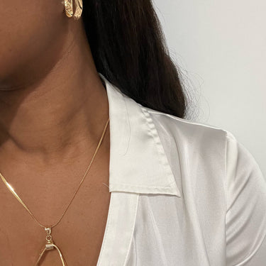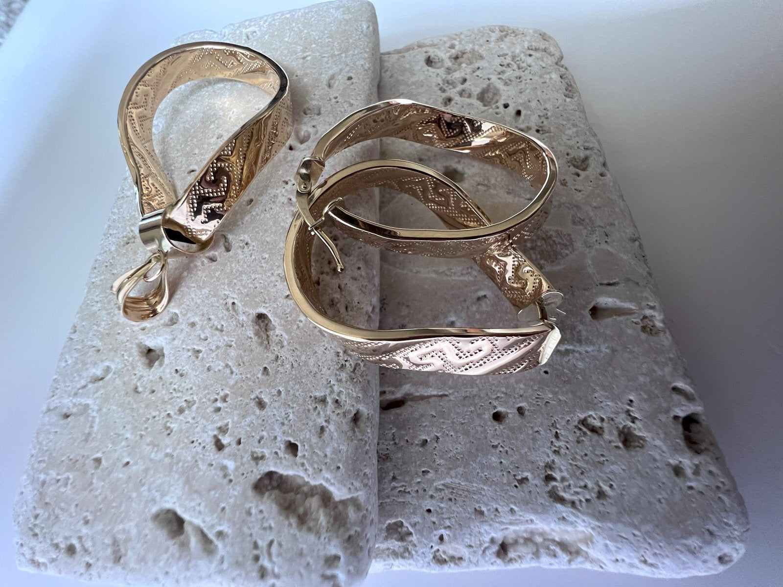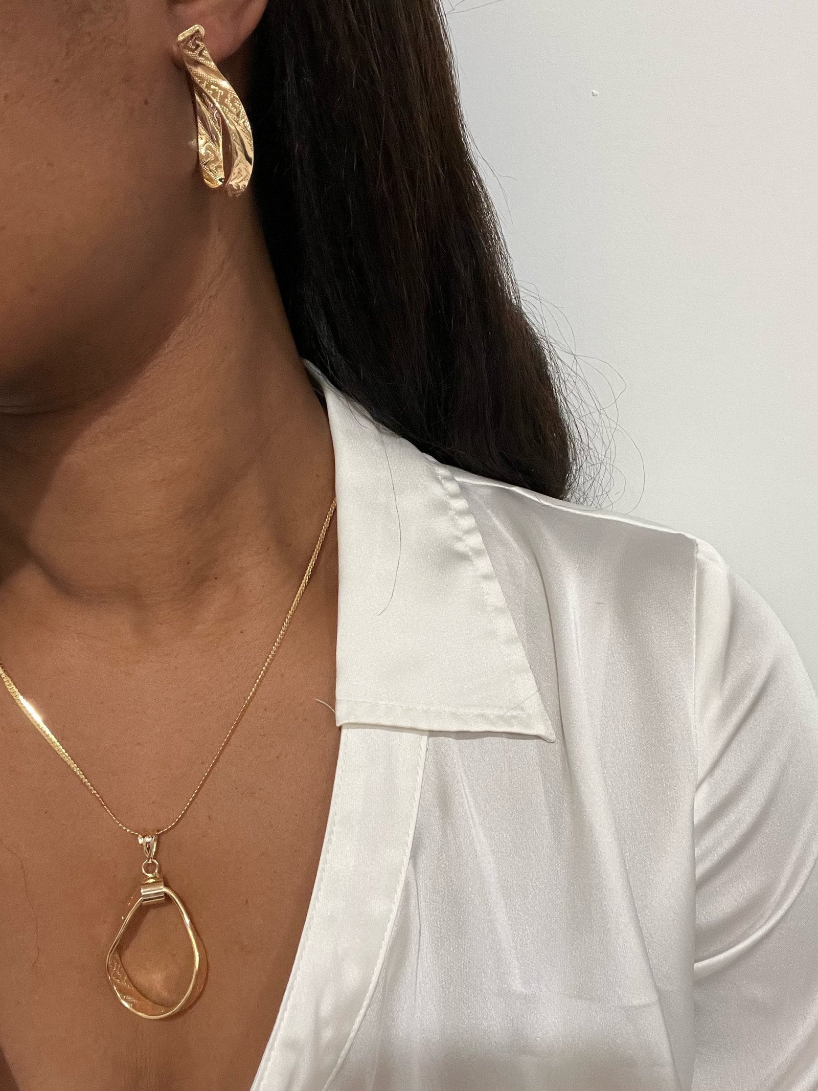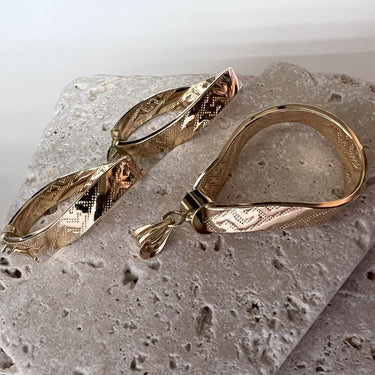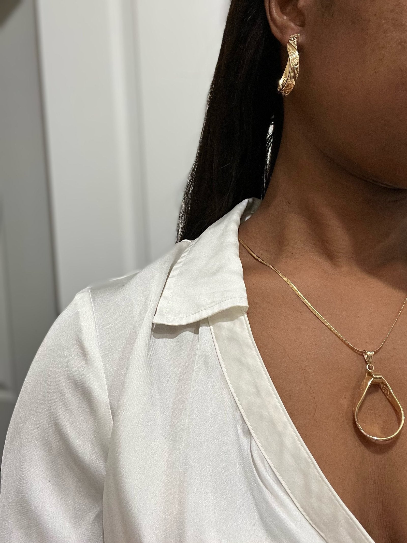 Indulge in elegance with our 18 karat gold textured oval hoop earring and pendant set. The unique design and luxurious gold make this set a must-have for every modern trendsetter. Versatile and timeless, it’s perfect for any occasion. Whether it’s for yourself or as a thoughtful gift, this set is an investment in style and sophistication. Elevate your look and shine with this exquisite jewelry