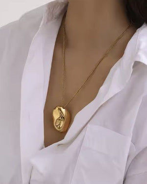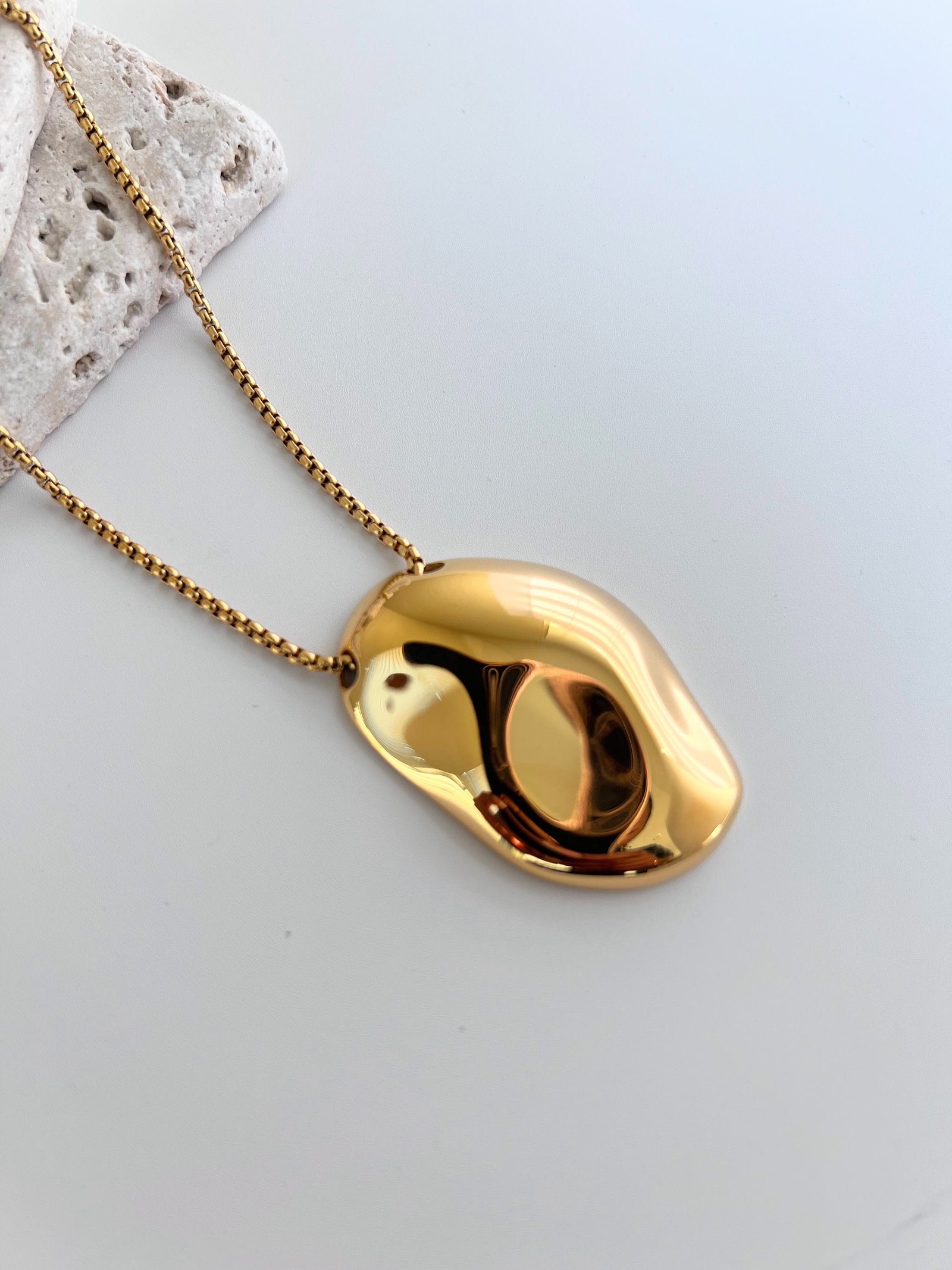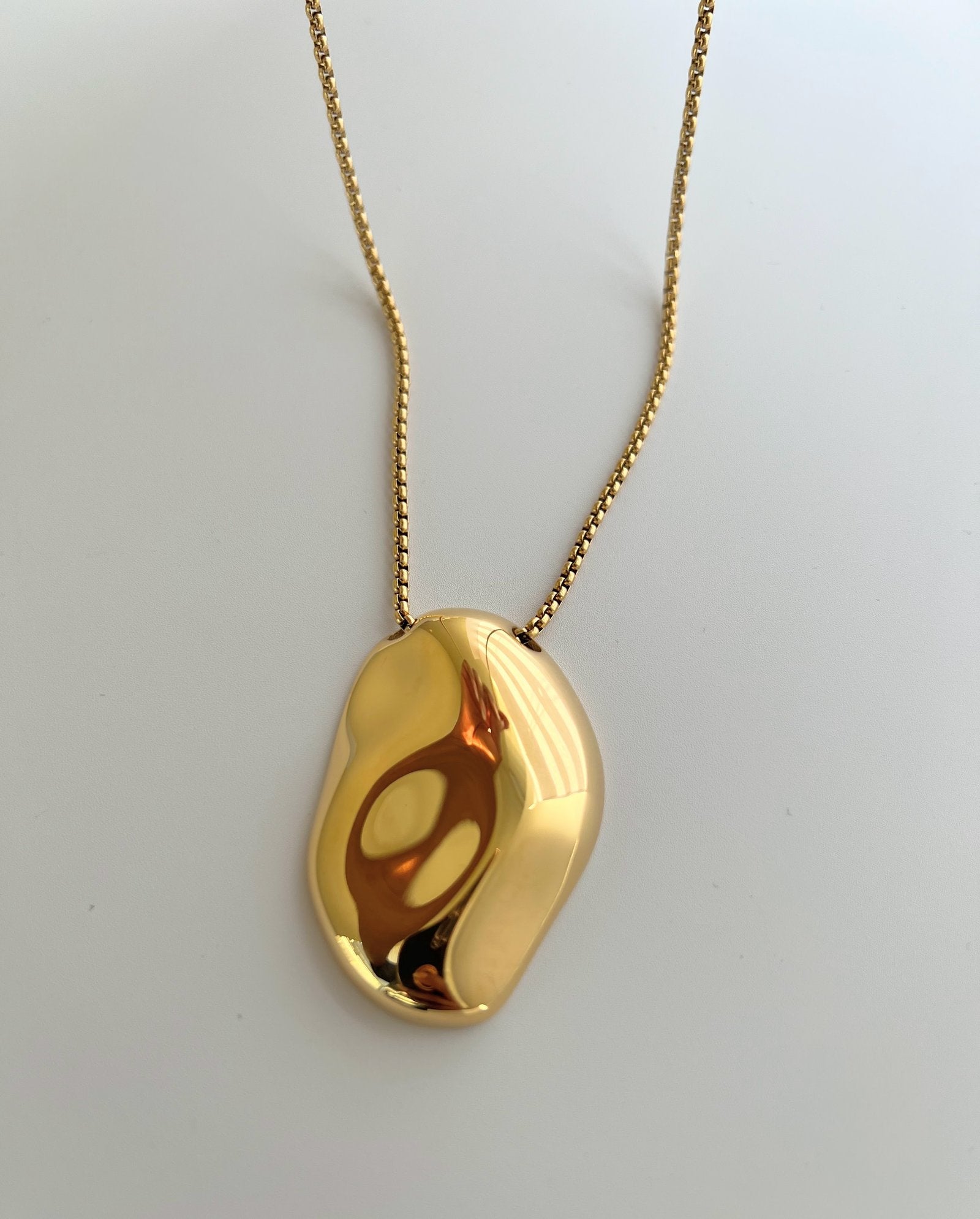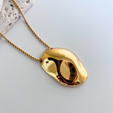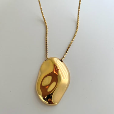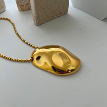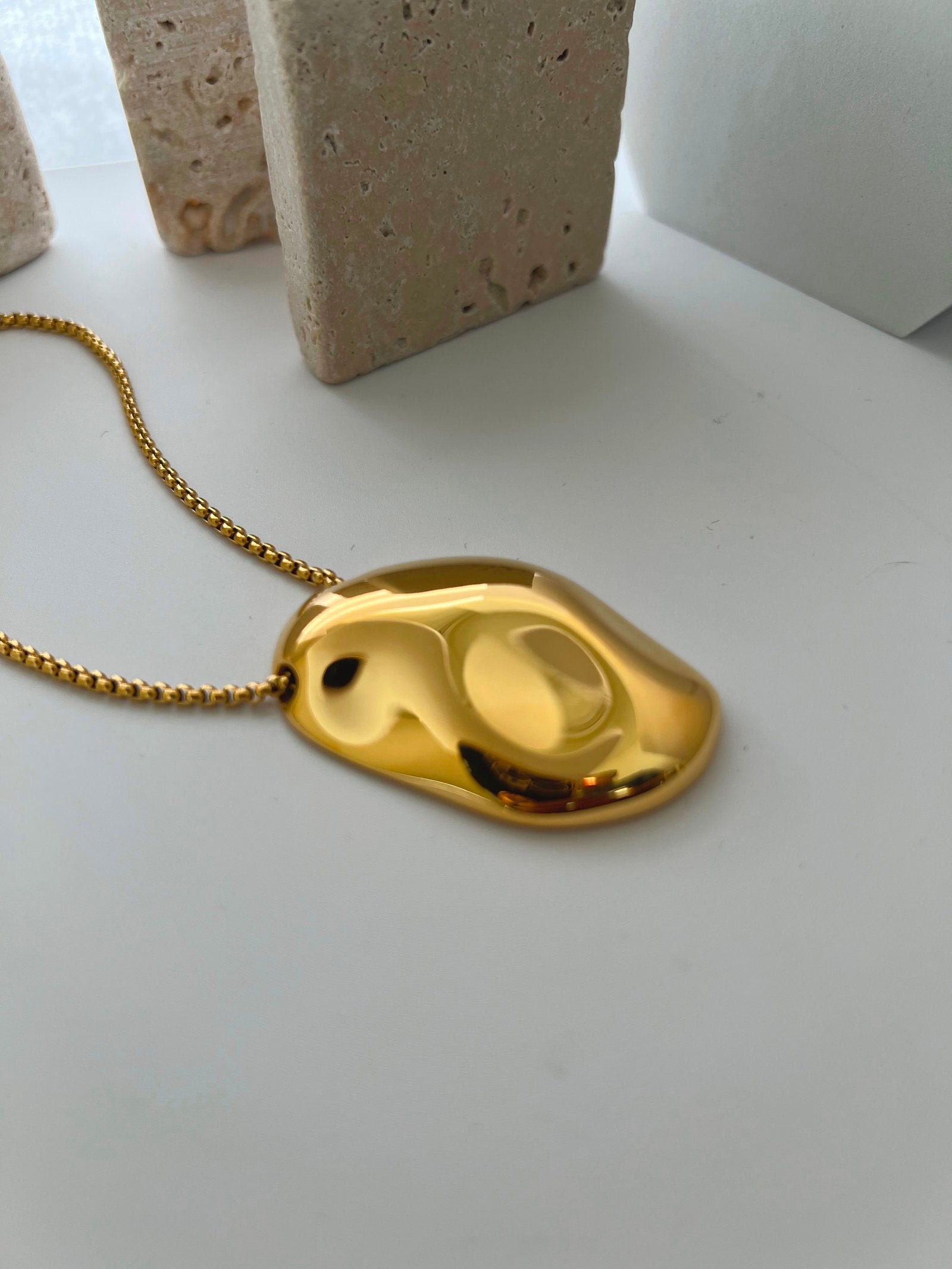 Make a bold statement with the Soleil Hammered Pendant Necklace. Featuring an eye-catching, irregularly concave pendant with a unique hammered texture, this necklace brings modern artistry to any look. Crafted from durable stainless steel and plated with 18k gold, it radiates a warm, luxurious glow while being resistant to tarnish and water. The large, sculptural pendant hangs gracefully from a sleek chain, adding a touch of sophistication to casual and formal outfits alike. Perfect for those who appreciate distinct, standout pieces, the Soleil Necklace is designed to elevate your style with a touch of organic elegance.
