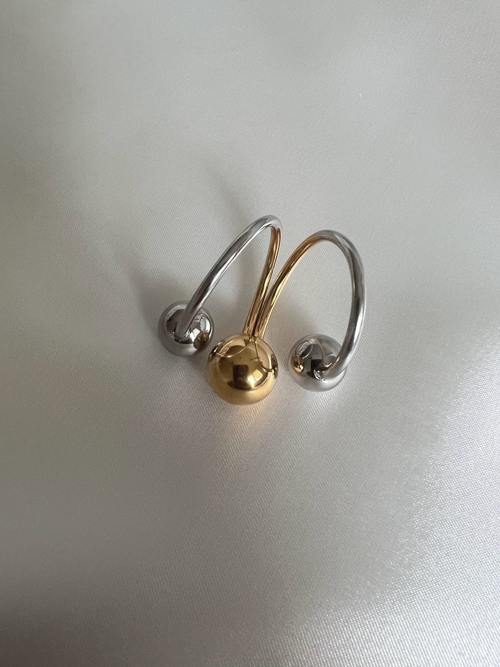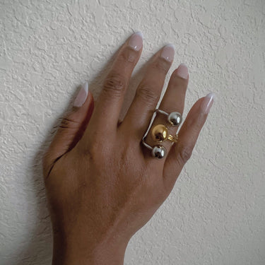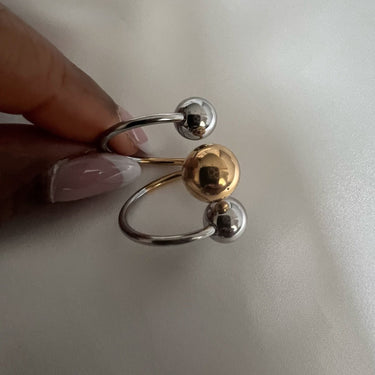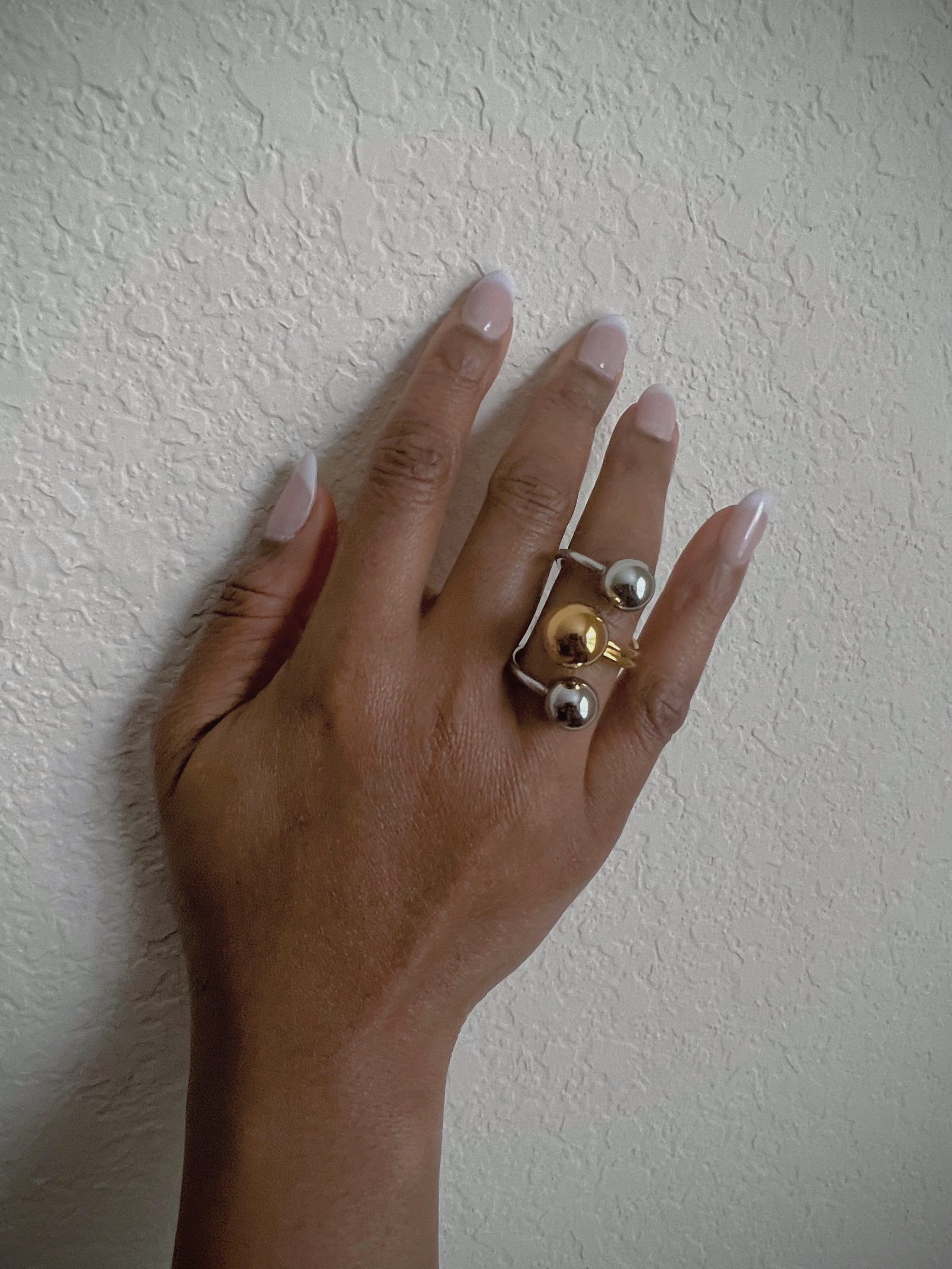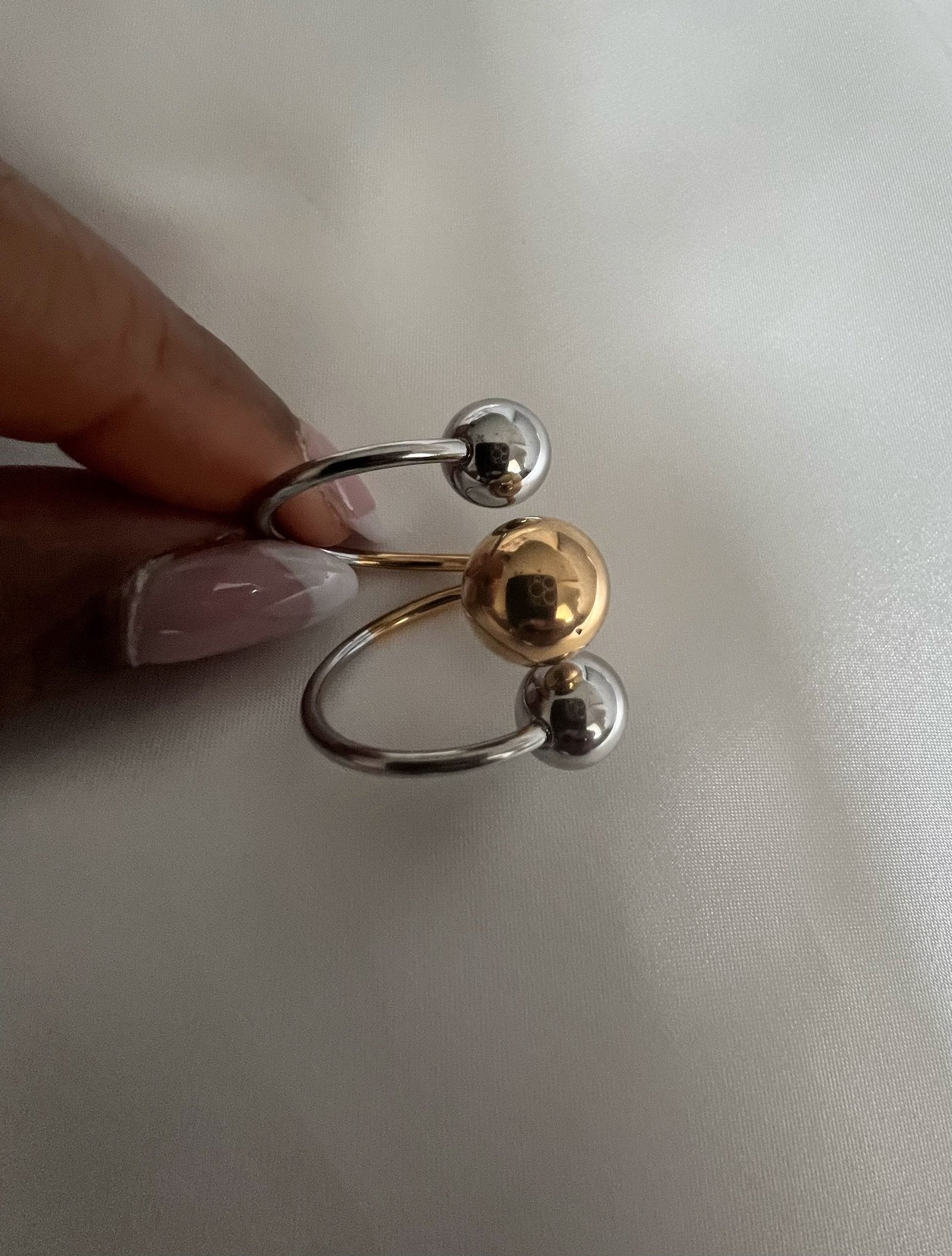 Featuring three balls on two rings connected together. This two-tone ring is the perfect combination of style and modern design. Crafted with 18k gold or silver plated on stainless steel. Can be worn in the shower and it’s hypoallergenic. Perfect for making a statement and adding a unique touch to any outfit.