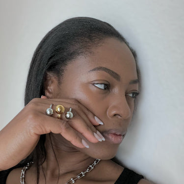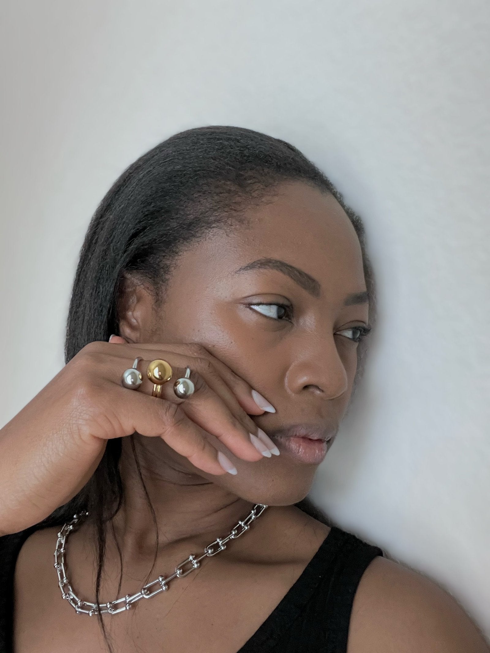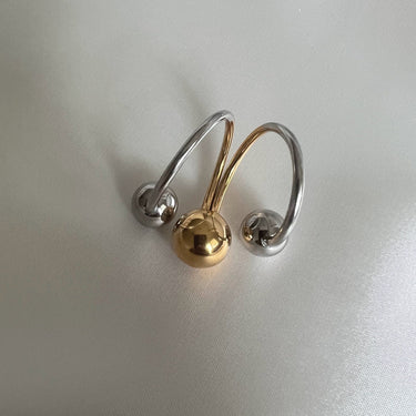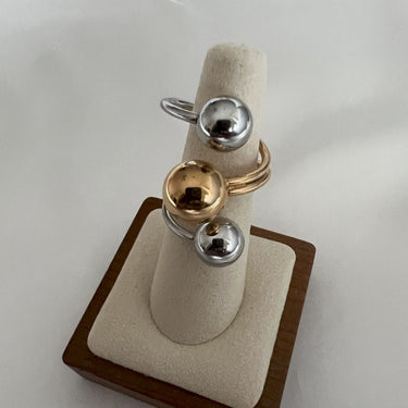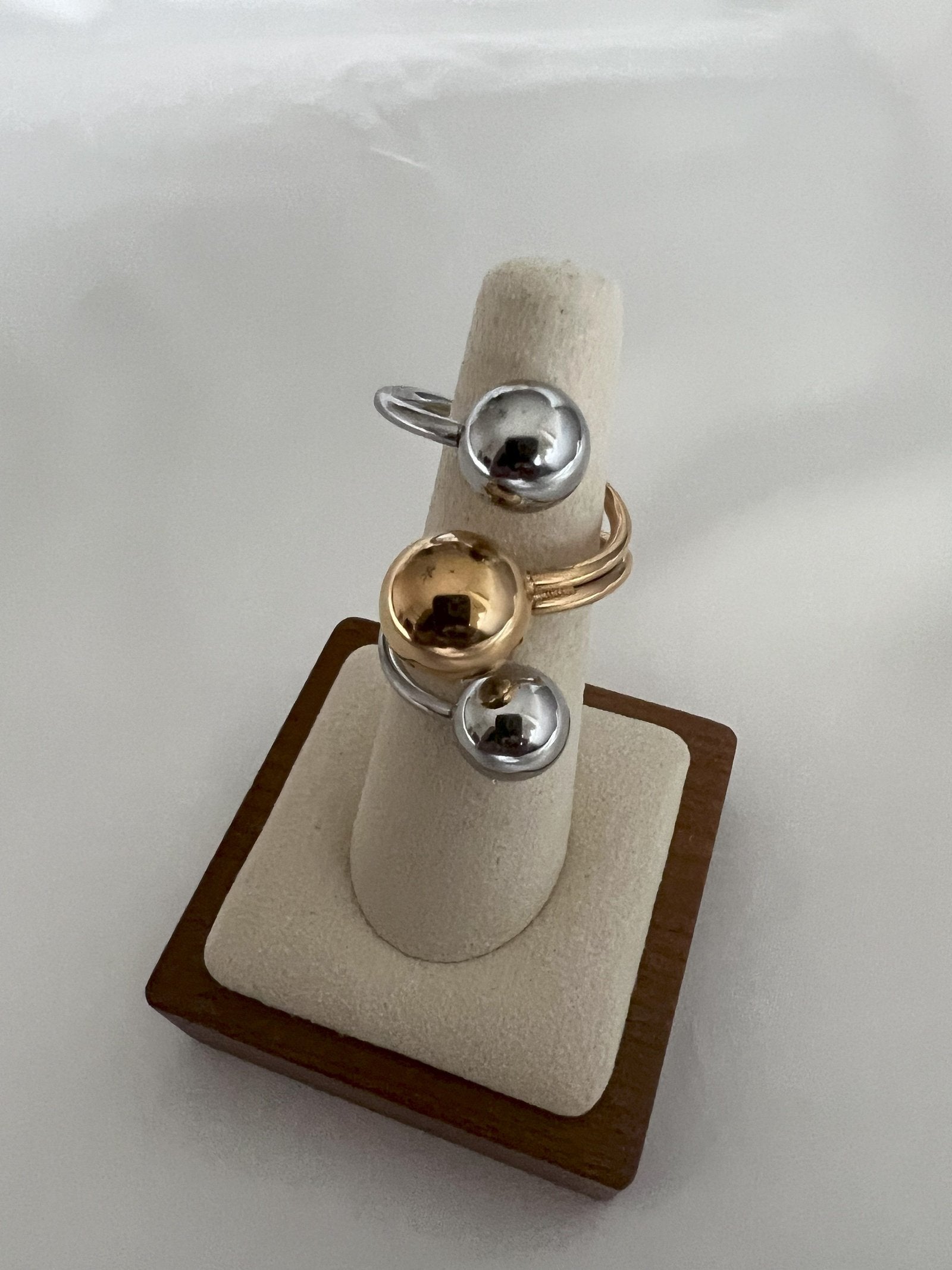 Featuring three balls on two rings connected together. This two-tone ring is the perfect combination of style and modern design. Crafted with 18k gold or silver plated on stainless steel. Can be worn in the shower and it’s hypoallergenic. Perfect for making a statement and adding a unique touch to any outfit.