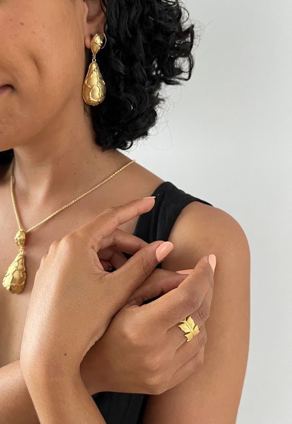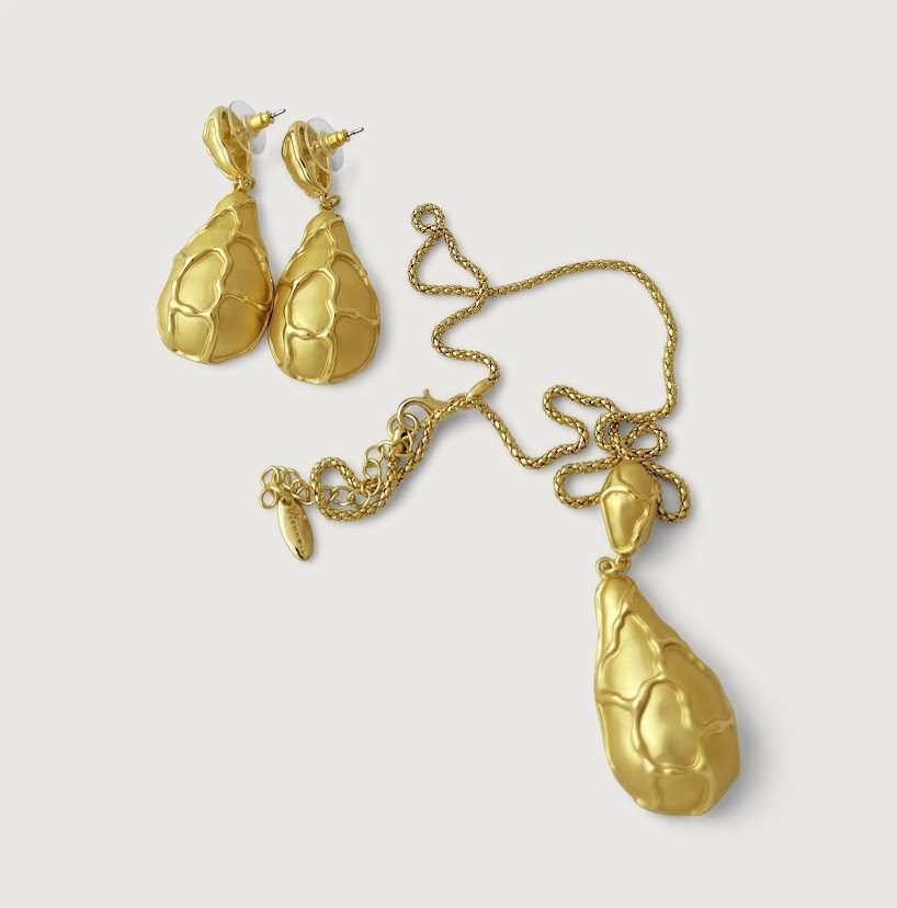 Introducing Andrea jewelry set, one of our bold gold collections designed for that bold statement style. This set includes, a pair of stud earrings, chain and pendant. Crafted in stainless steel and plated with lustrous 18K gold. The luster on this set catches the light from all angles and radiates on your style. That elegant, luxury, and royalty style… This is it.