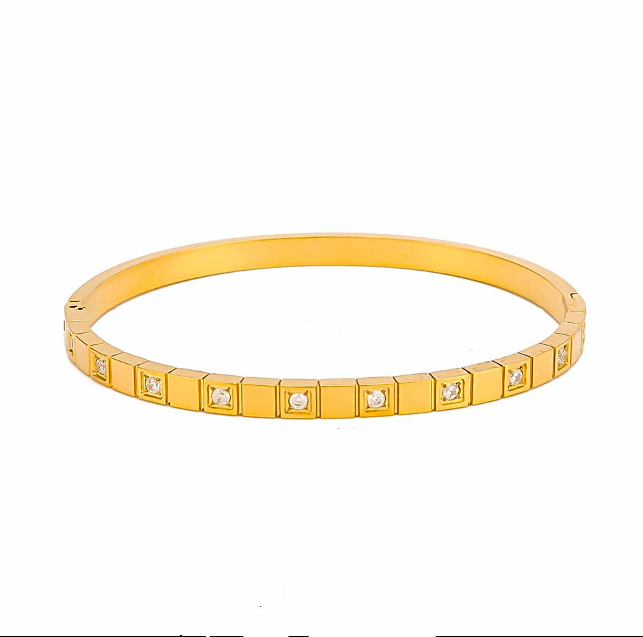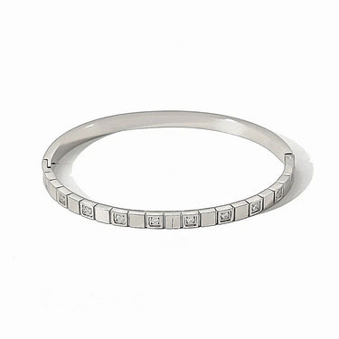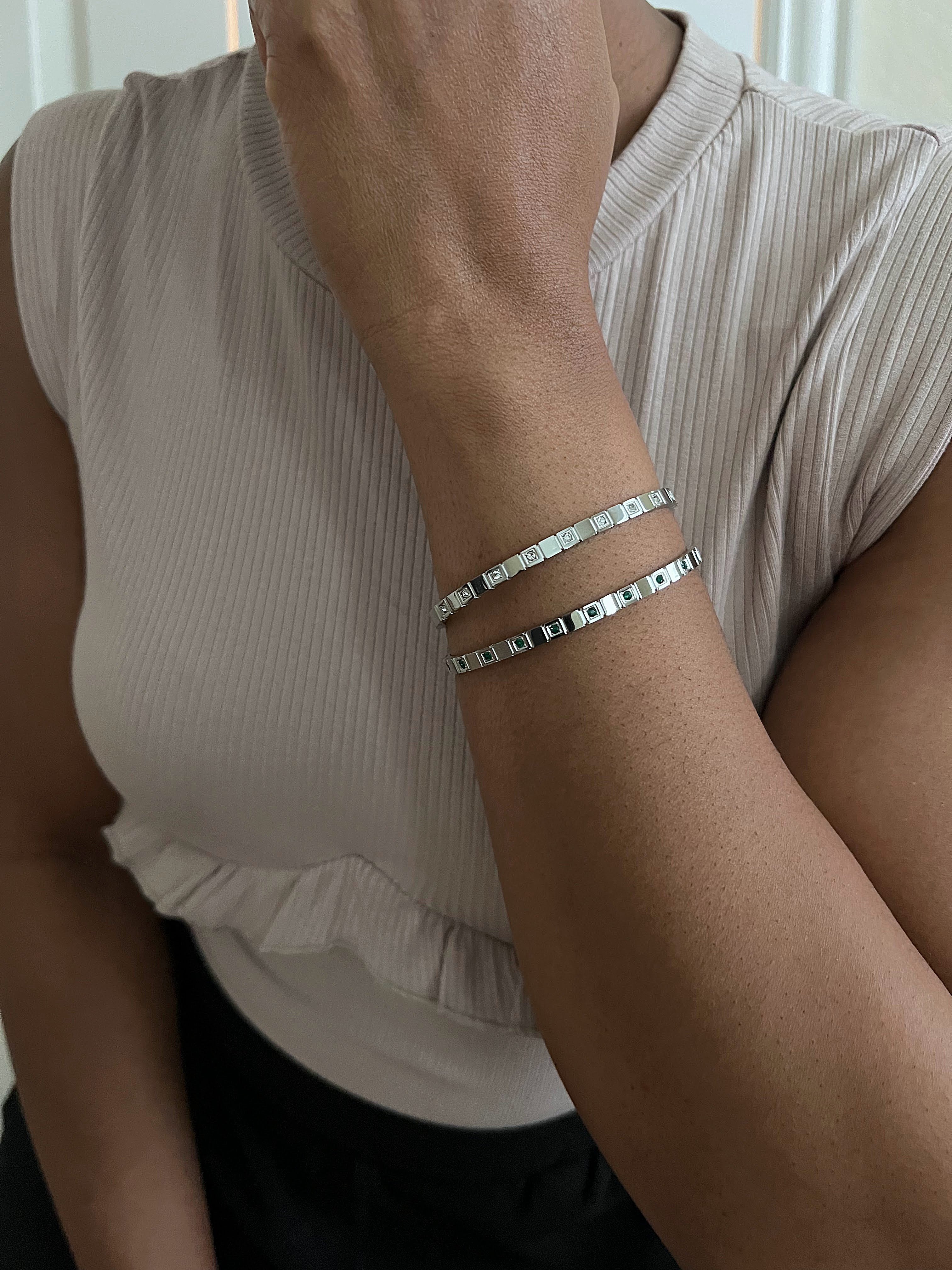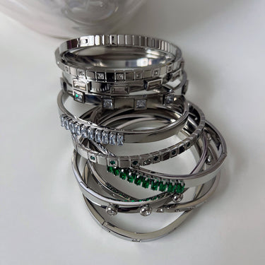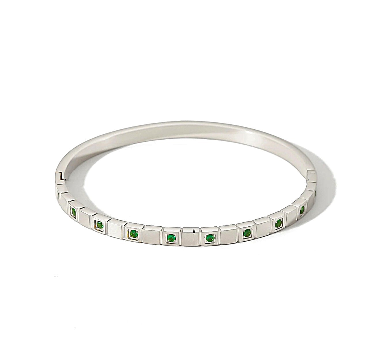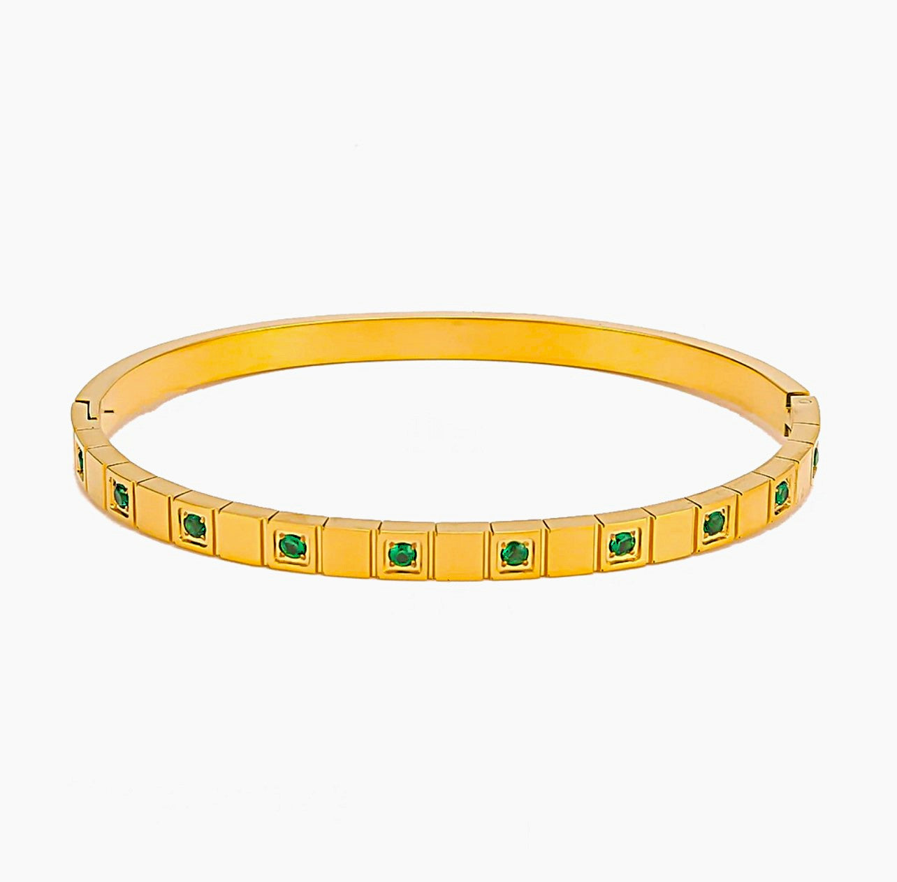 This elegant bangle features a row of round green zircon crystals set within square grooves. Available in both silver and 18k gold-plated finishes, it offers a vibrant and sophisticated touch to your wrist. Perfect for layering or wearing alone, this design adds a pop of color to any look