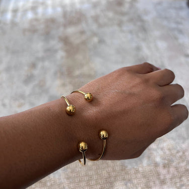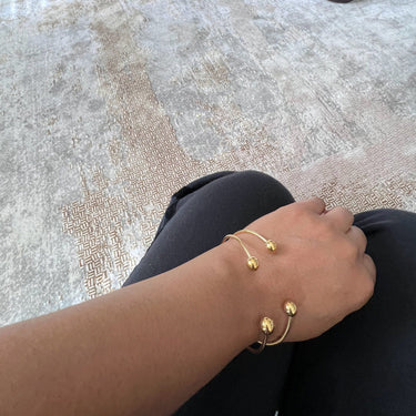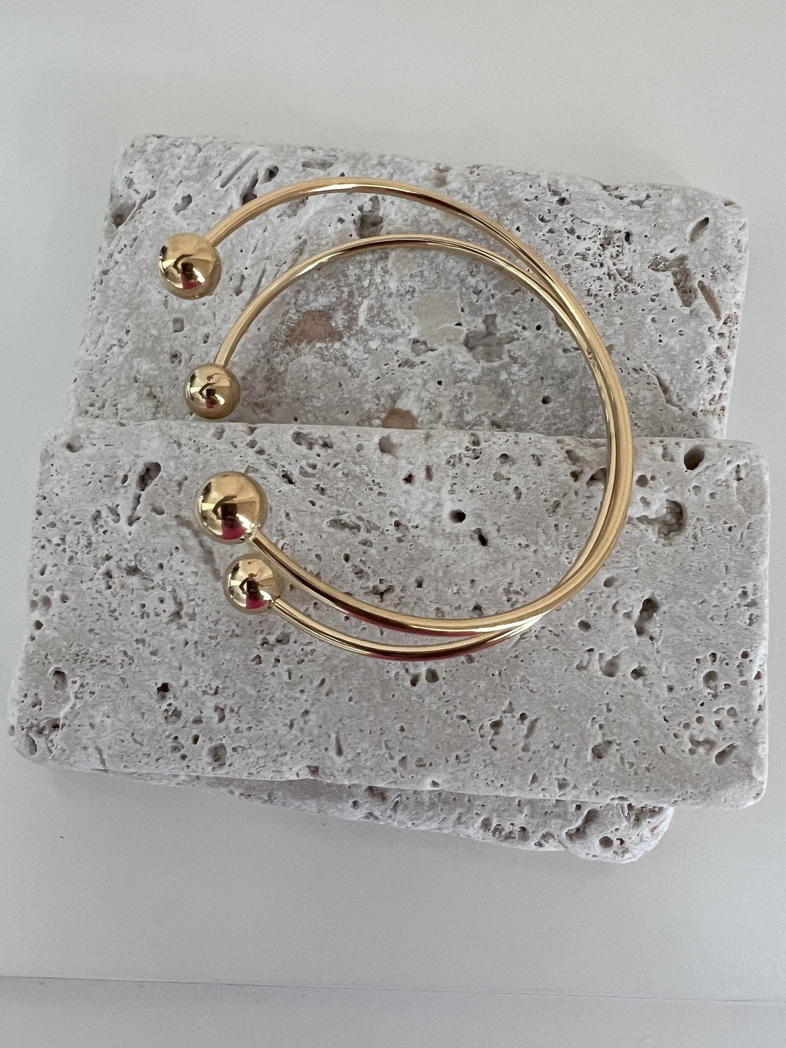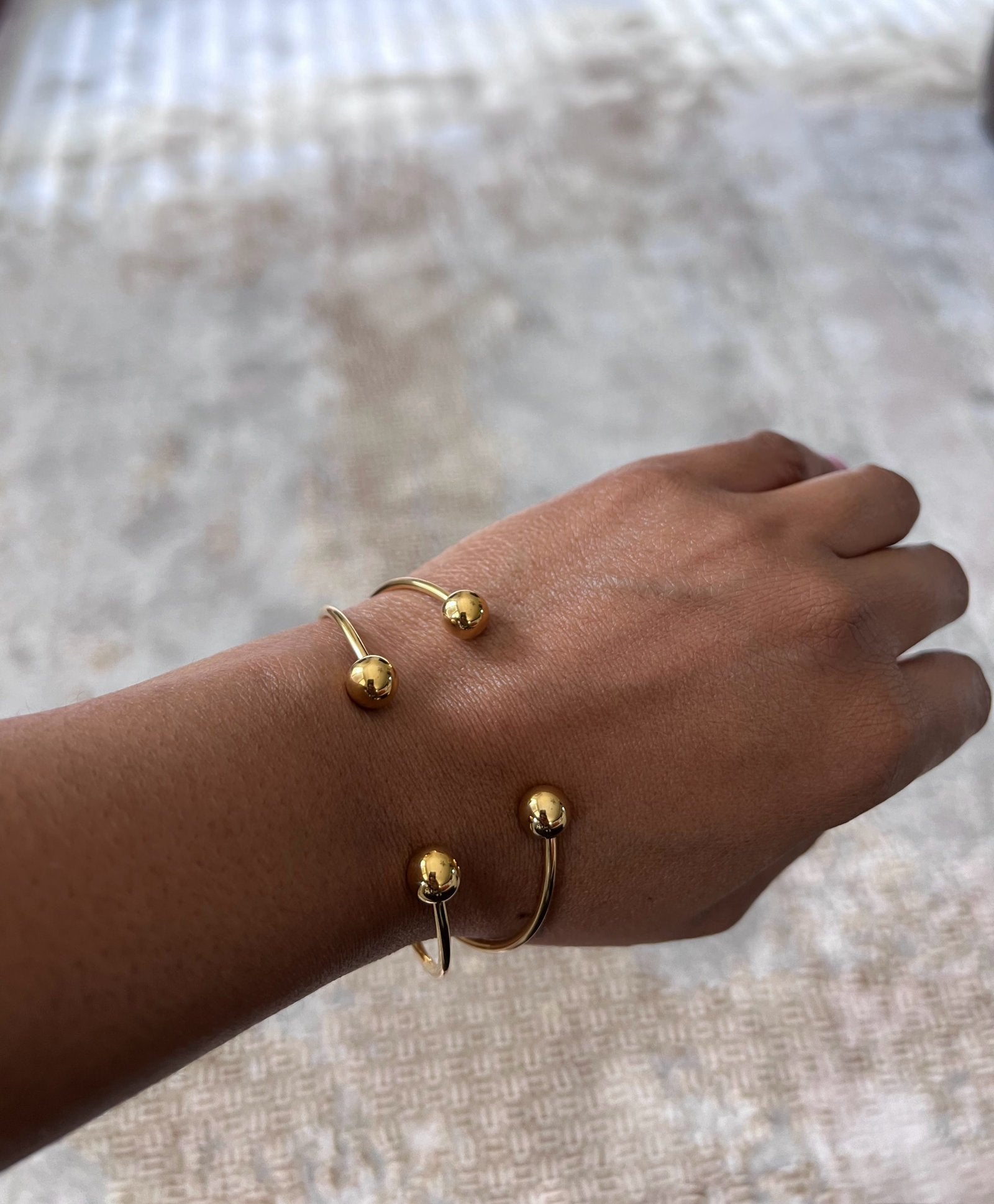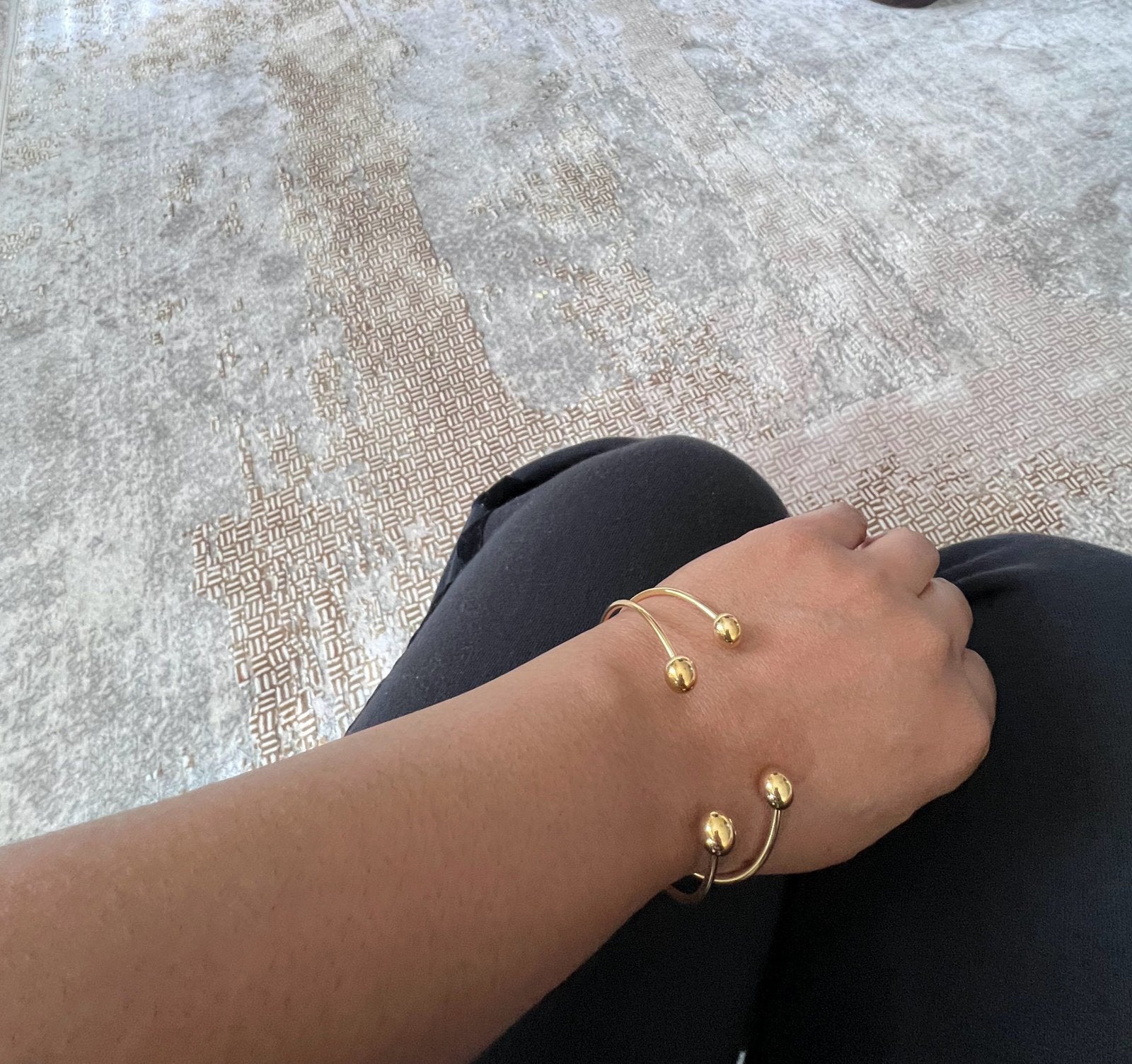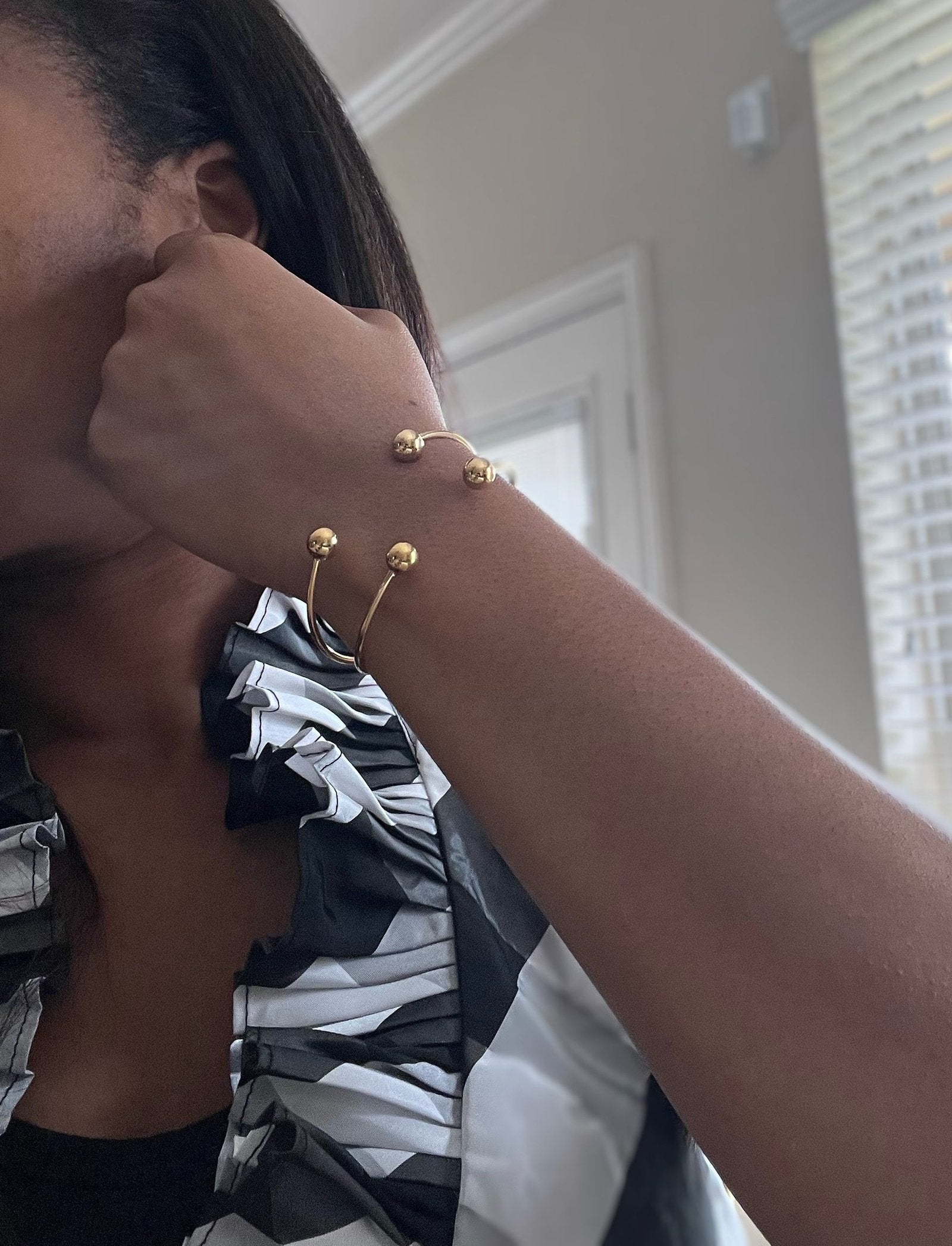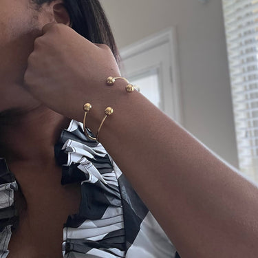 These flattering and sophisticated bracelet features gold plated stainless steel beads joined by short rods of 18k gold plated rods. The elemental shapes of this bracelet embody the simplicity of modern sophistication. Add this to your ear stack or wear alone. You can pair this bracelet up with our Glaring Bead Long Dangle Drop Earrings to create a beautiful statement whatever the occasion.