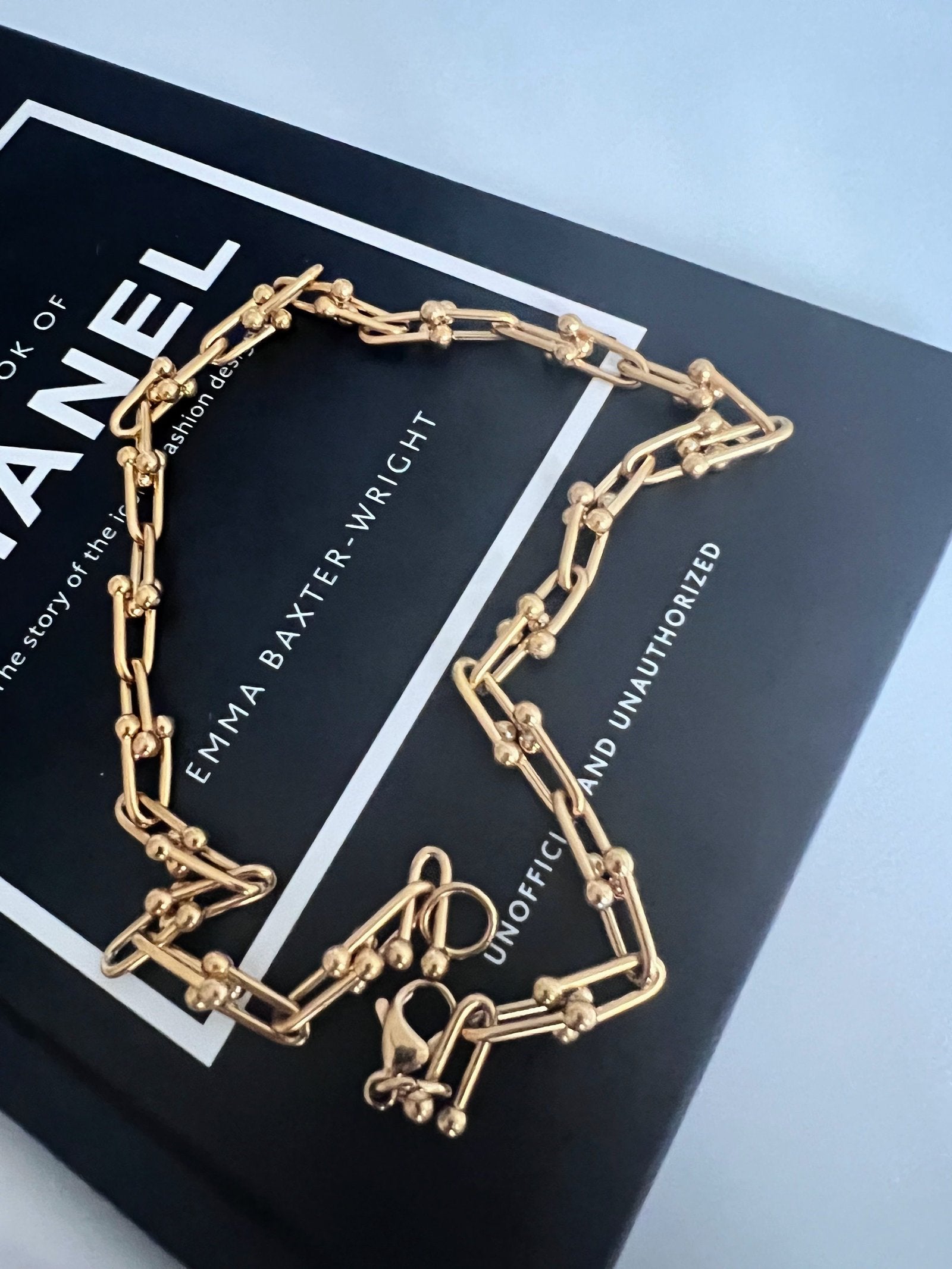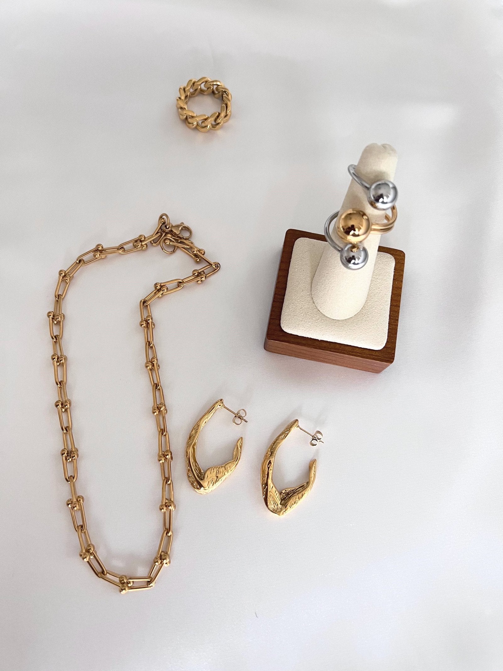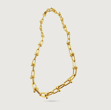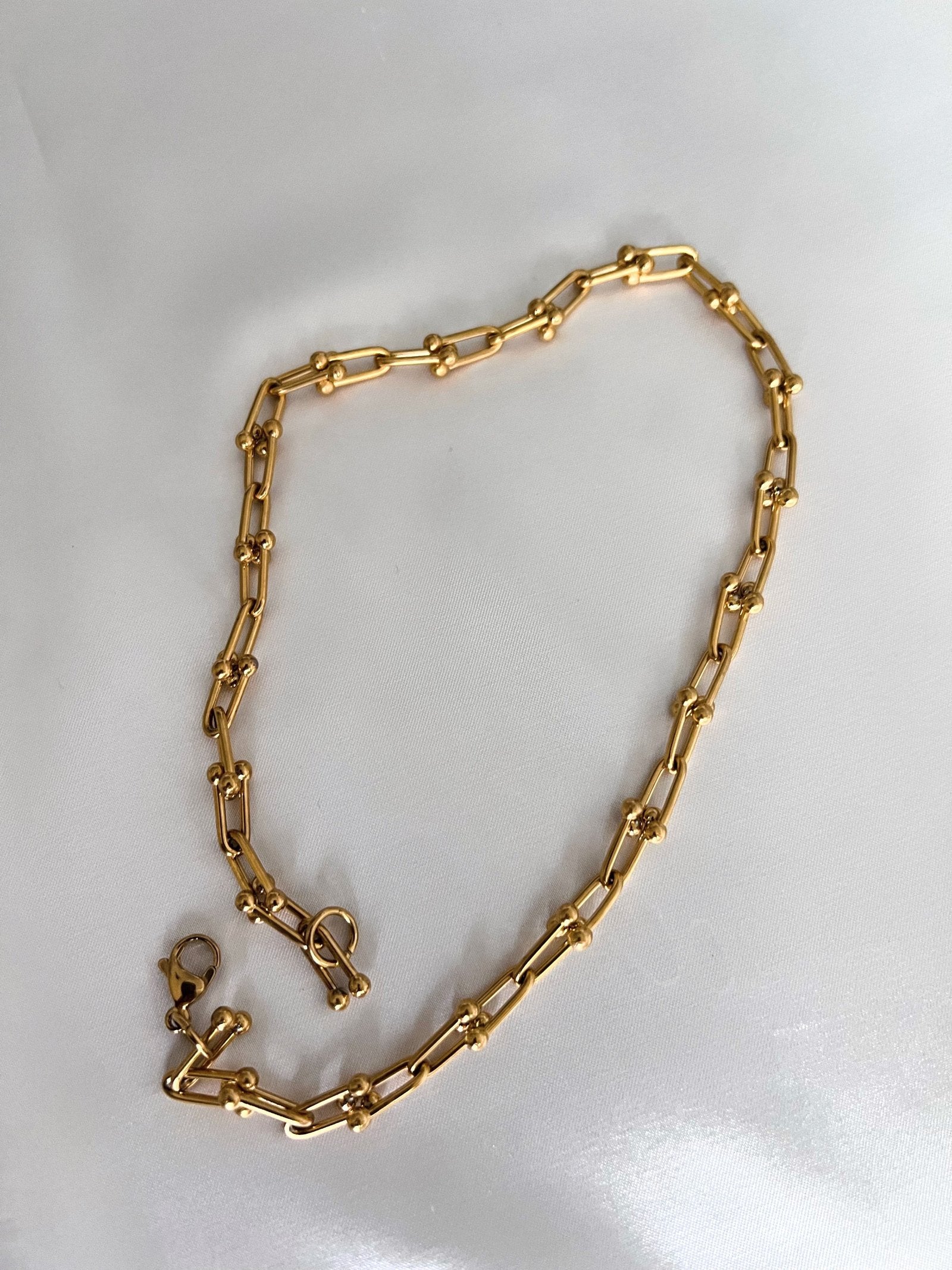 Featuring a chain with guage links capturing an urban edge, making a stunning statement. This chain necklace is a statement maker that matches well with your essentials. You can wear alone or add to your neck stack. She will not only keep your style trendy, but also have you looking like a million bucks.