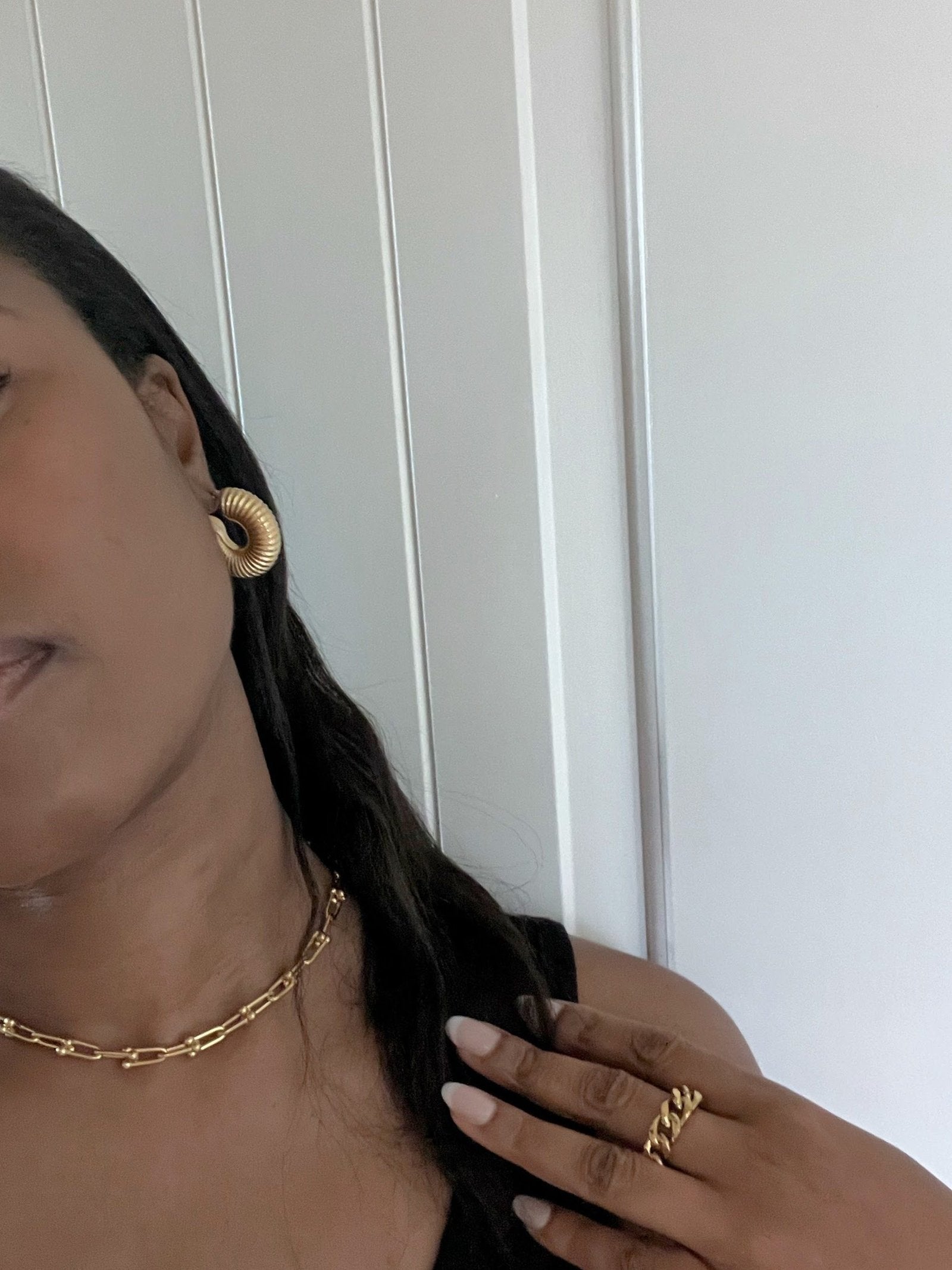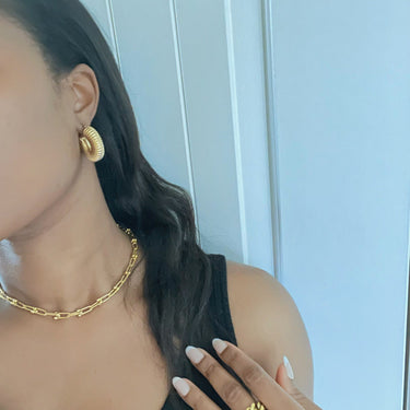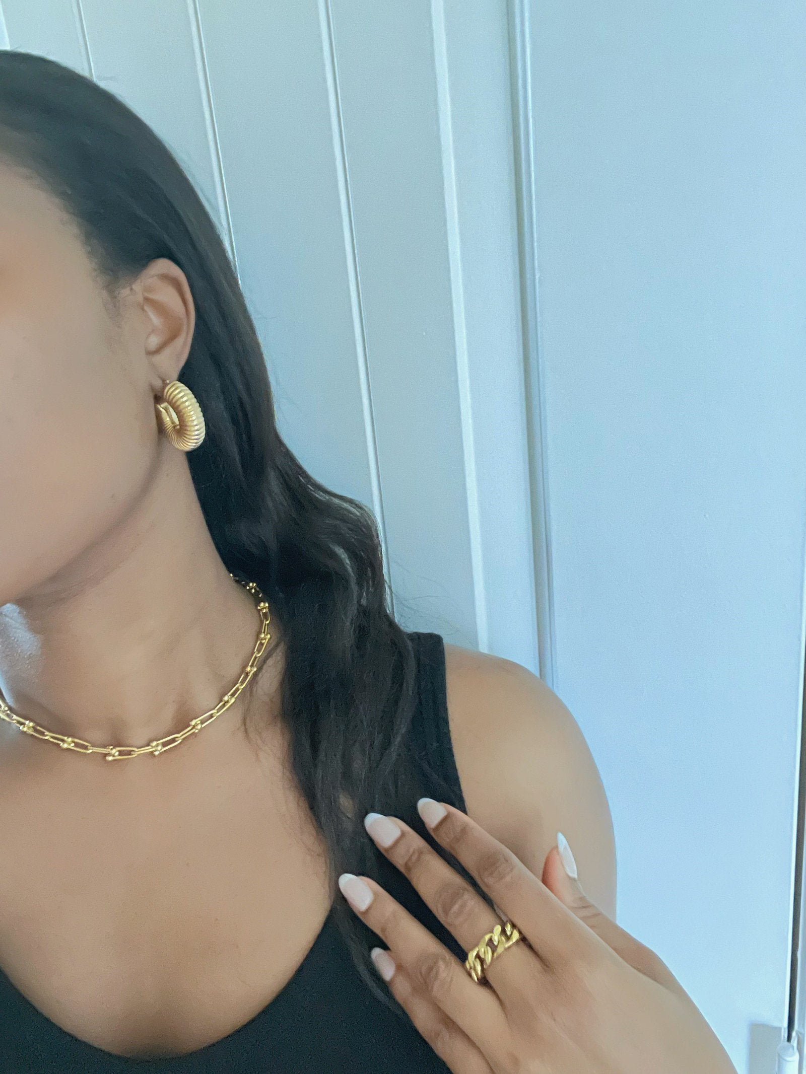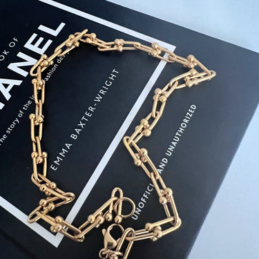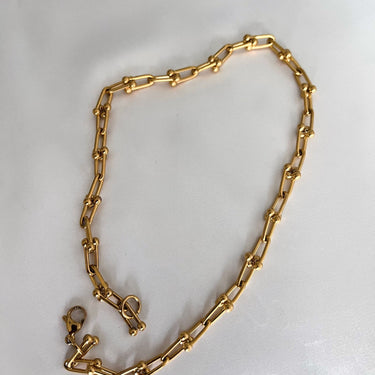 Featuring a chain with guage links capturing an urban edge, making a stunning statement. This chain necklace is a statement maker that matches well with your essentials. You can wear alone or add to your neck stack. She will not only keep your style trendy, but also have you looking like a million bucks.