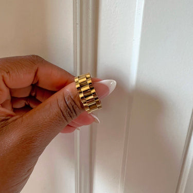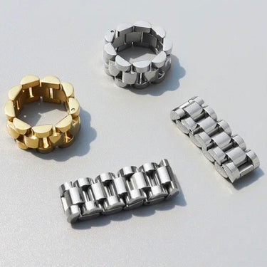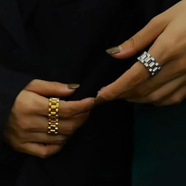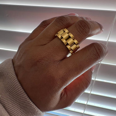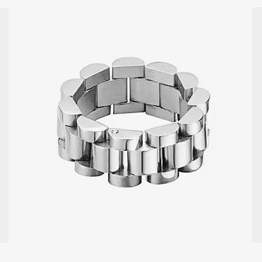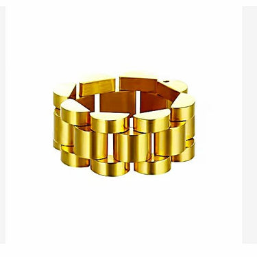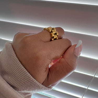 Make a bold statement with the Chain Link Ring, a stylish piece that blends edgy design with timeless elegance. Featuring an intricate chain link pattern, this ring is crafted from high-quality stainless steel and available both in 18k gold-plated and polished silver finishes. Built to withstand daily wear, it is rust-proof, tarnish-resistant, and waterproof, ensuring lasting shine and durability. Hypoallergenic and gentle on the skin, the Chain Link Ring is perfect for those looking to add a modern touch to their jewelry collection. Wear it solo for a minimalist vibe or stack it for an elevated, layered look.