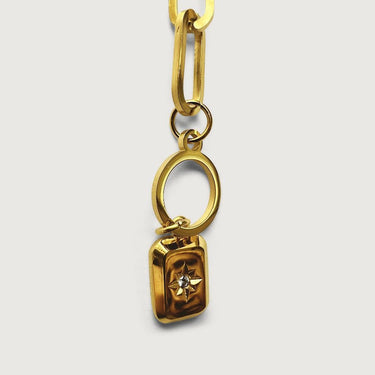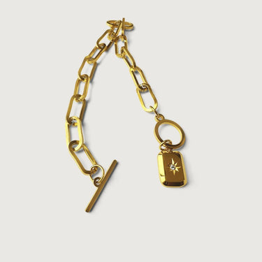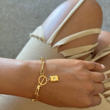 Inspired by the iconic paperclip with paved diamond silhouette on a geometric tag, this sleek and adjustable bracelet is crafted with 18K gold plated on titanium steel to give you the look and feel of solid gold jewelry without the price tag. Bracelet fastens with a toggle. This bracelet is an instant classic with endless styling as you can add to your wrist stack or wear alone.