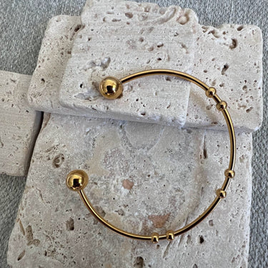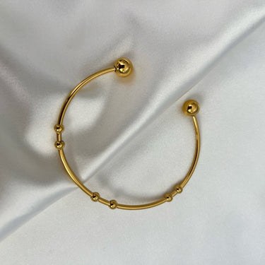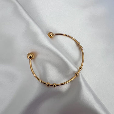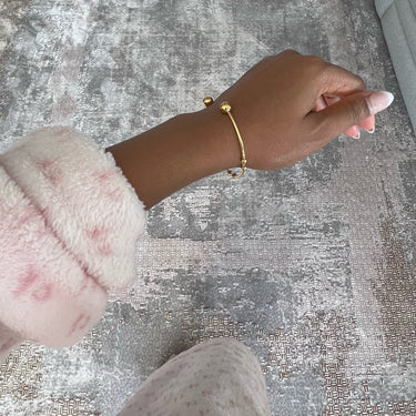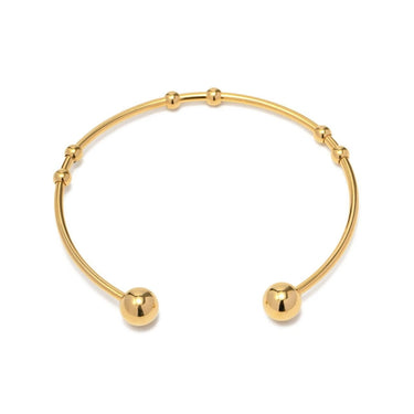 These feminine and sophisticated bracelet features gold plated stainless steel beads joined by short rods of 18k gold plated rods. The elemental shapes of this bracelet embody the simplicity of modern sophistication. Add this to your wrist stack or wear alone. You can pair this bracelet up with our Glaring Bead Long Dangle Drop Earrings for a statement style.