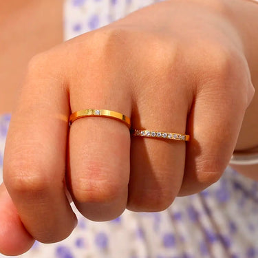 Crafted from durable stainless steel with a luxurious 18K gold plating, this ring is both waterproof and tarnish-resistant, ideal for everyday wear. The subtle band design allows the central zircon to take center stage, catching the light beautifully and adding a hint of sparkle to any outfit. Whether worn alone or stacked with other favorites, the Slim Solitaire Ring offers timeless elegance for every occasion.