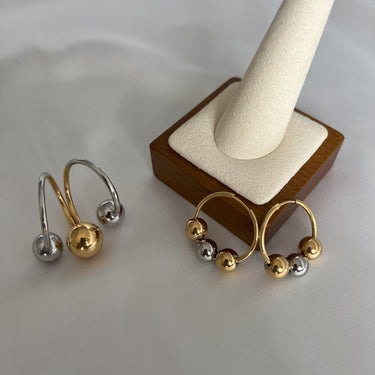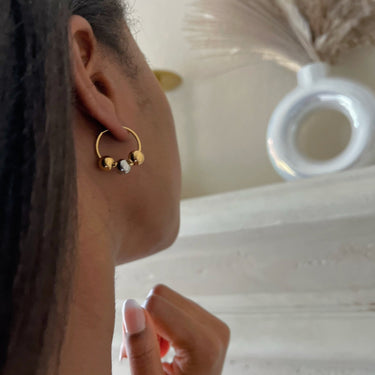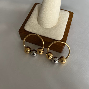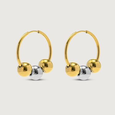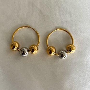 Make a heartfelt statement with these exclusively designed earrings. Design features two-tone stainless steel hoop earrings adorned with stationed beads boasted from the luster of 18k gold plating. Go sleek and sophisticated whether you wear it alone or add to your stacking game. Earrings are held in place by post backs.