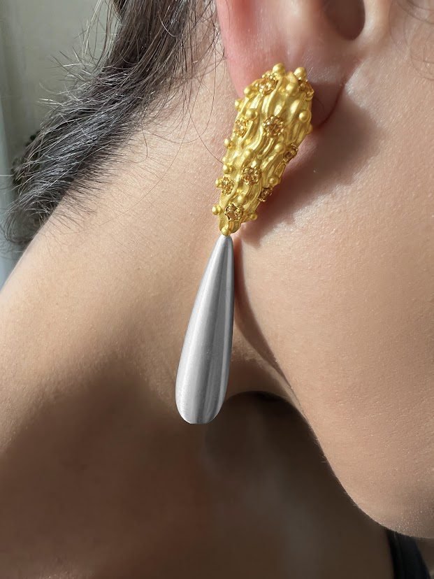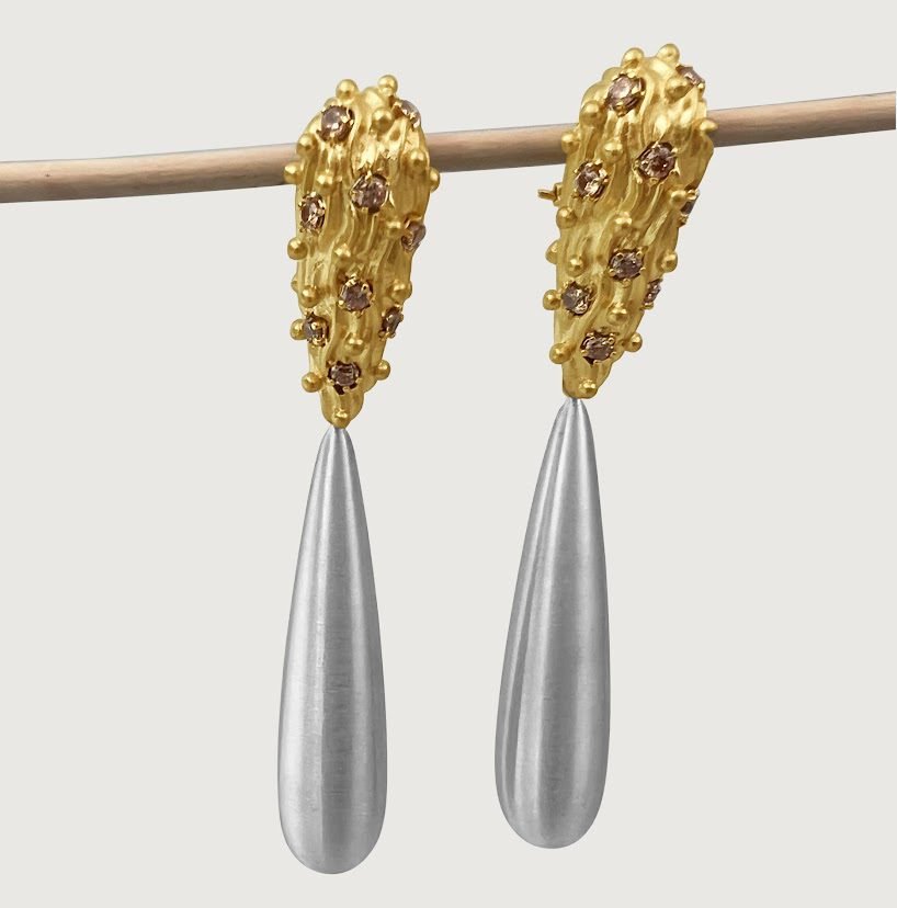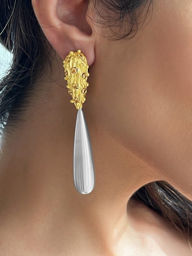 This one-of-a kind stunning drop earrings will speak glam, royalty and luxury about your style making you feel gorgeous. Designed from two tones of 18k gold -yellow gold & white gold with rose gold silhouette paved diamonds. Earring secures with a latch back. Simple care will help you retain and protect your jewelry for many years to come.