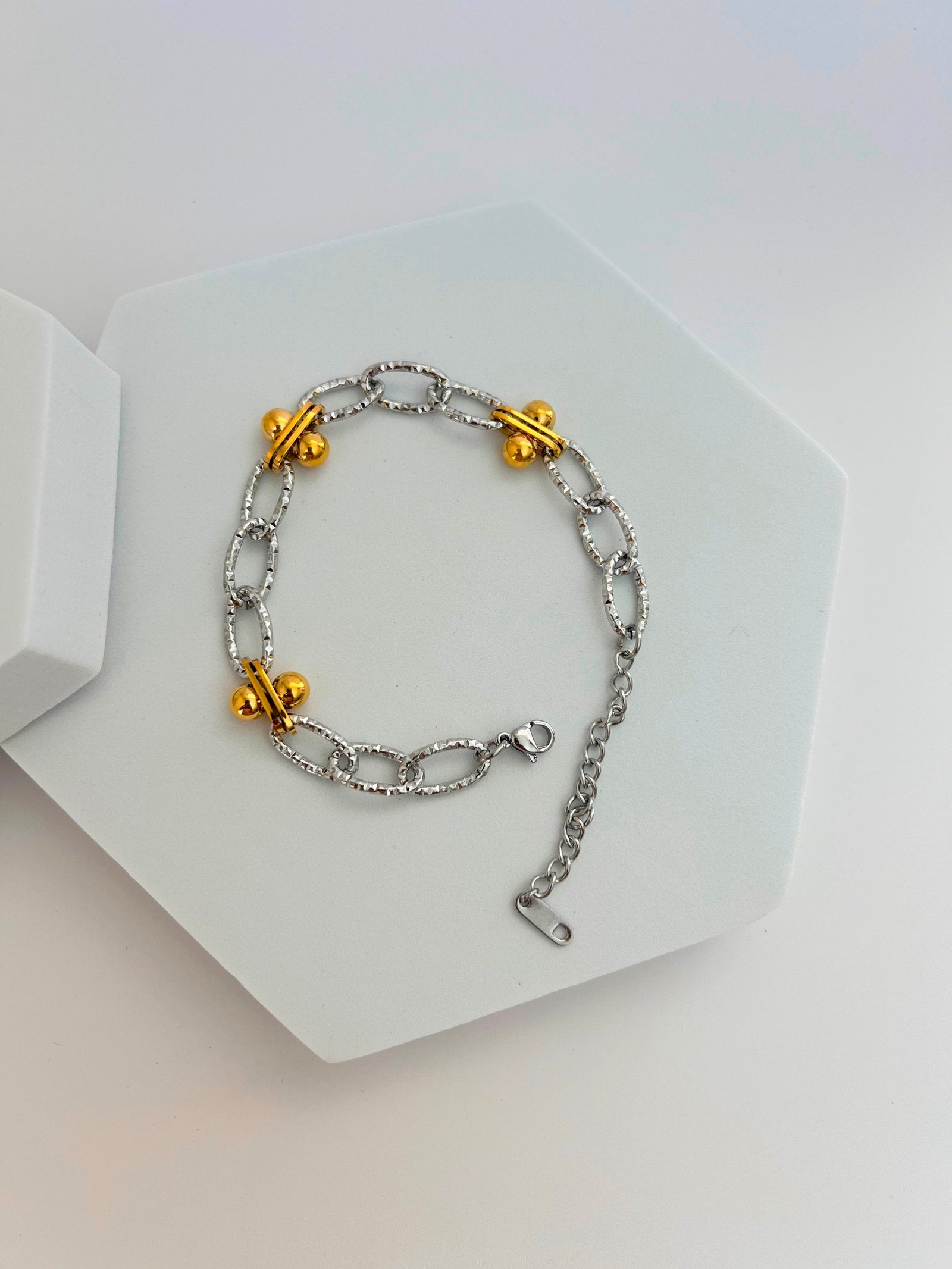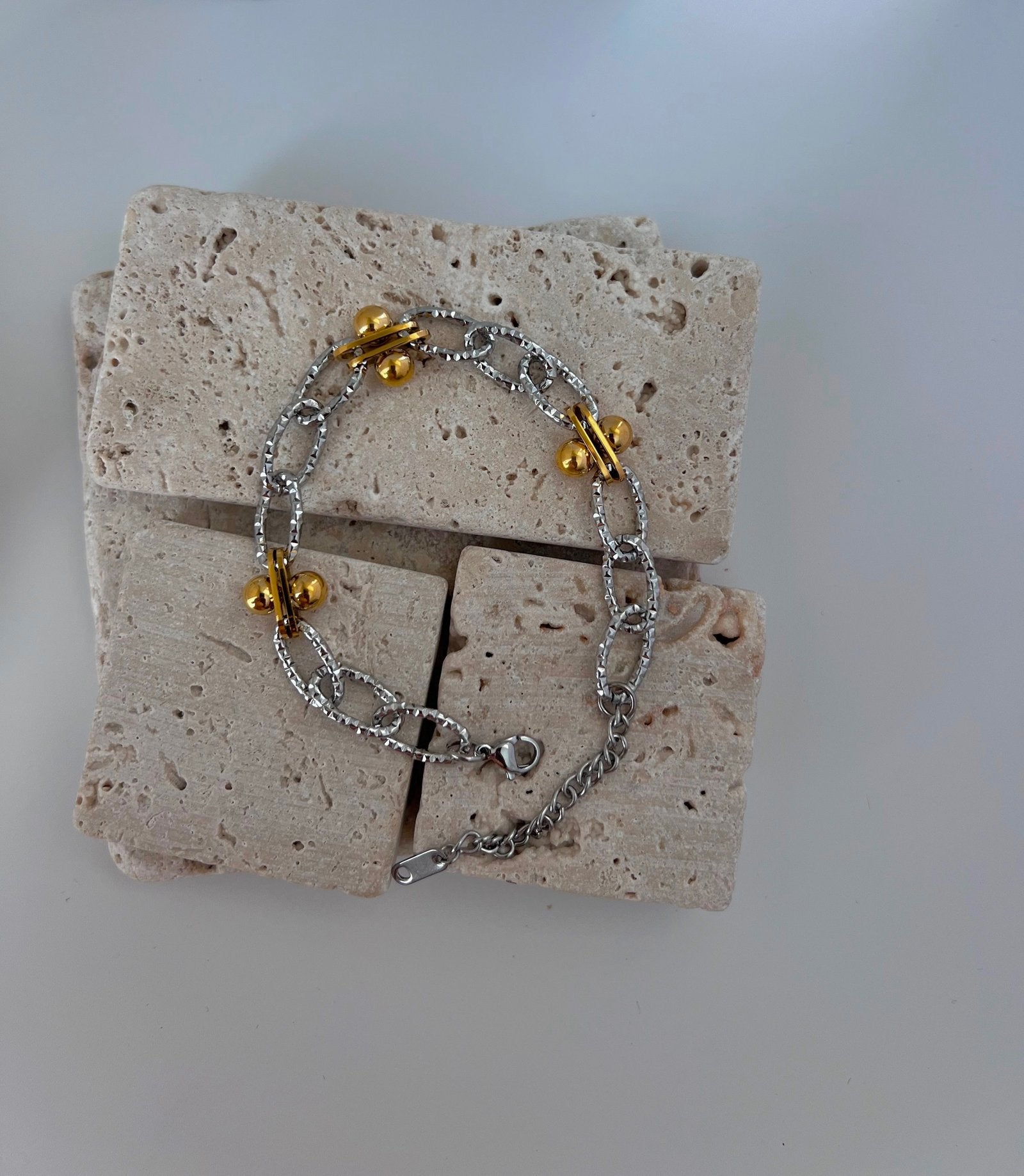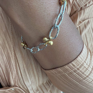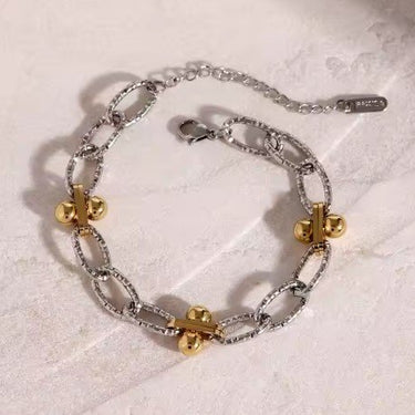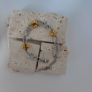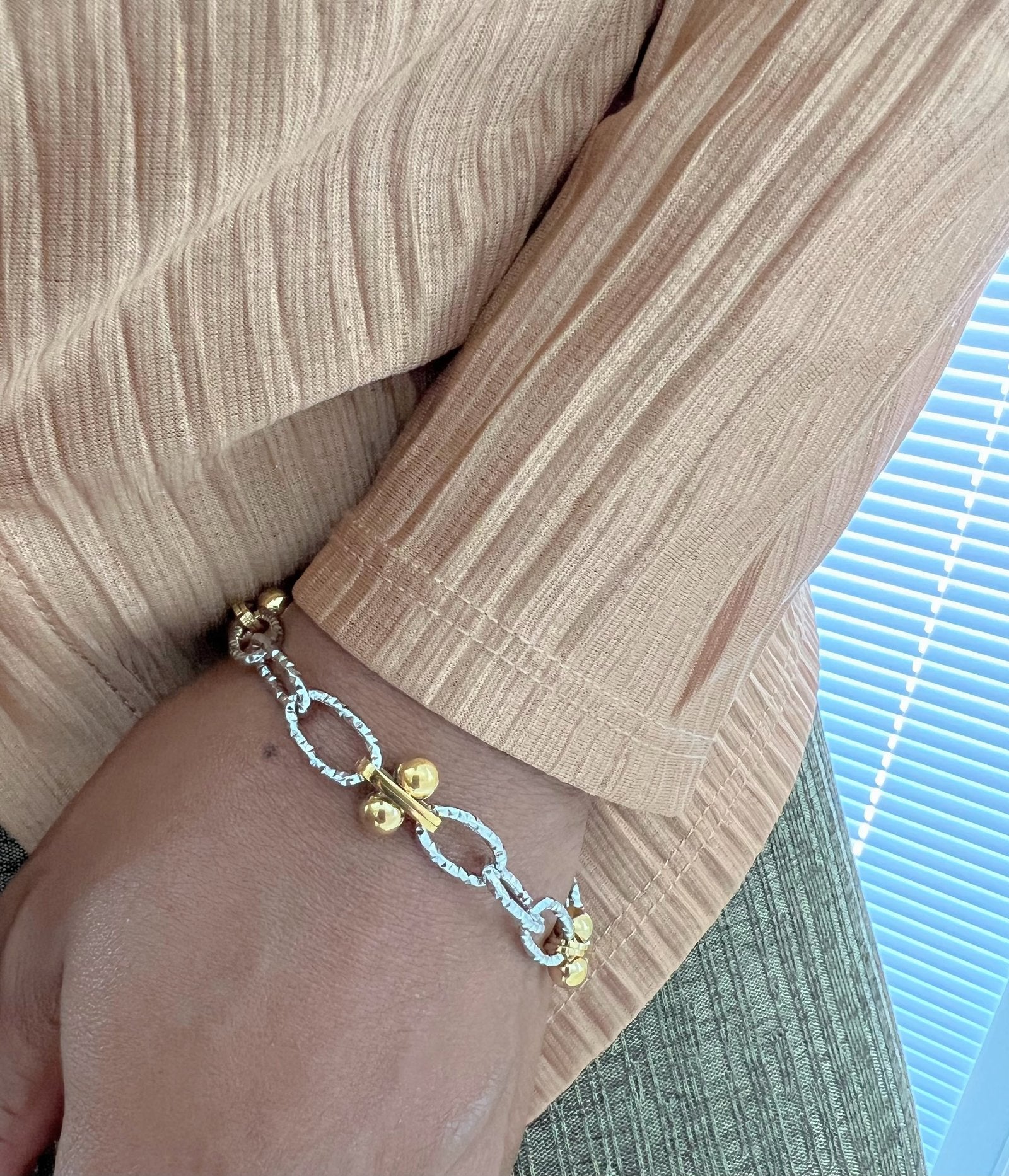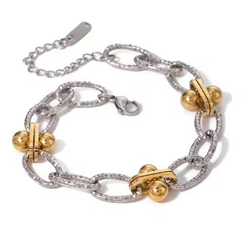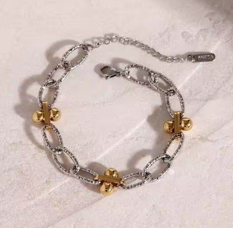 Elevate your accessory game with this stunning Astrid Two-Tone Round Bead Bracelet. Crafted from premium stainless steel and plated with radiant 18K gold, this bracelet showcases a sophisticated two-tone design that effortlessly blends elegance and modern style. Each bead is meticulously handmade, giving the piece a high-end, artisanal quality that sets it apart from ordinary jewelry.