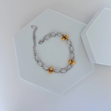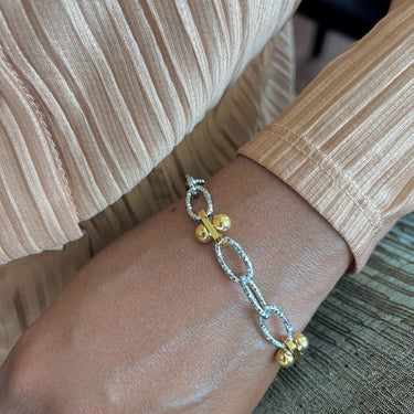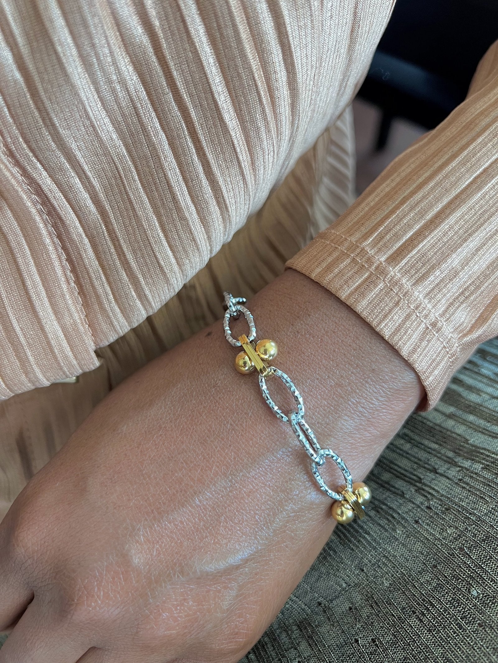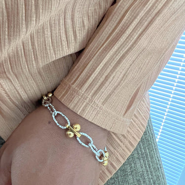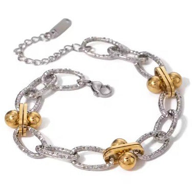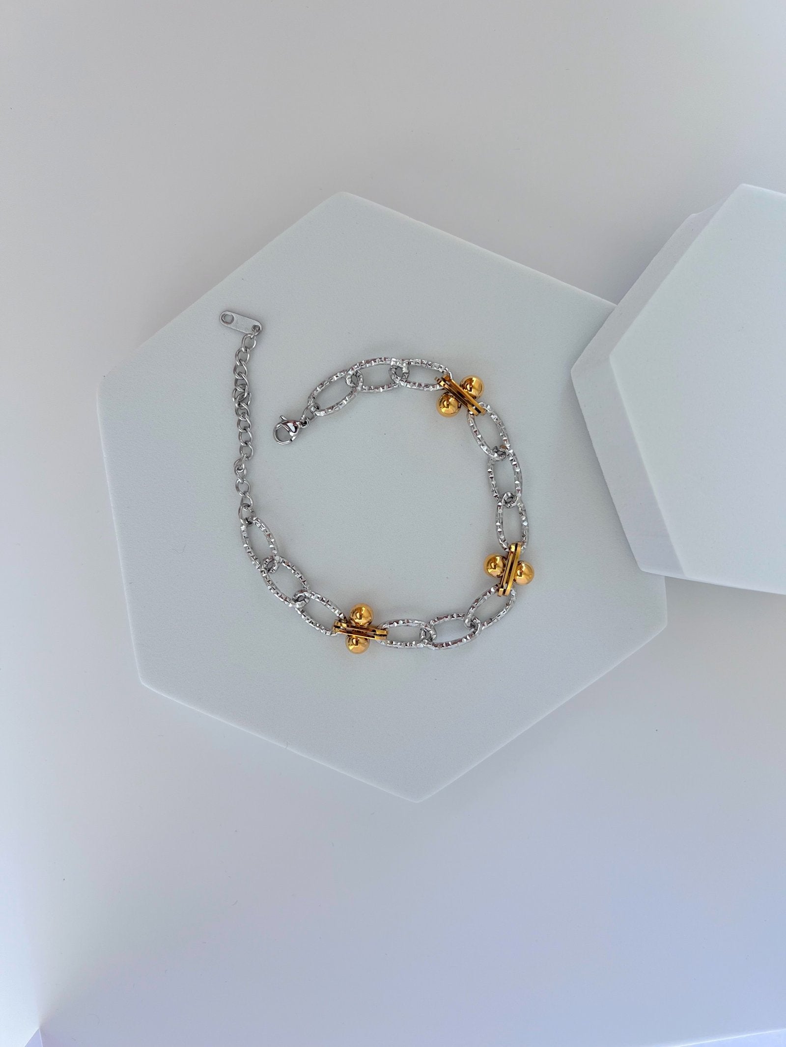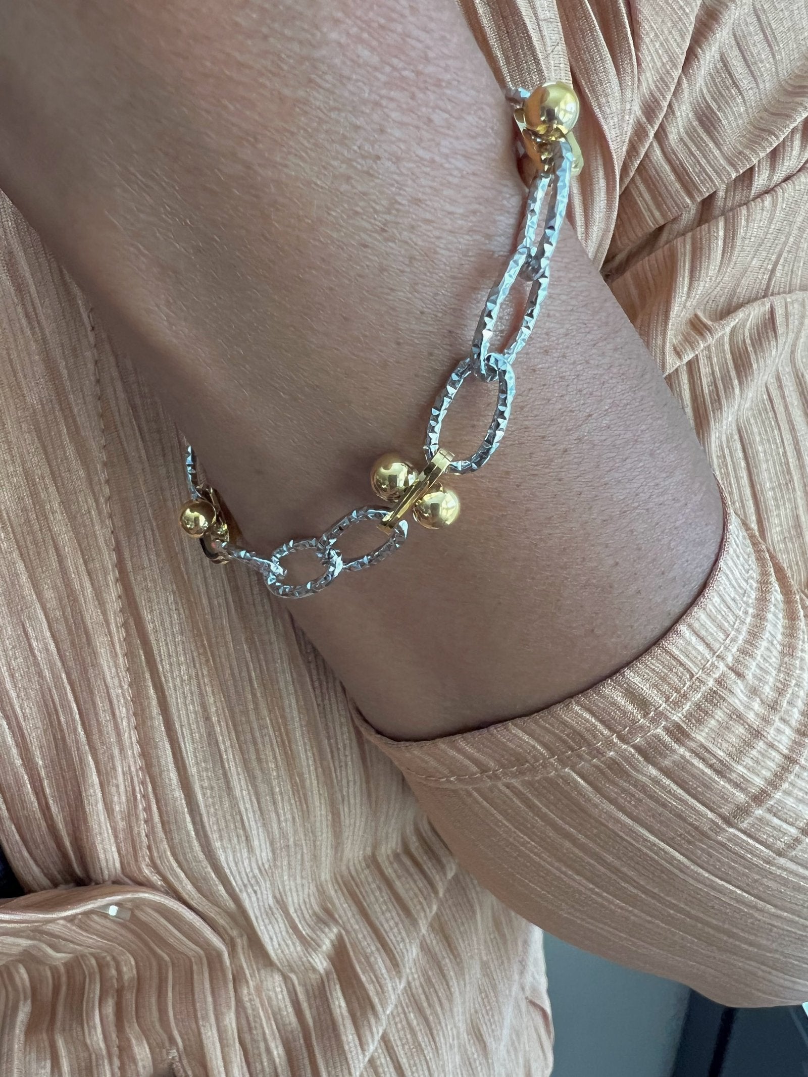 Elevate your accessory game with this stunning Astrid Two-Tone Round Bead Bracelet. Crafted from premium stainless steel and plated with radiant 18K gold, this bracelet showcases a sophisticated two-tone design that effortlessly blends elegance and modern style. Each bead is meticulously handmade, giving the piece a high-end, artisanal quality that sets it apart from ordinary jewelry.