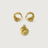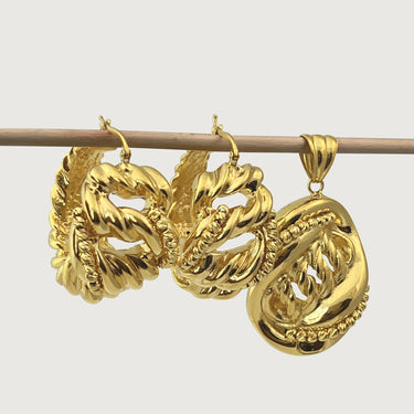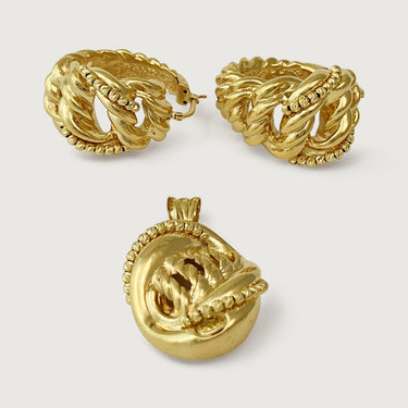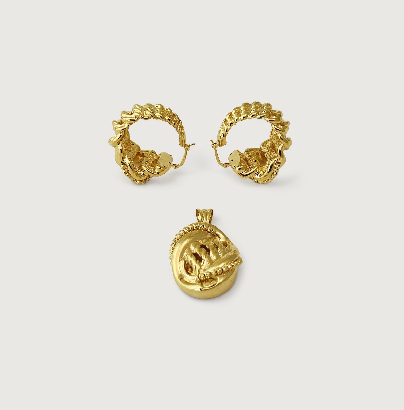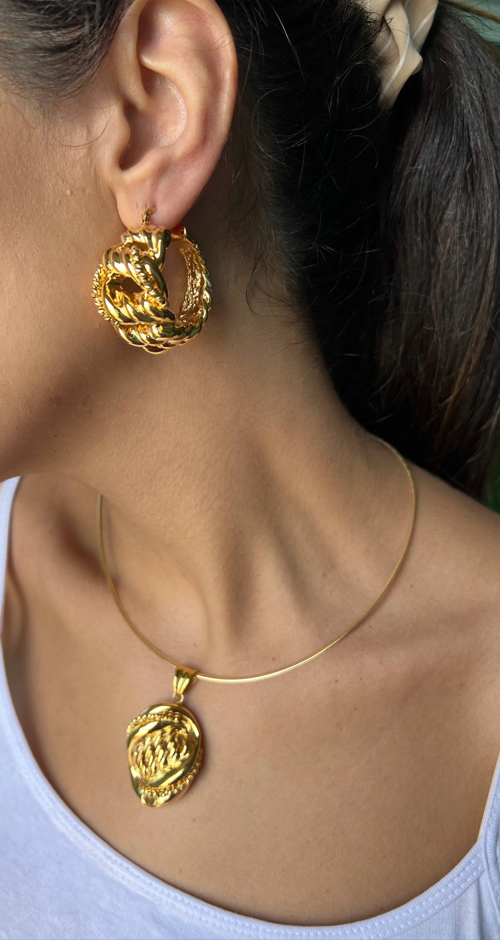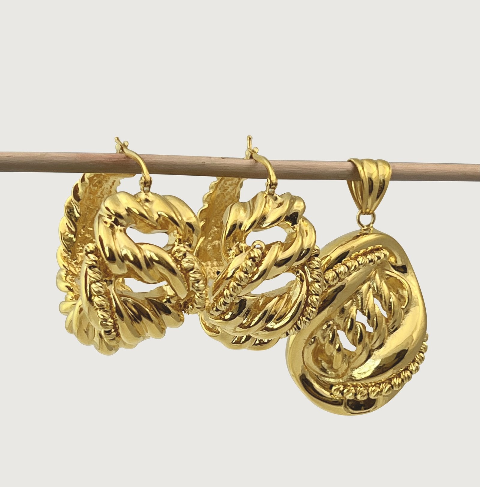 This huggie hoop earring and pendant set, one of our bold gold collections, features creativity in design, with 18 k solid gold woven, twisted and adorned with lustrous beads to add sophistication to your style. The beauty and shine of this jewelry set can’t go unnoticed. Chain NOT included in set. Images may be enlarged to show jewelry details. Please see product description for product dimensions.