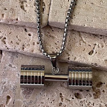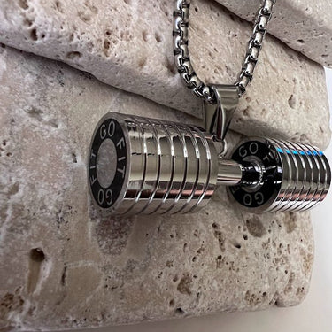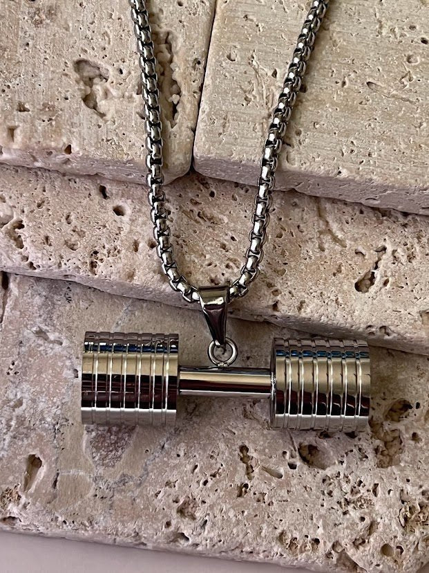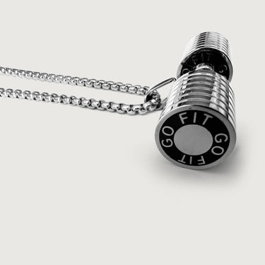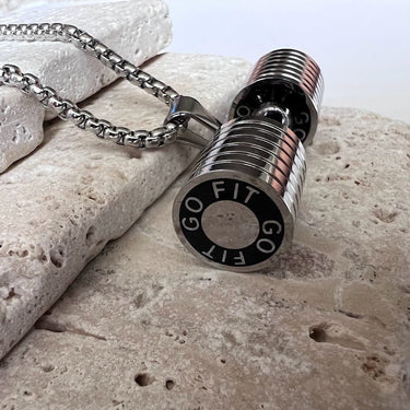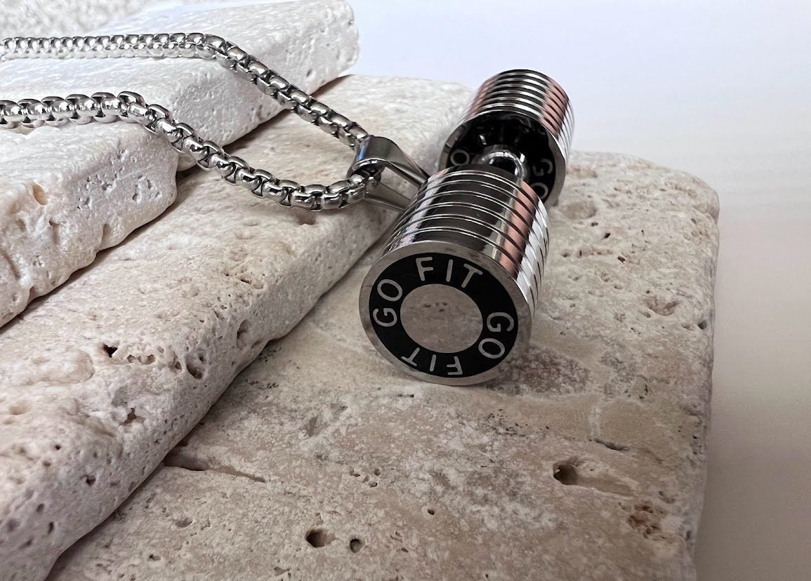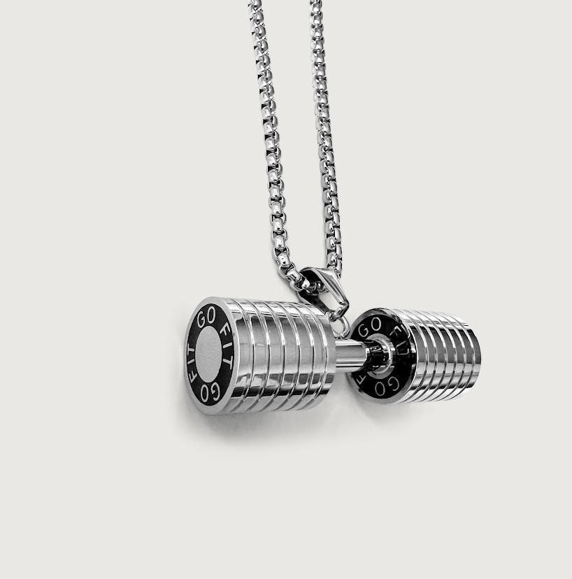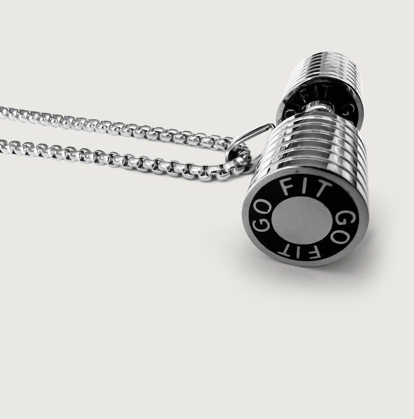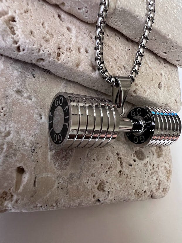 Design seamlessly blends function and style in this motivational chain necklace. Features a dumbbell design and symbolizes strength, style, and endurance while being a constant reminder to “Go fit” but in style. A statement piece that makes your style stand out.