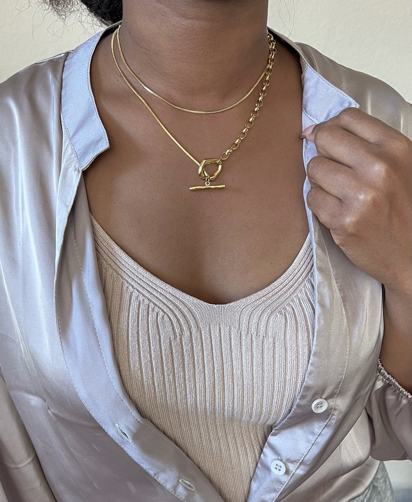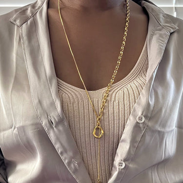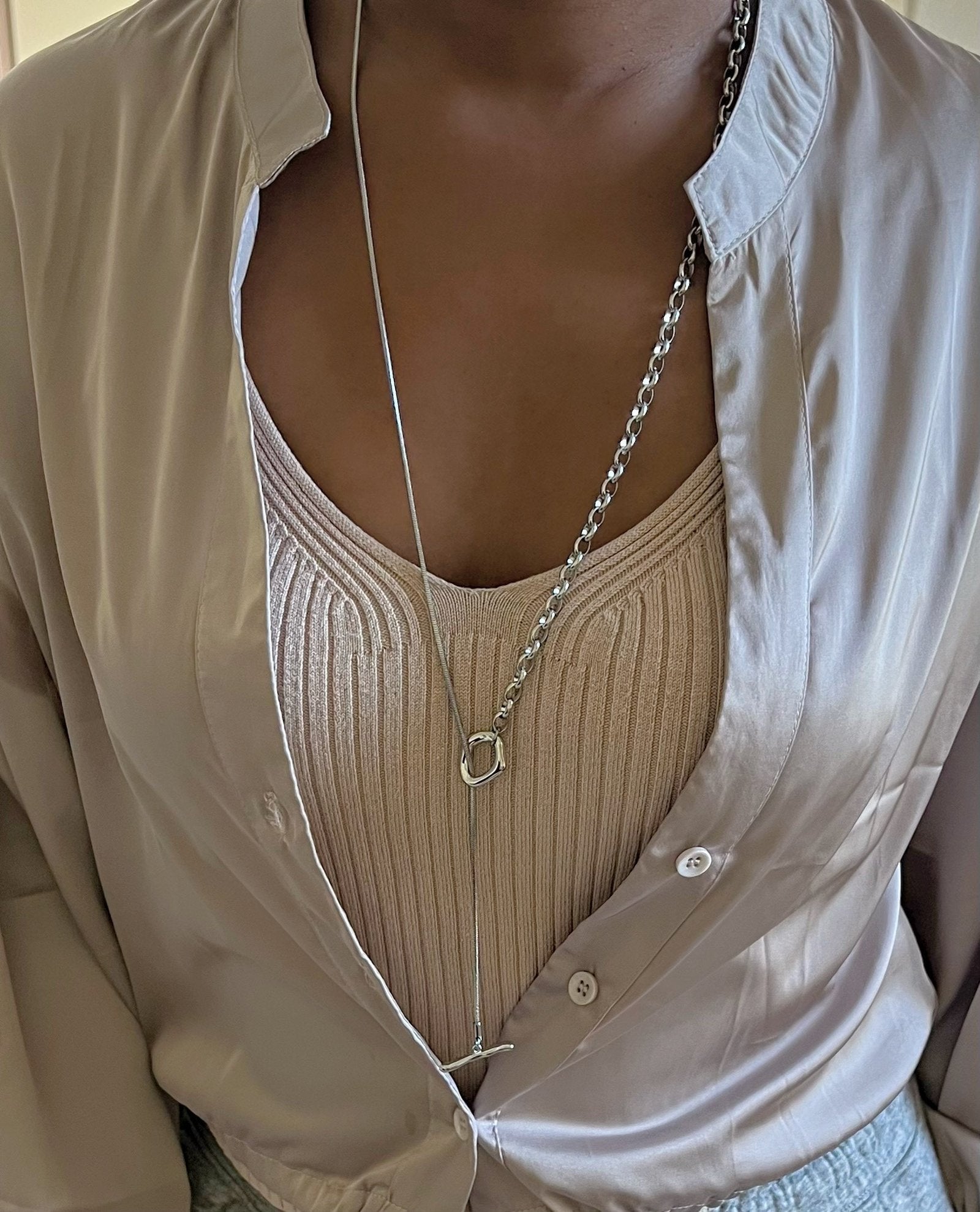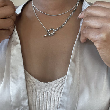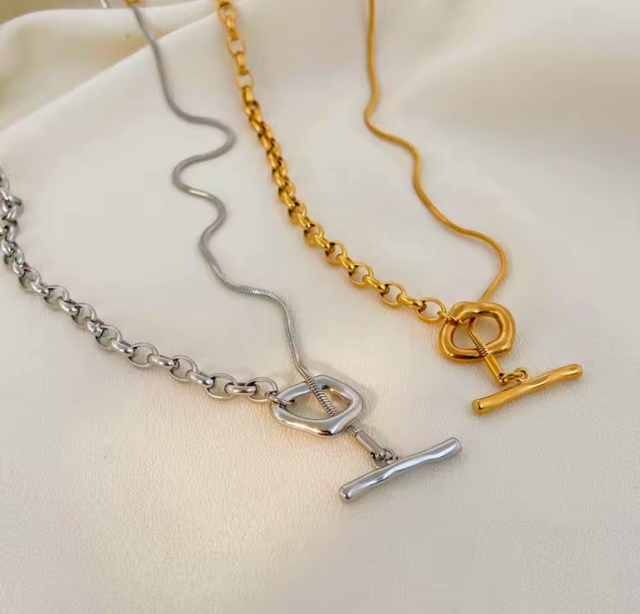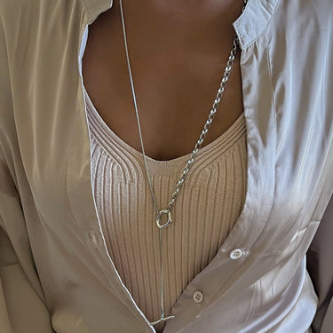 Meet the Elna Long Chain Necklace – a striking double-layered piece designed to bring balance and elegance to any look. This unique necklace features two contrasting chain styles: one side with bold, eye-catching links and the other with a smooth, refined strand, creating an exquisite asymmetrical design. Finished with a modern toggle lock, the Elna Dual Harmony is available in both 18k gold-plated and silver-plated stainless steel. Crafted for durability, it is waterproof, tarnish-resistant, and hypoallergenic, ensuring it remains radiant and gentle on the skin. Perfect for those who love a touch of modern sophistication, this necklace is a versatile accessory that elevates both casual and formal ensembles.