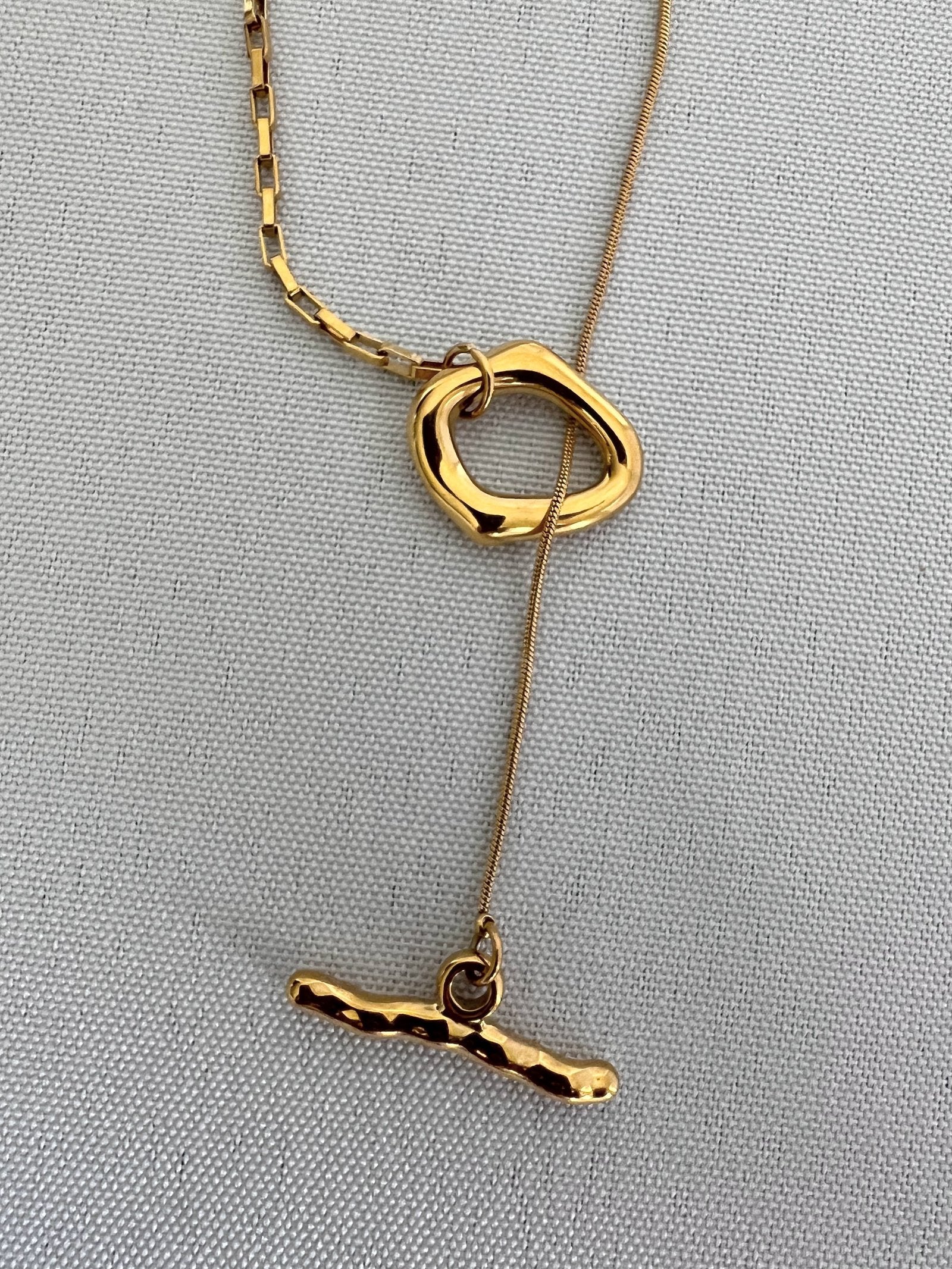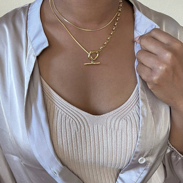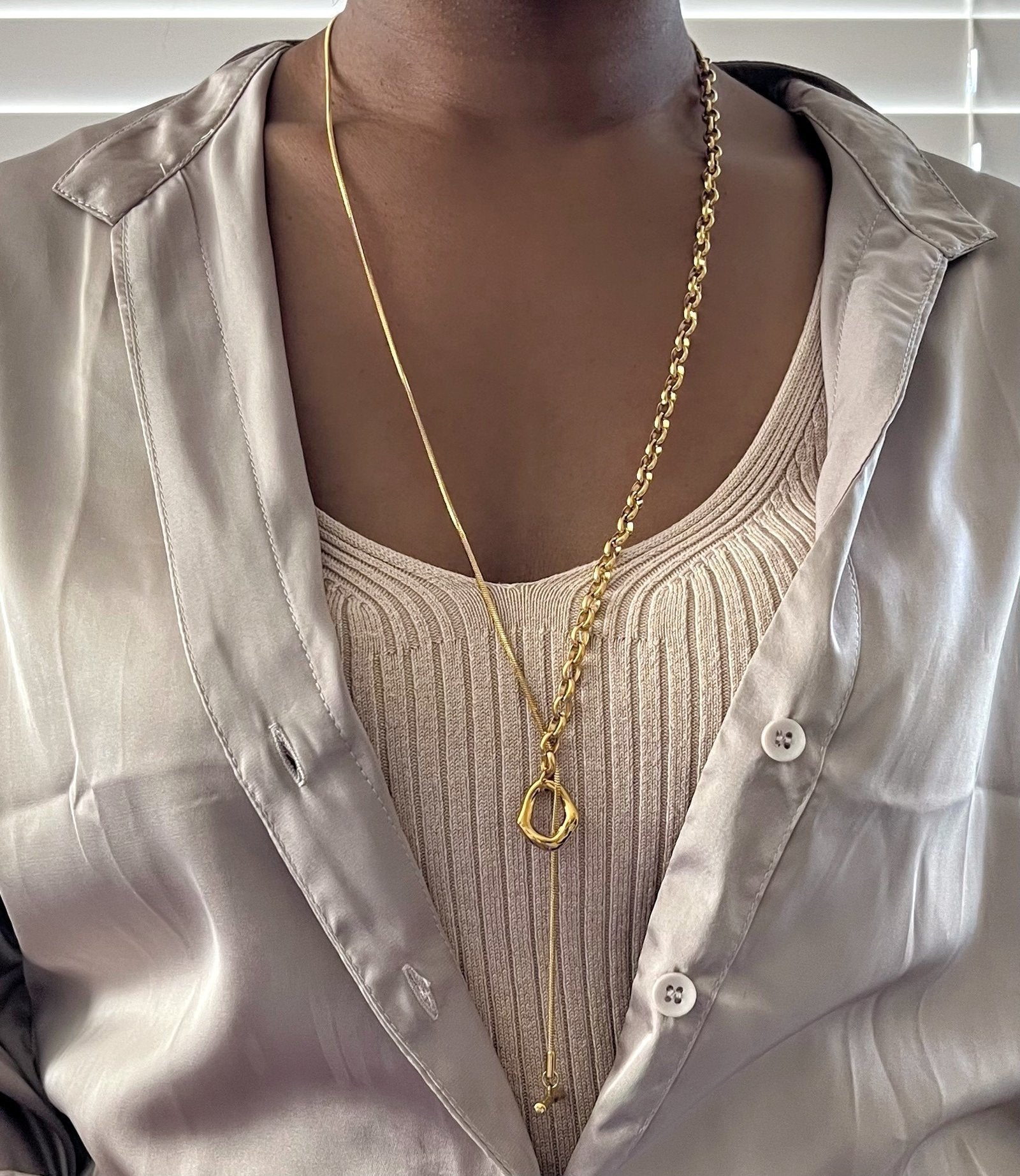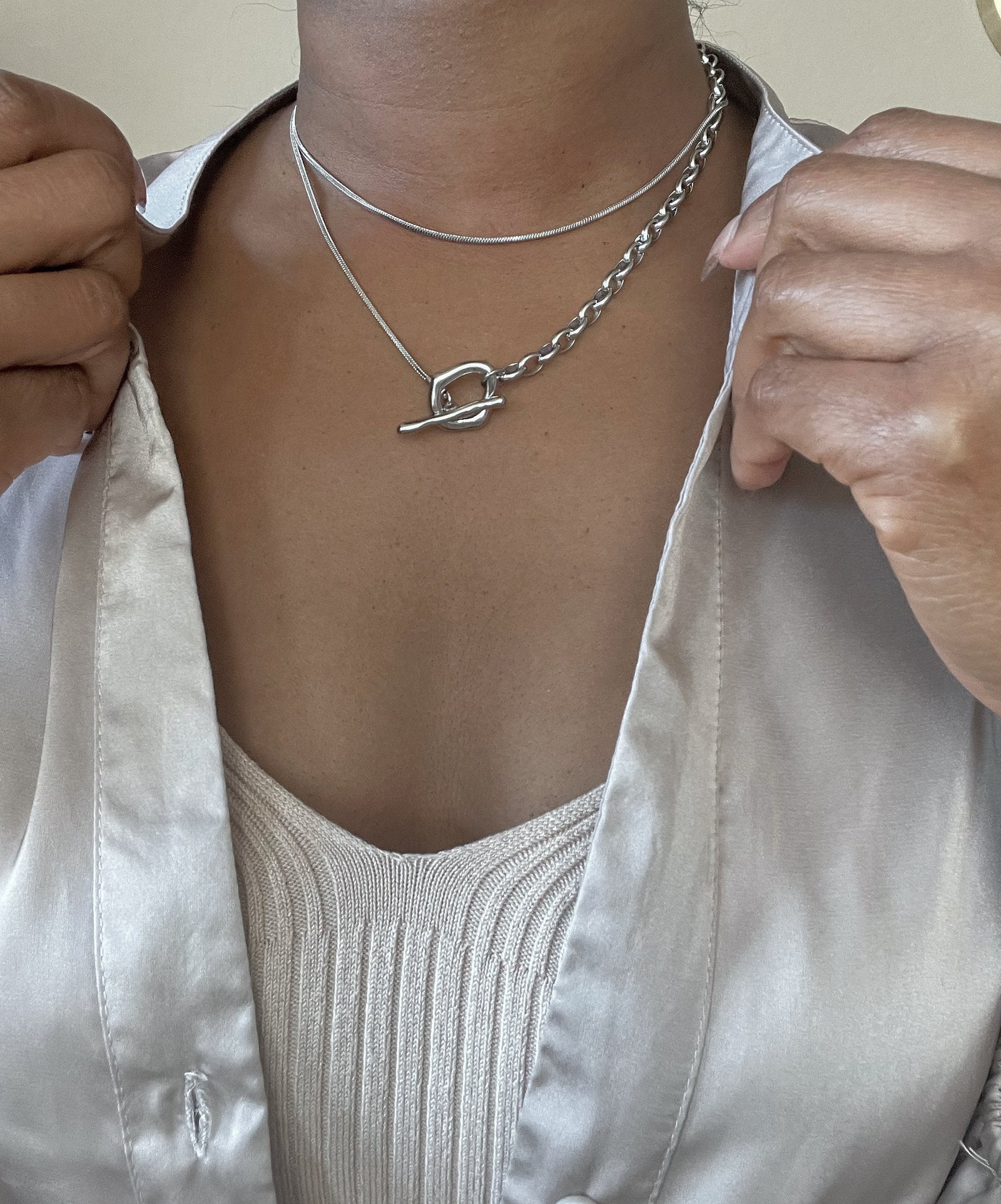 Meet the Elna Long Chain Necklace – a striking double-layered piece designed to bring balance and elegance to any look. This unique necklace features two contrasting chain styles: one side with bold, eye-catching links and the other with a smooth, refined strand, creating an exquisite asymmetrical design. Finished with a modern toggle lock, the Elna Dual Harmony is available in both 18k gold-plated and silver-plated stainless steel. Crafted for durability, it is waterproof, tarnish-resistant, and hypoallergenic, ensuring it remains radiant and gentle on the skin. Perfect for those who love a touch of modern sophistication, this necklace is a versatile accessory that elevates both casual and formal ensembles.