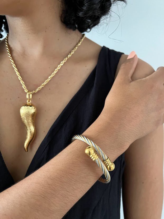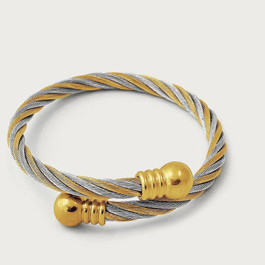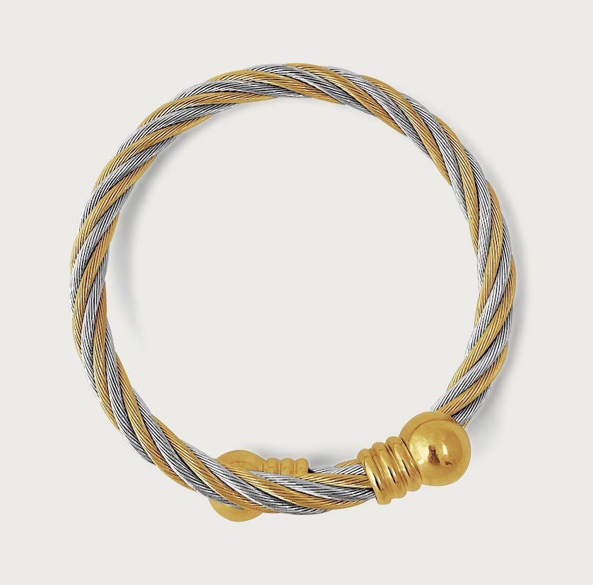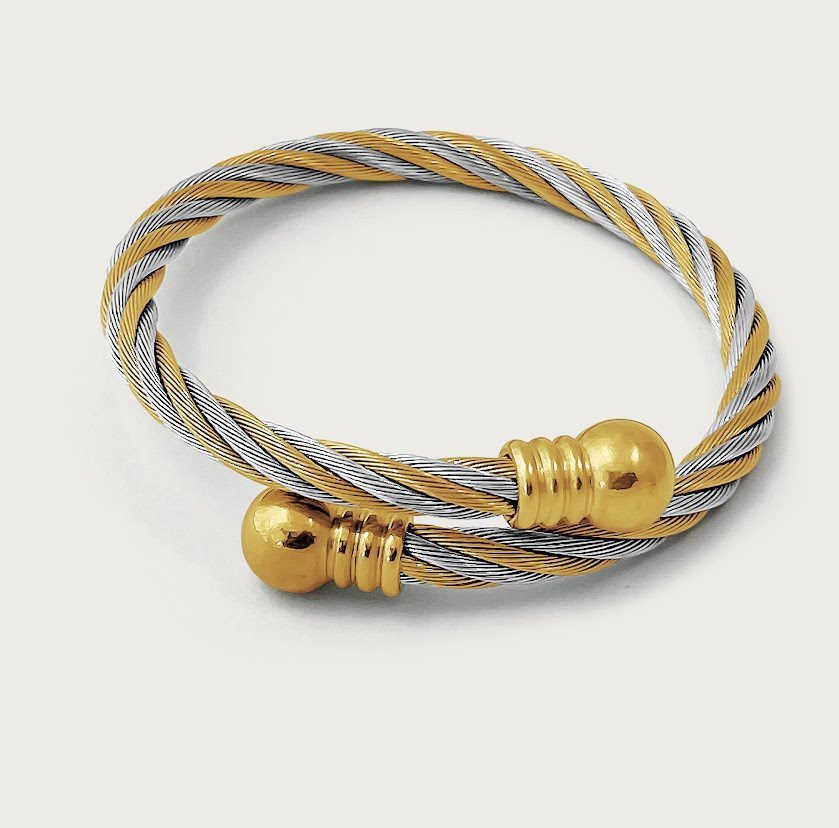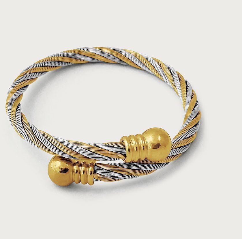 Featuring a twisted cable designer inspired bangle in two tones – silver and gold. The Eve Cuff bangle is made with the highest quality of shiny polished stainless steel and plated with 18k yellow gold. Very strong and durable. It is nickel free, won’t tarnish or corrode if properly worn. The Eve bangle can be squeezed or stretched at both open ends to adjust the size to find the best fit for your wrist, and would fit wrist sizes up to 7.5 inches.