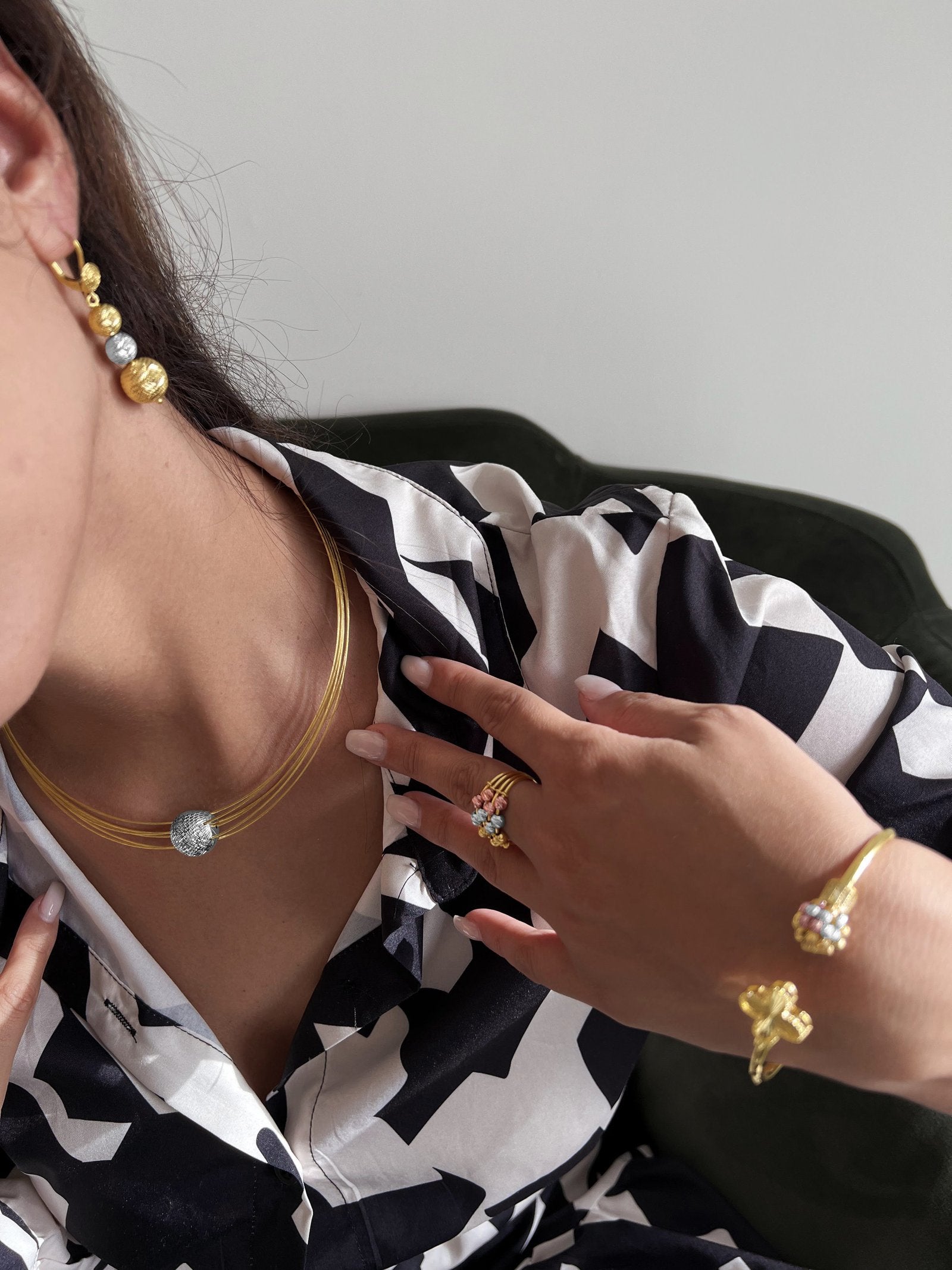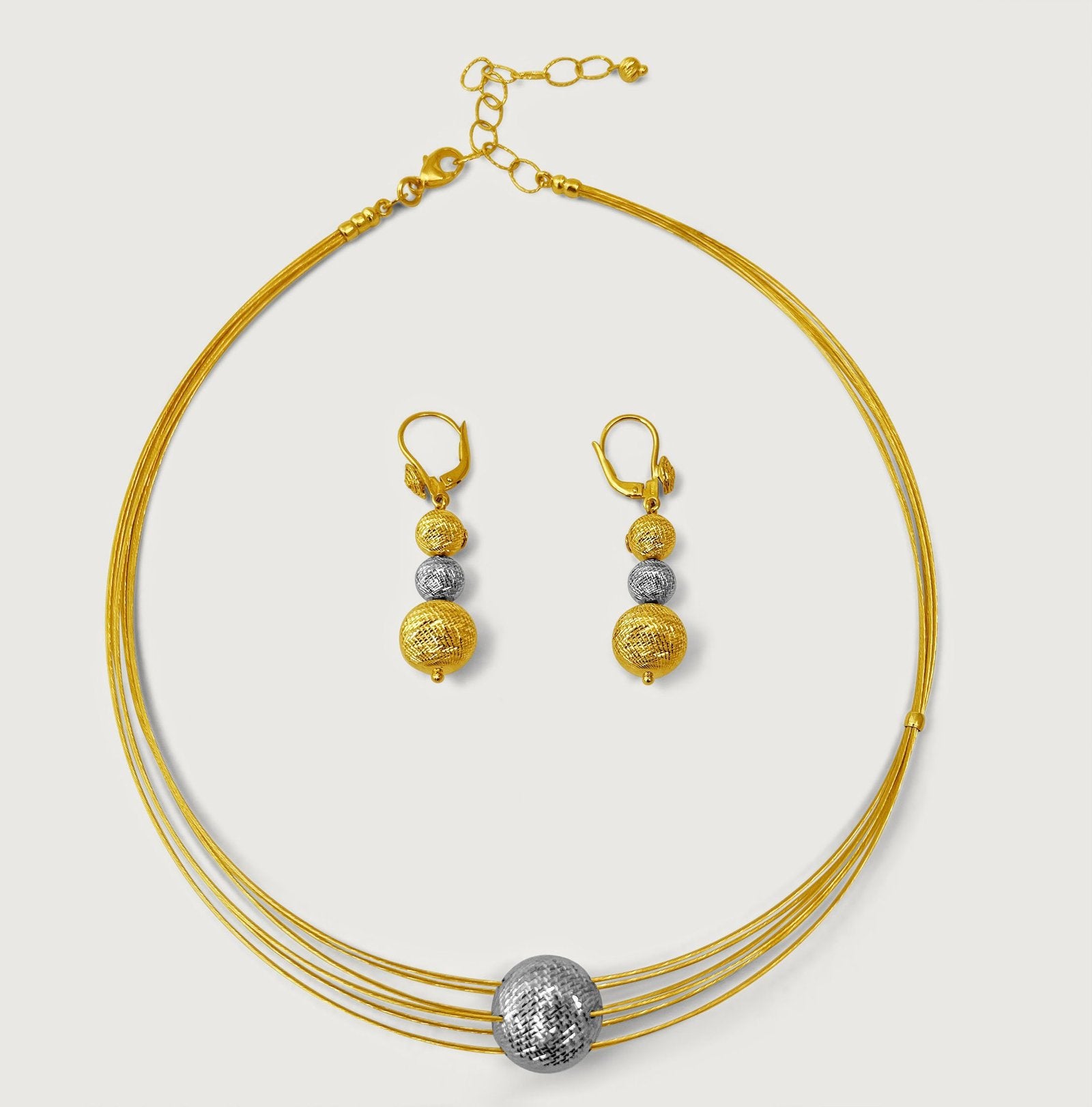 Introducing our Ophira earring and necklace set, a timeless, elegant, and uniquely designed masterpiece made to give you the look of royalty, luxury, sophistication, and boldness so you walk into that occasion in style, and with great confidence. Earrings are designed with three 18K yellow and white gold balls that glitter like crystals as it catches the light. The choker necklace is 18 inches long and can be adjusted to the shortest length of 15 inches. Its unique design has six 18k yellow gold strands that run through a 10 mm thick white gold crystal ball that glitters as it catches the light. The Ophira set is a head turner, one that makes your style steal the show and transforms any style with a statement. So, enjoy all the compliments!